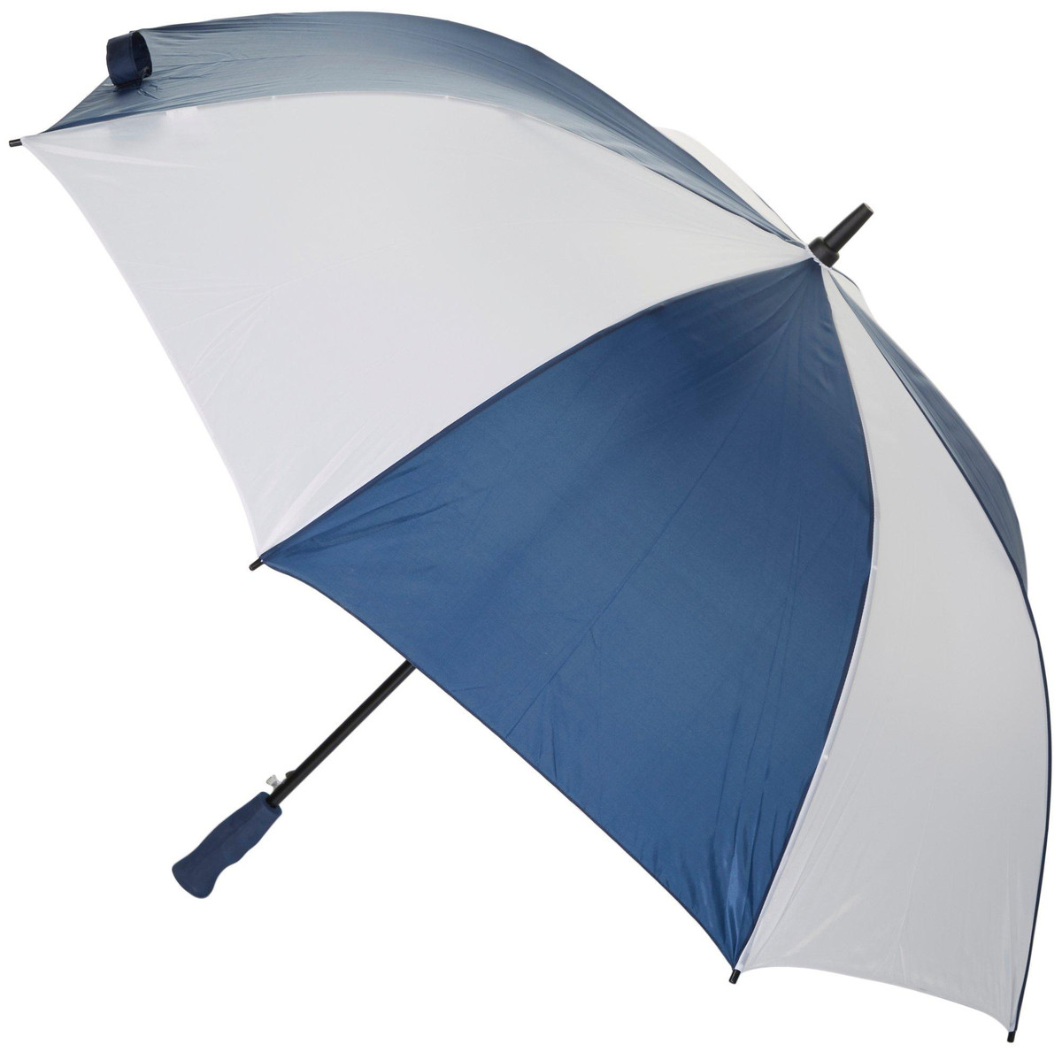 This umbrella from Shedrain features a polyester and stainless steel fabrication with a bicolor, classic golf design. Canopy arc is approximately 58 in. Weather resistant.