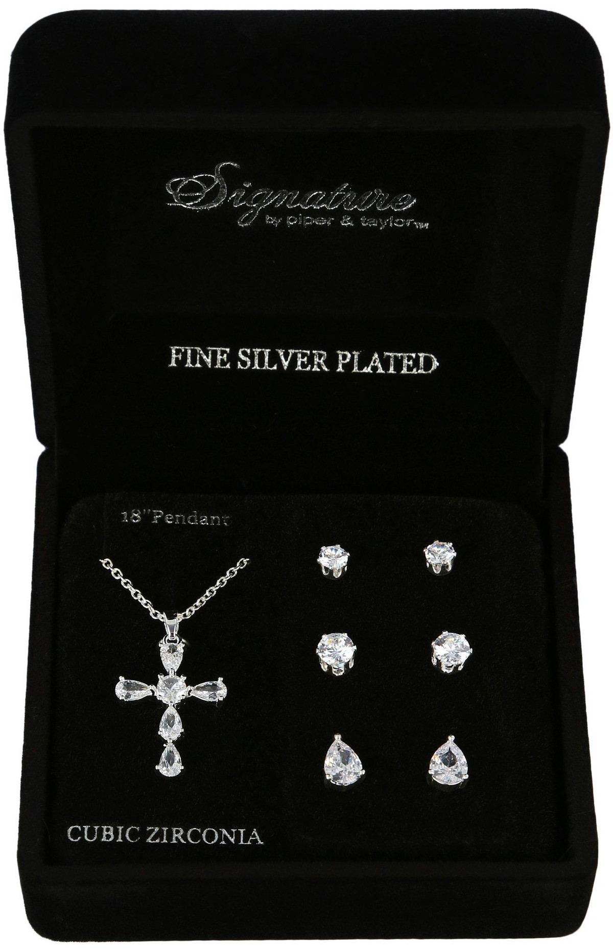 The Signature CZ Cross Necklace & 3-Pc. Earrings Set combines elegance and spiritual symbolism in one beautiful collection. The set includes a shimmering cross pendant necklace adorned with sparkling cubic zirconia stones, perfect for adding a meaningful touch to any outfit.