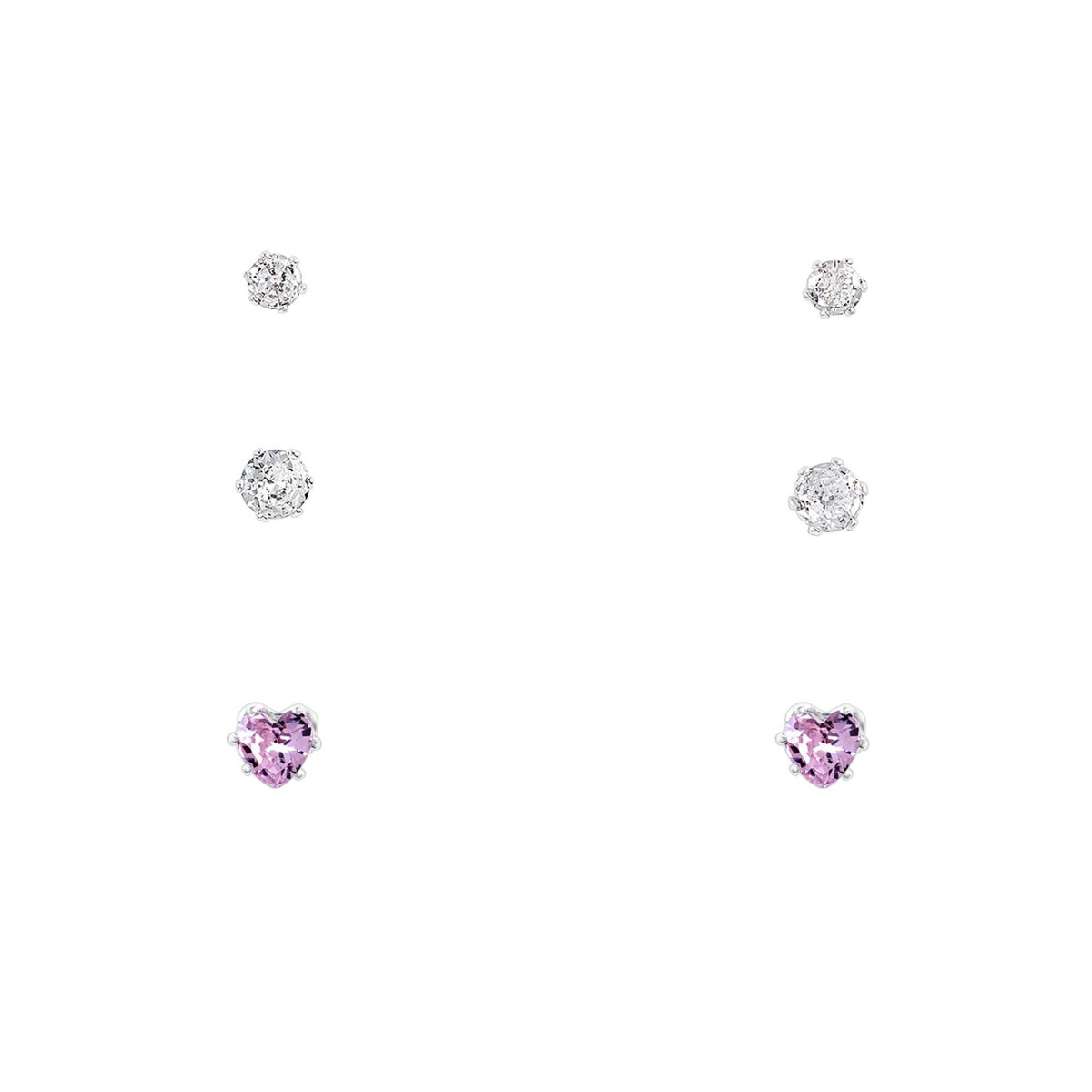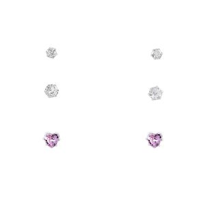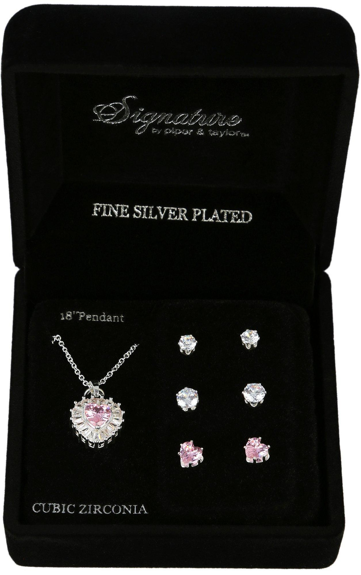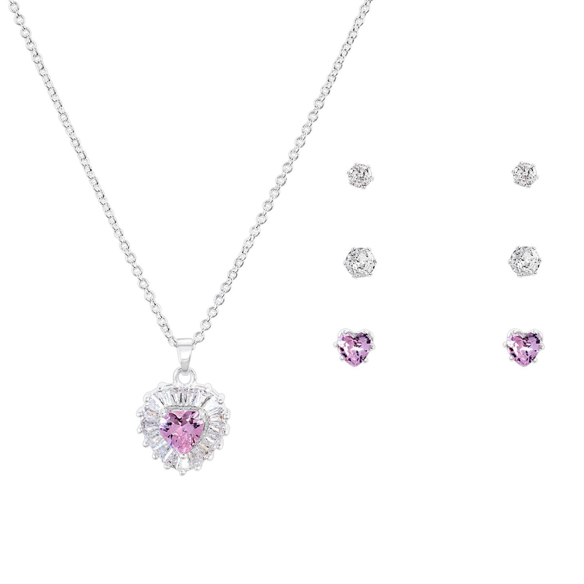 The Signature CZ Pink Heart Necklace & 3-Pc. Earrings Set features a beautiful pink heart-shaped pendant, surrounded by sparkling cubic zirconia stones. The matching earrings include a pair of classic studs, elegant hoops, and chic drop earrings, all designed to complement the necklace perfectly. This set adds a touch of romance and glamour to any outfit, making it a perfect gift or a timeless addition to your jewelry collection.