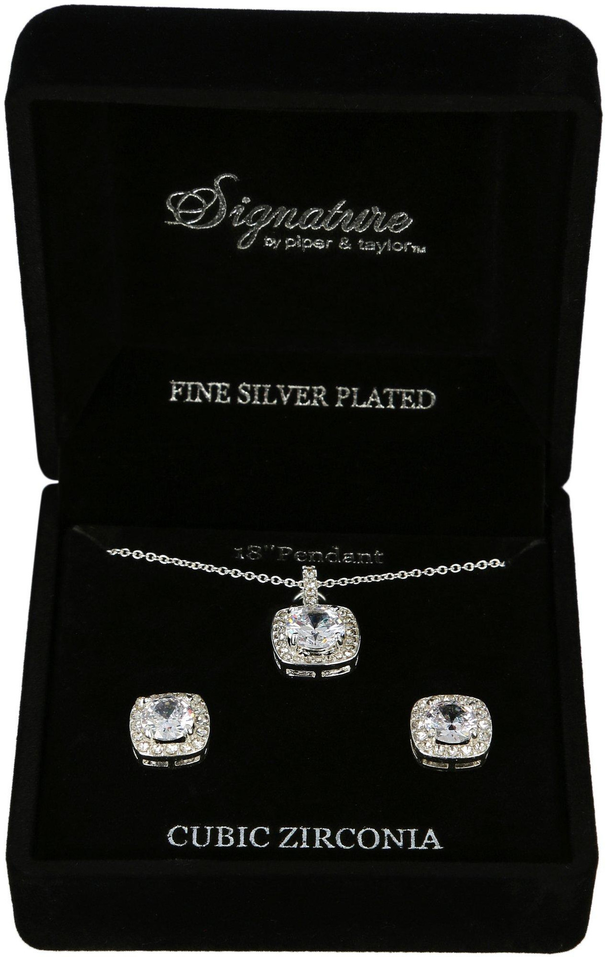 The Signature CZ Square Halo Necklace & Earrings Set features a striking square cubic zirconia pendant surrounded by a sparkling halo of CZ stones. The matching earrings complement the necklace with a similar design, adding elegant shine and sophistication. Perfect for any occasion, this set makes a timeless addition to your jewelry collection or a thoughtful gift.