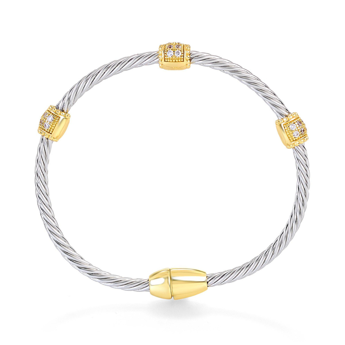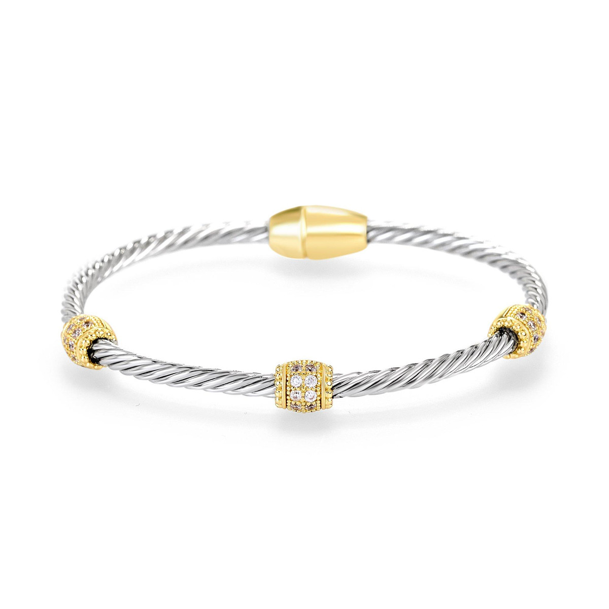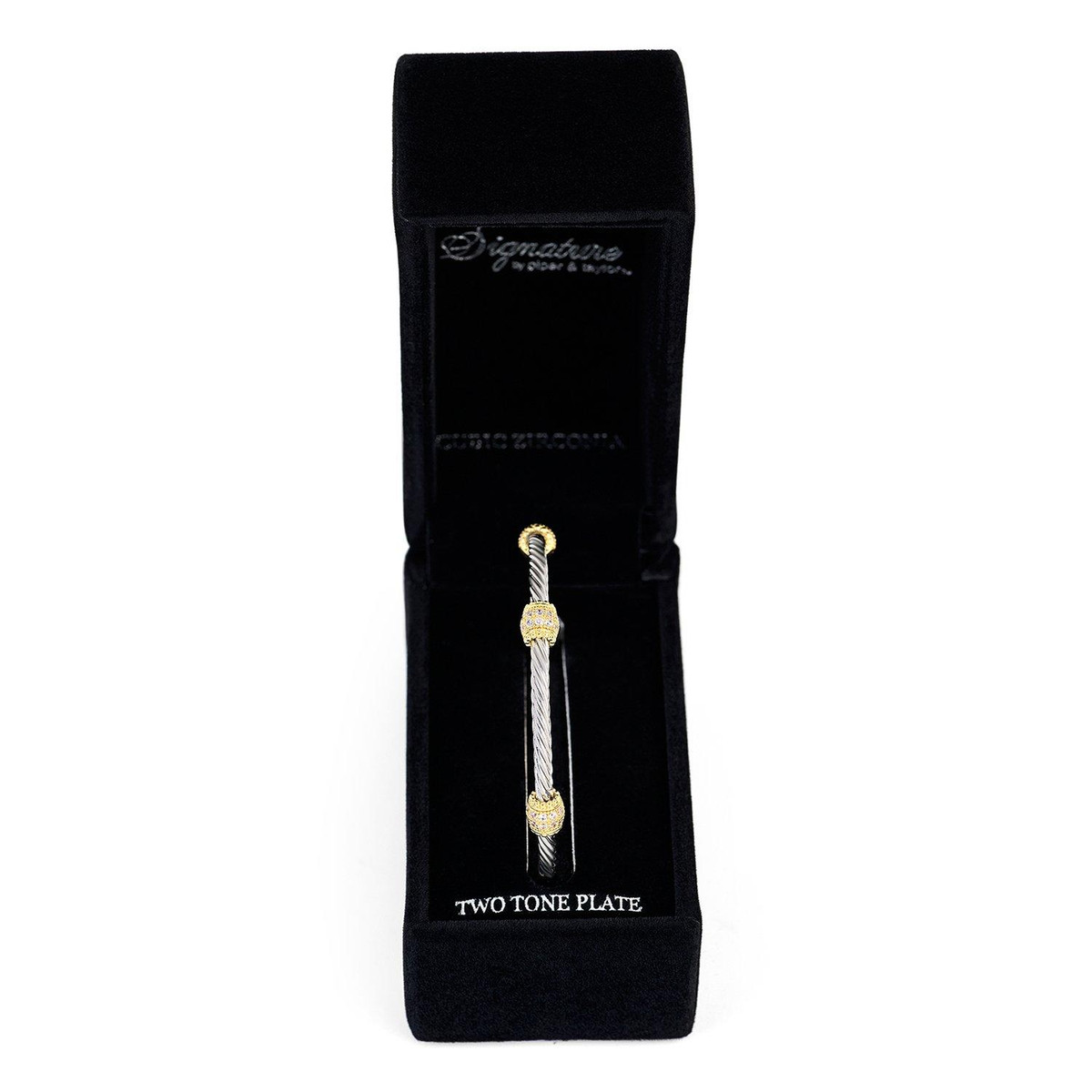 The Signature Dual Tone Yurman Bangle Bracelet features a sophisticated design inspired by the signature styles of the Yurman collection, combining two complementary metal tones for a bold, yet elegant look. With intricate detailing and a smooth finish, this bangle adds a touch of luxury and versatility to any outfit. Ideal for both everyday wear and special occasions, it offers a timeless, high-end aesthetic that pairs beautifully with other jewelry pieces.