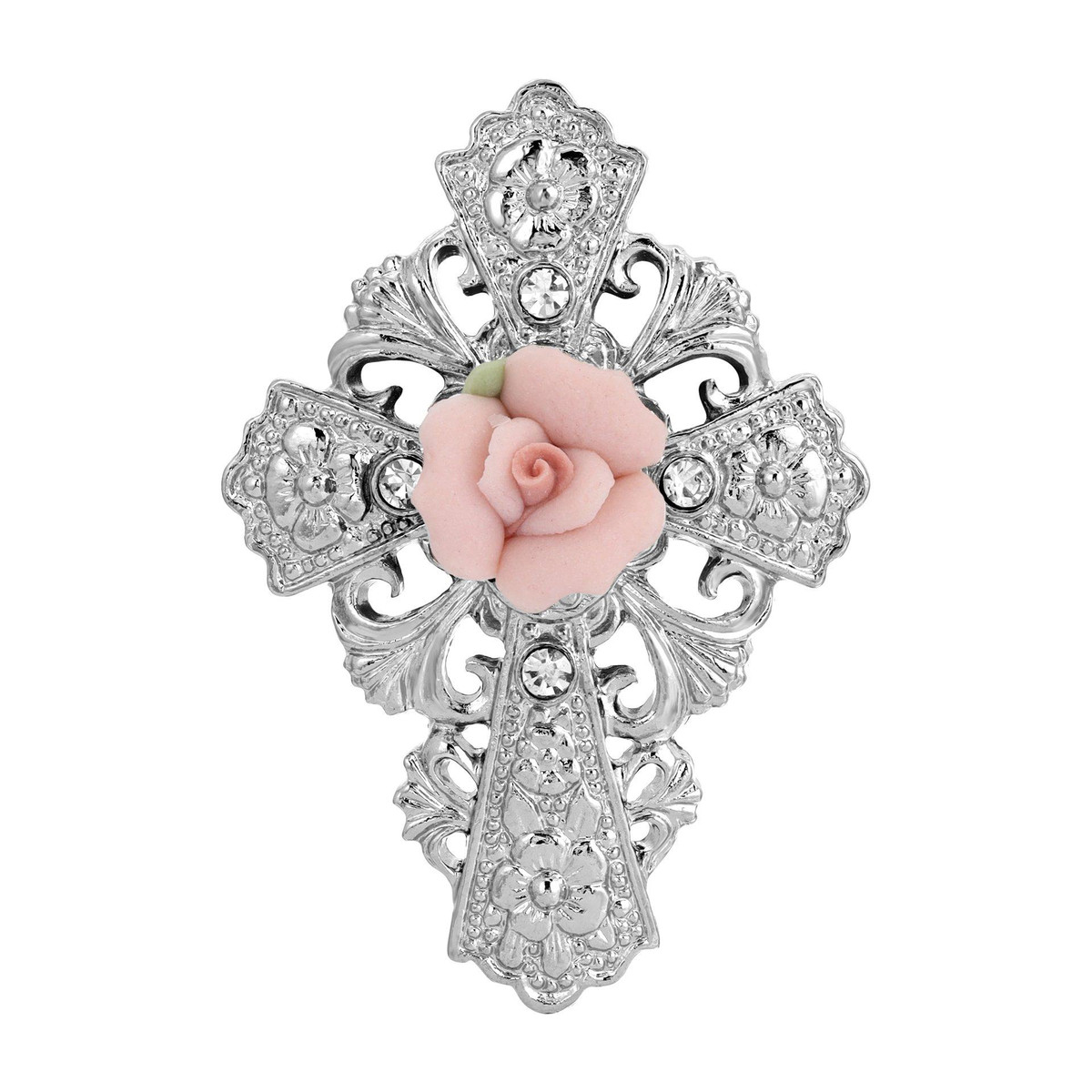 Our intricate, elegant silver filigree pin is adorned with detailed flowers at all points of the cross. This exquisite piece features round crystal accents and a delicate handmade porcelain rose at its center. Perfect for expressing faith and fashion, this pin adds a touch of grace and sophistication to any outfit. Ideal for special occasions or everyday wear, its a beautiful symbol of delicate craftsmanship and timeless elegance. Length 1.7 in., width 30mm.