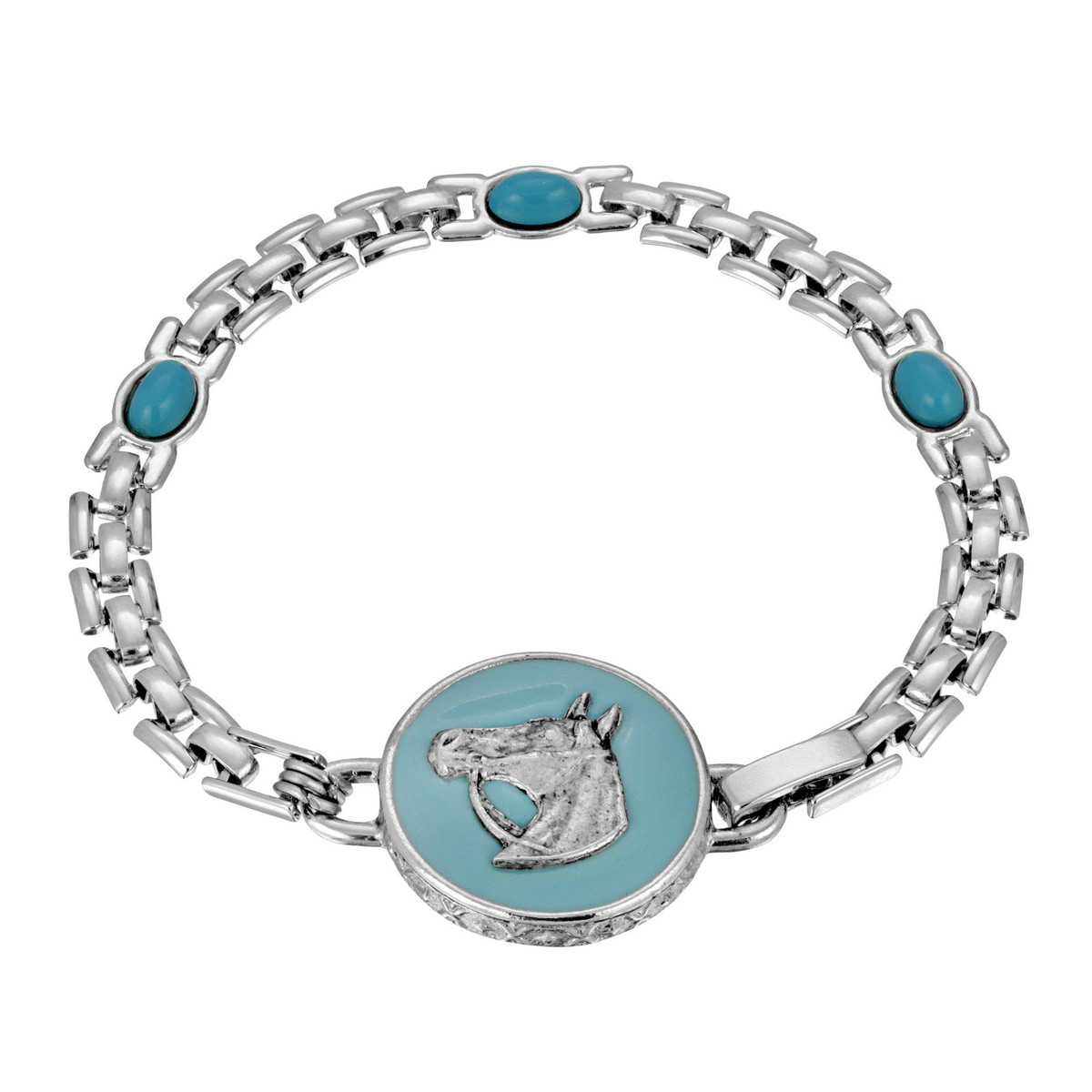 Embrace fun fashion with our enamel horse head bracelet. Featuring hand-enameled turquoise details and a pewter horse head, this piece combines elegance with a touch of whimsy. The foldover closure ensures a secure fit, making it perfect for wearing to work or on weekends. Stylish and unique, it adds a distinctive flair to any outfit, ensuring you stand out with sophisticated charm. Length 7.25 in., width 21mm.