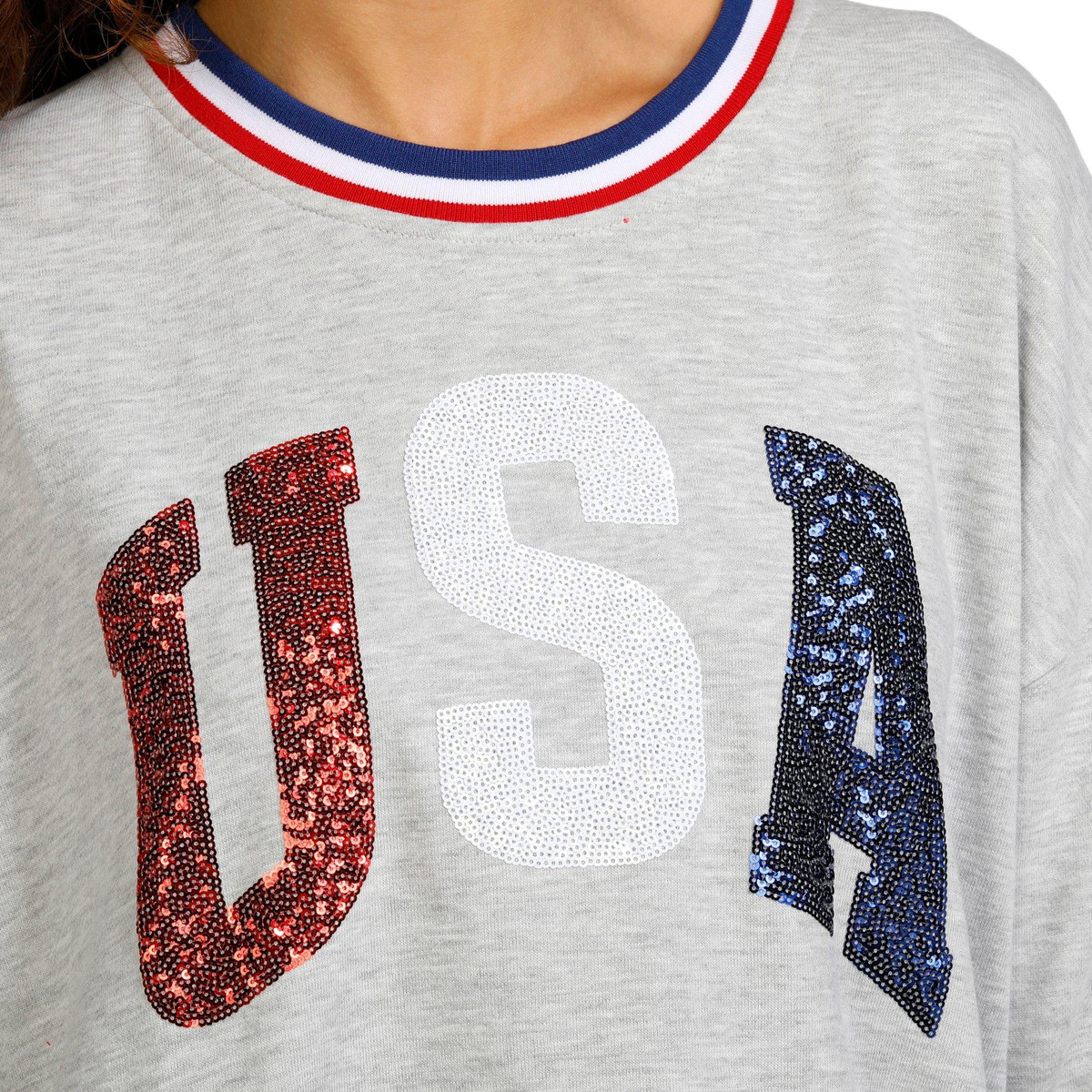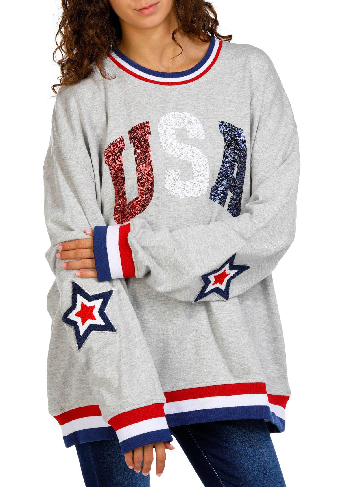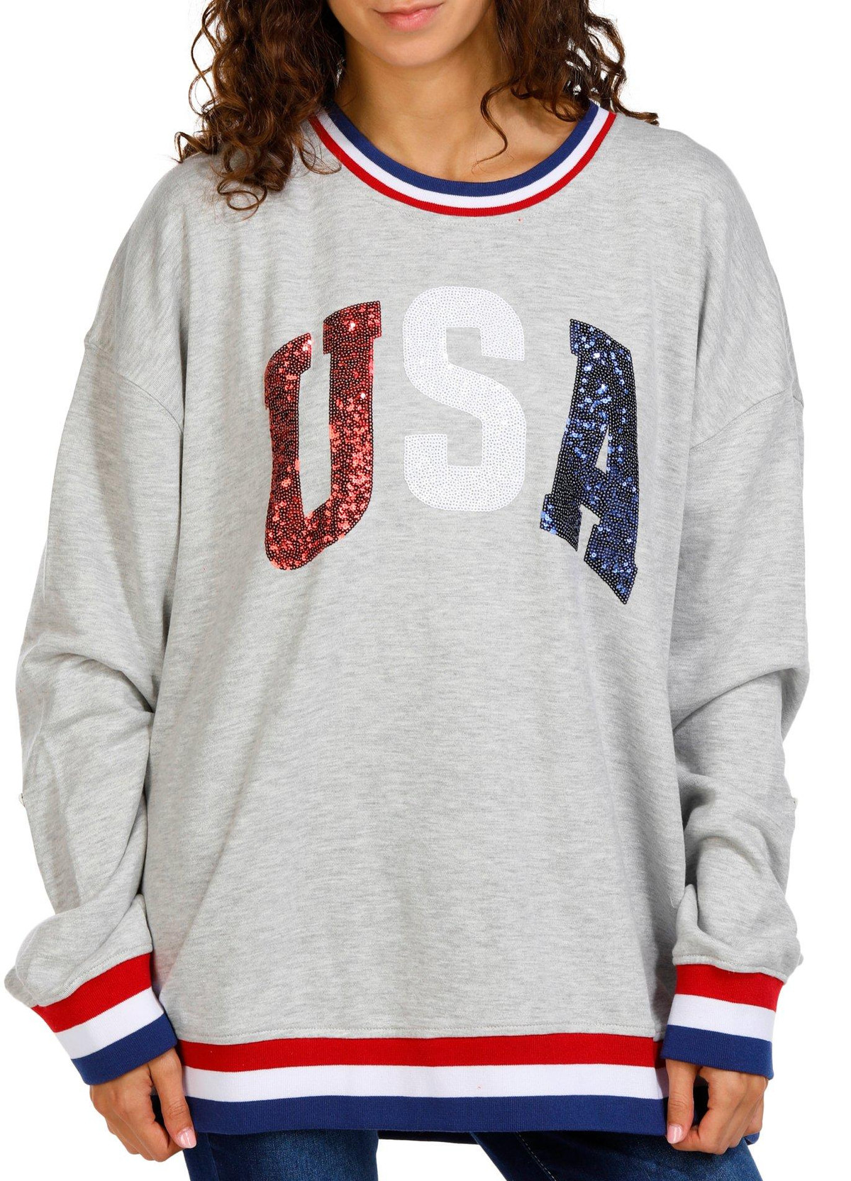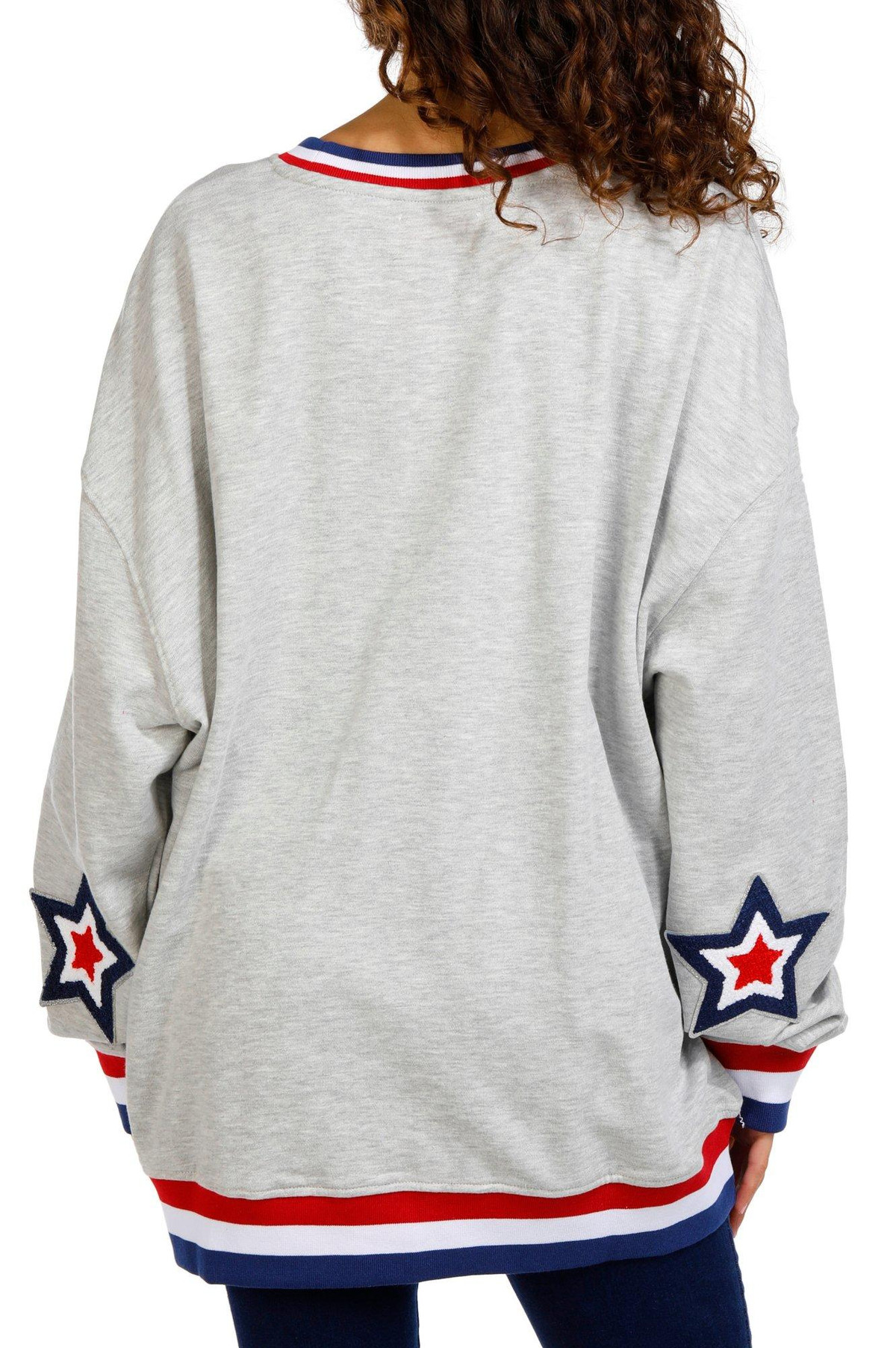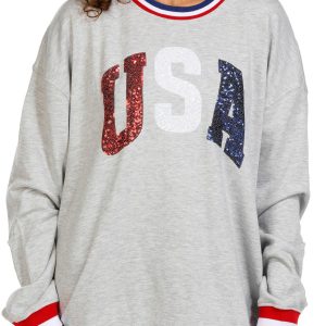 This long sleeve sweater features USA themed patches that add a bold, patriotic touch. Soft and cozy, it’s perfect for showing spirit while staying warm and stylish.