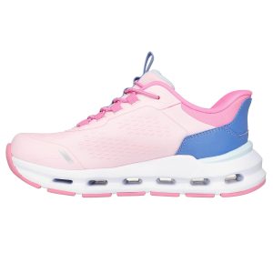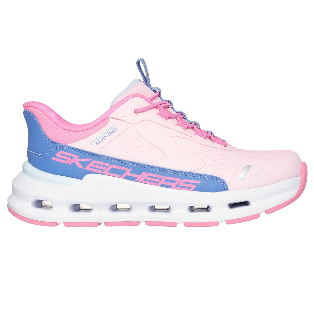 Play all day with added comfort in Skechers Hands Free Slip-ins®: Glide-Step® – Vista Lane. Designed with our exclusive Heel Pillow, this sporty slip-on features a mesh and synthetic upper with stretch laces, a cushioned Glide-Step® geometric midsole, and a Skechers Air-Cooled Memory Foam® insole.