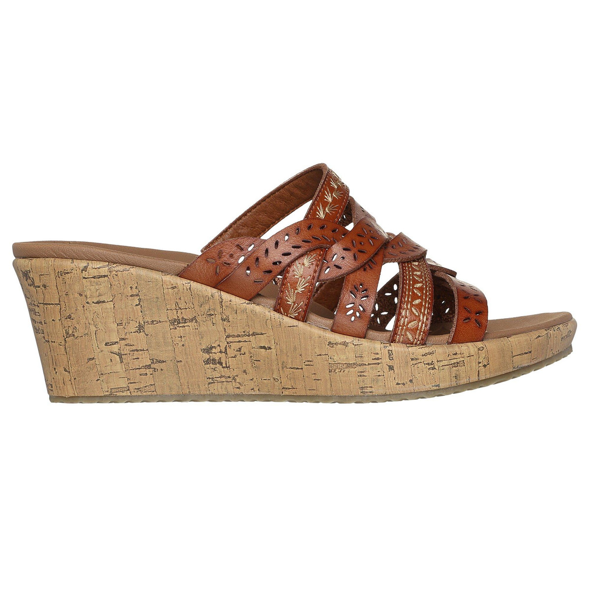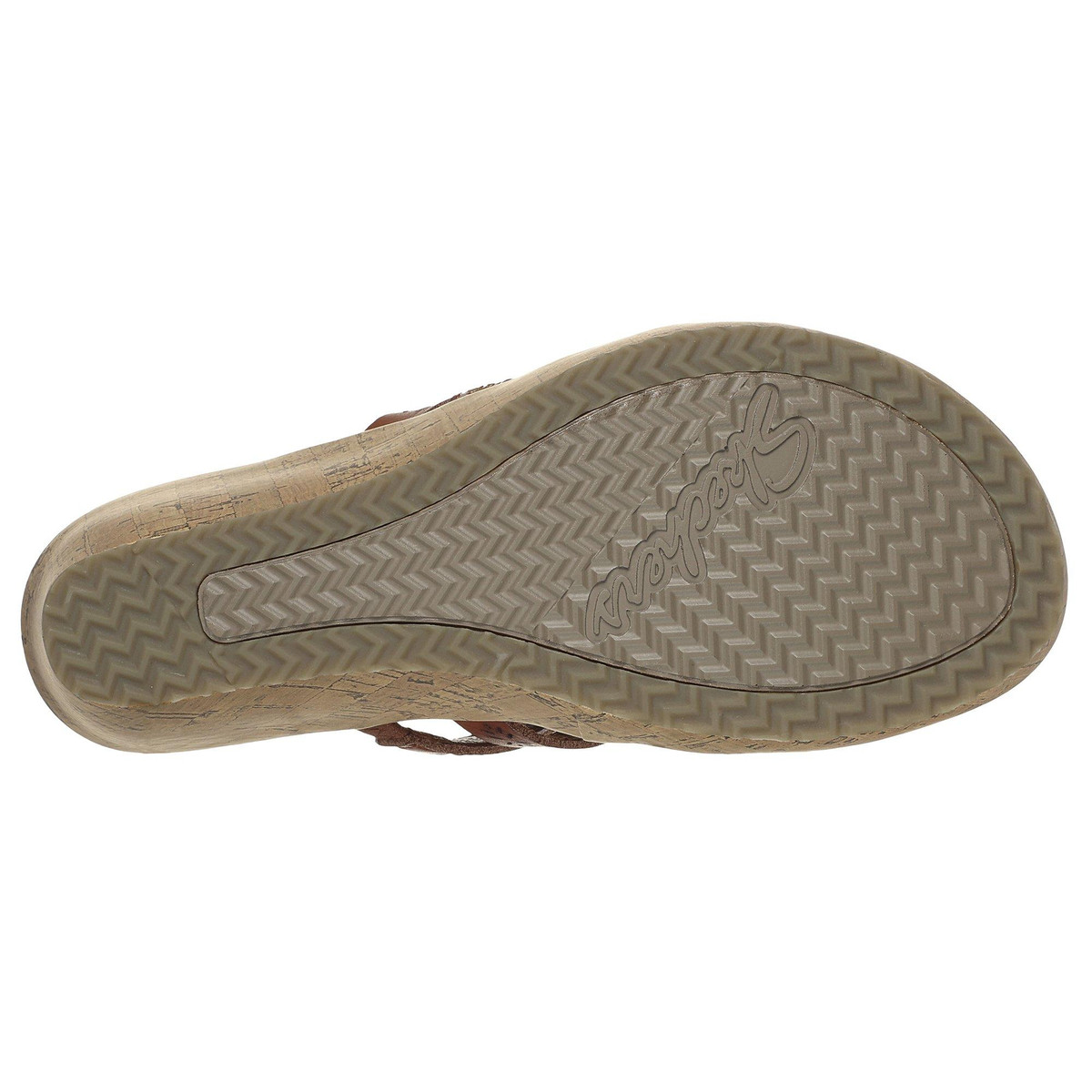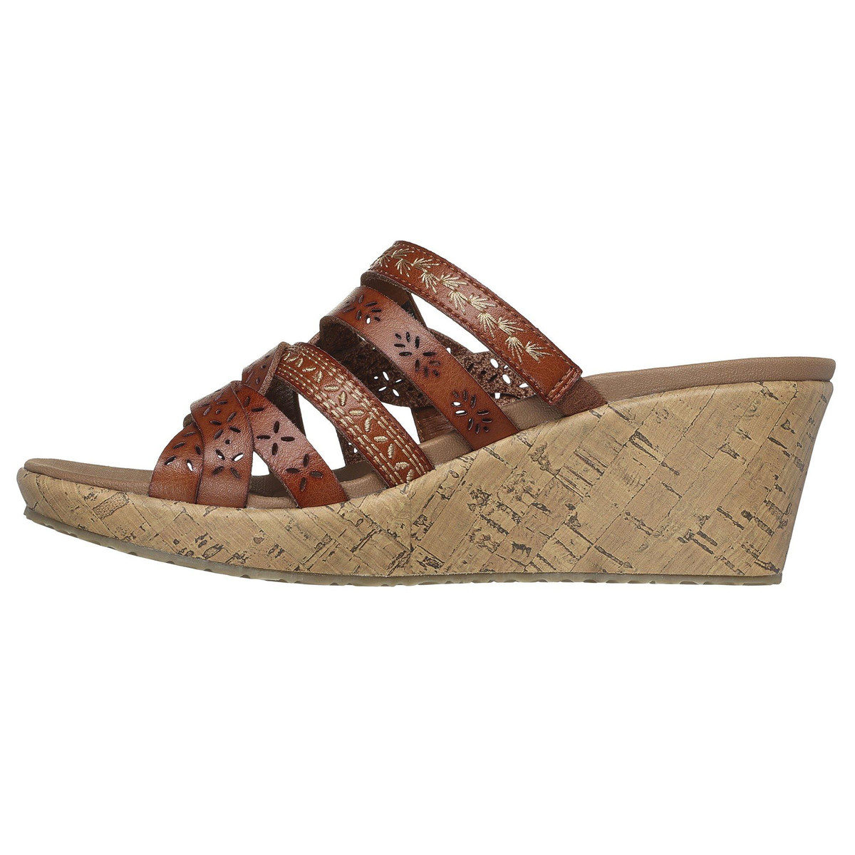 Summery style and absolute comfort combine in Skechers Beverlee Resort wedge sandals. This strappy vegan wedge sandal features an embroidered and laser-cut synthetic upper with an adjustable back strap and a cushioned Luxe Foam footbed.