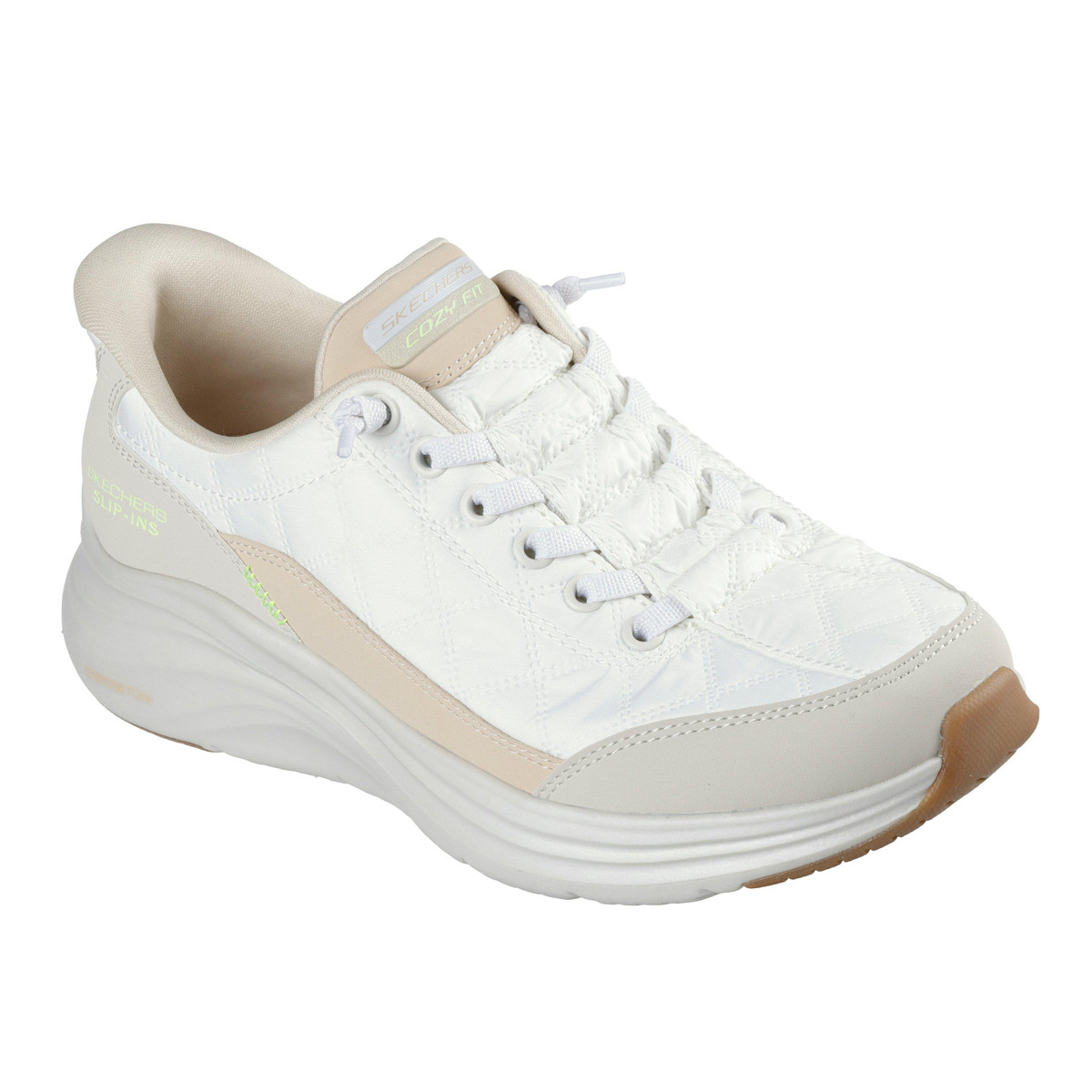 Surround your feet in effortless comfort wearing Skechers Hands Free Slip-ins: Contour Foam- Cozy Fit. Designed with our exclusive Heel Pillow, this vegan slip-on features a quilted Cozy Fit and synthetic overlay upper with tied-off stretch laces, Contour Foam midsole cushioning, and our signature cushioned Skechers Air-Cooled Memory Foam insole.