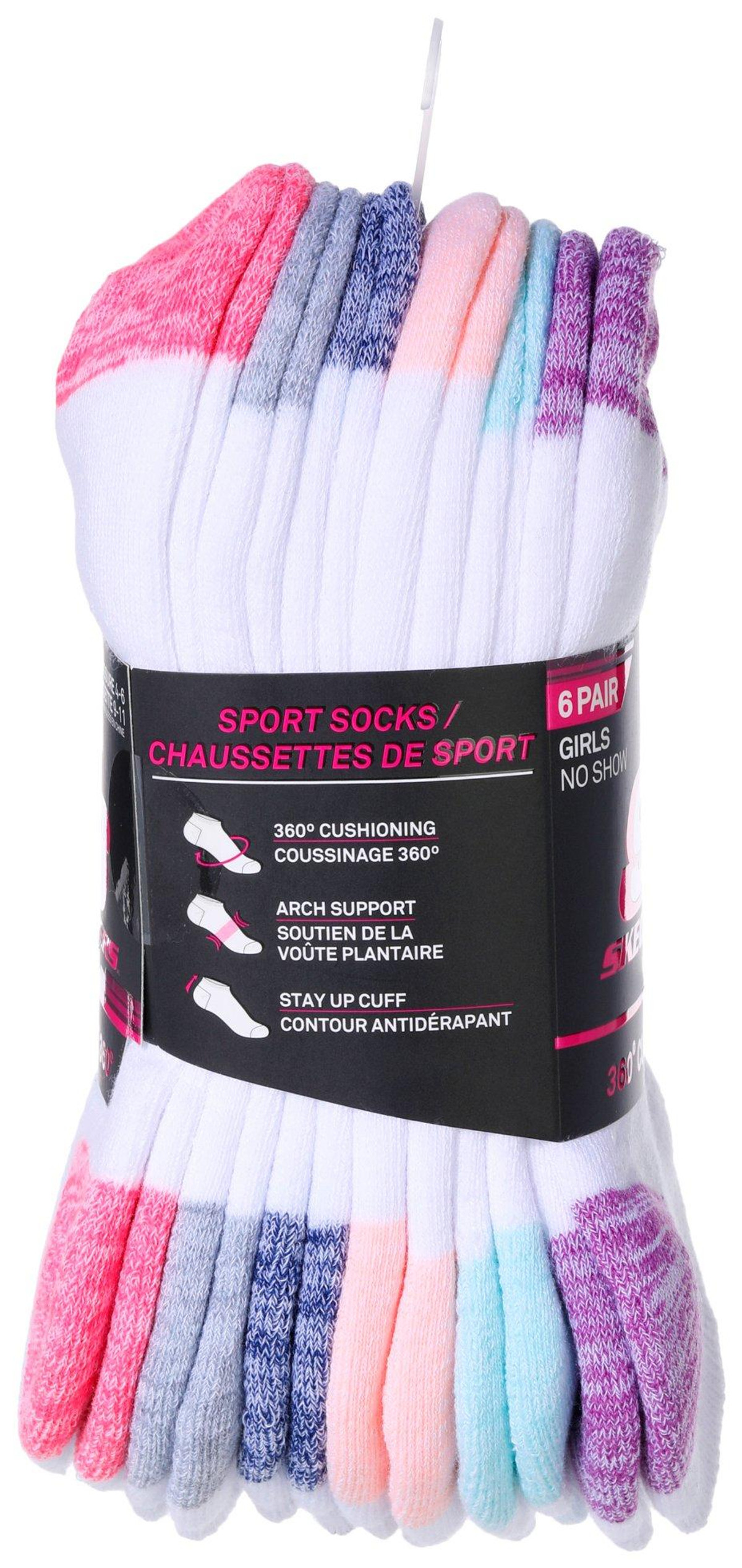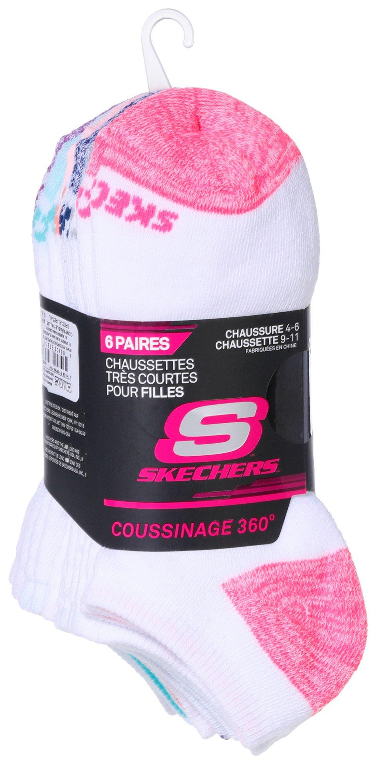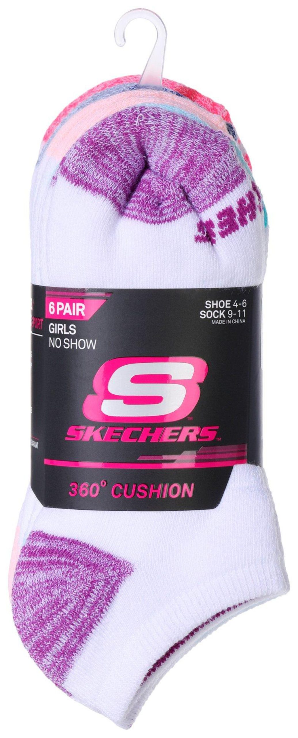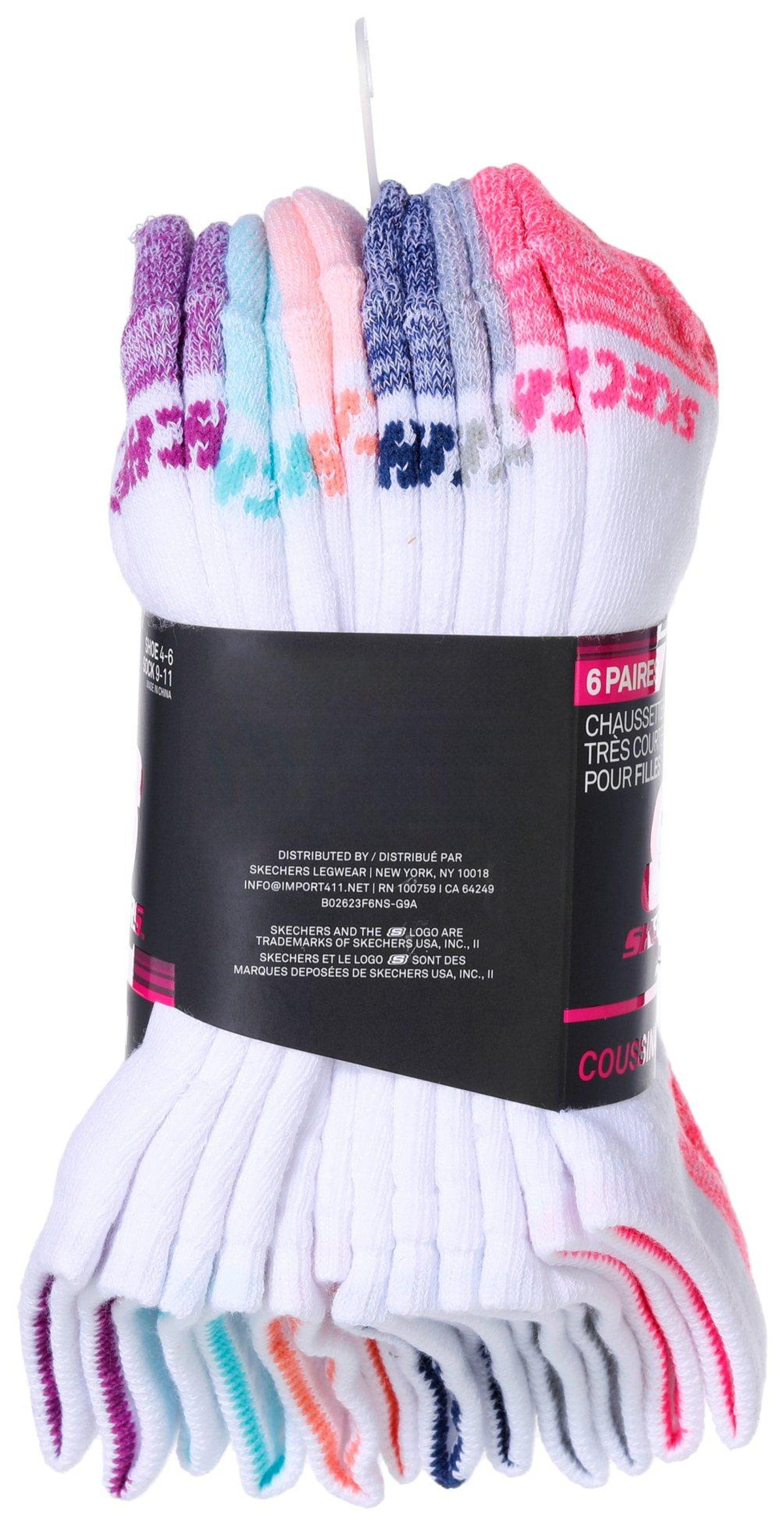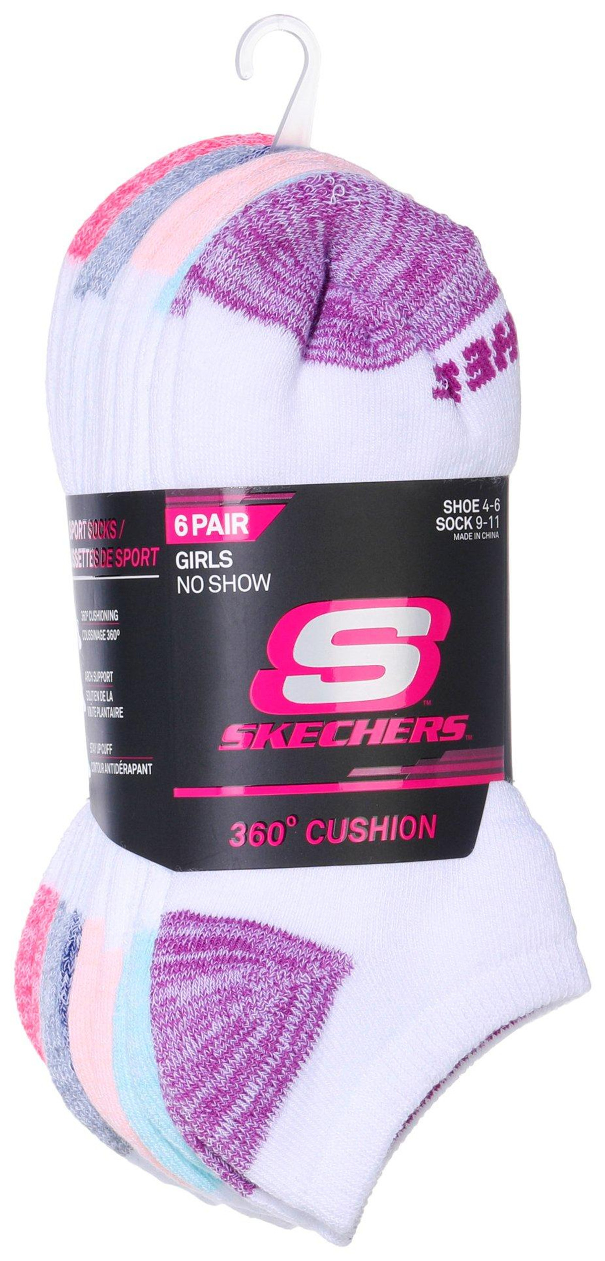Step into comfort and style with this Skechers Girls’ 6-Pair Sock Set! Designed for all-day wear, these no-show socks feature 360-degree cushioning for ultimate softness, arch support for a snug fit, and a stay-up cuff to keep them in place. With colorful toe and heel combos, they add a fun pop of color to every step. Perfect for shoe sizes 4-6 and sock sizes 9-11, these socks are a must-have for active girls who love both comfort and style!