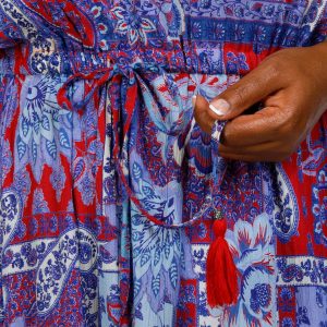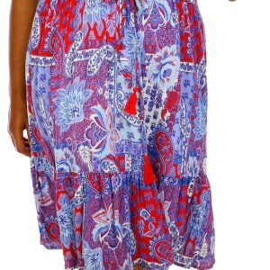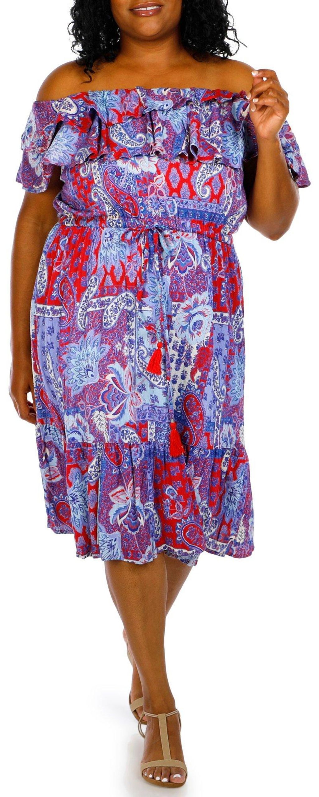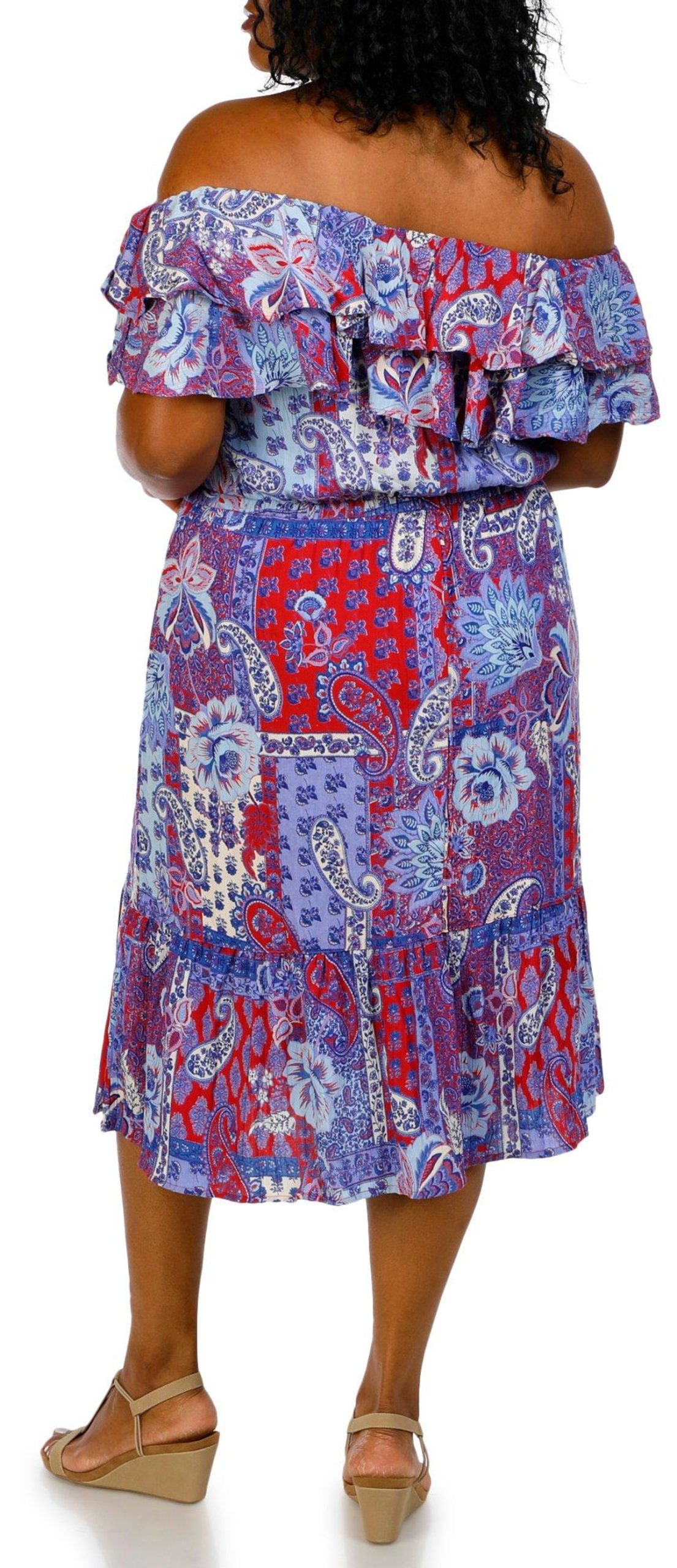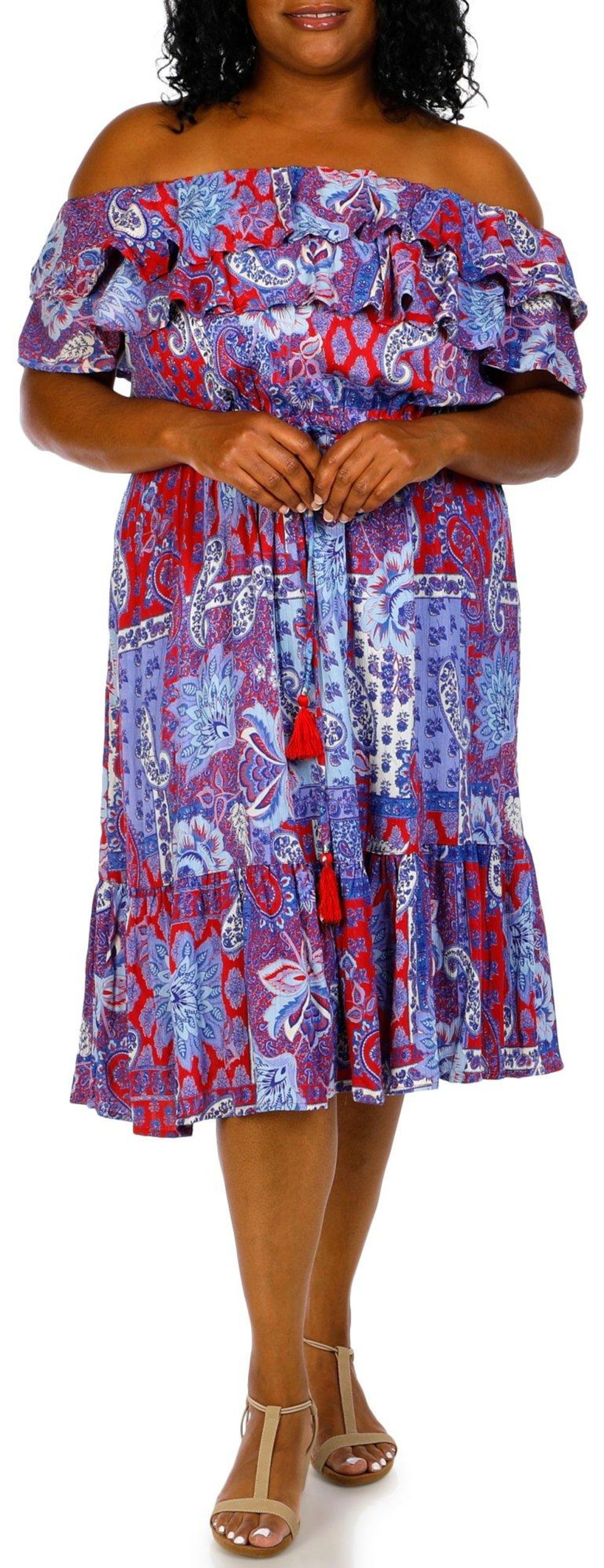 This womens off the shoulder dress showcases a red white and blue paisley print with a playful ruffle detail. The off the shoulder fit adds a touch of summer charm making it a festive choice for casual gatherings or patriotic celebrations. Fabrication 100% rayon.