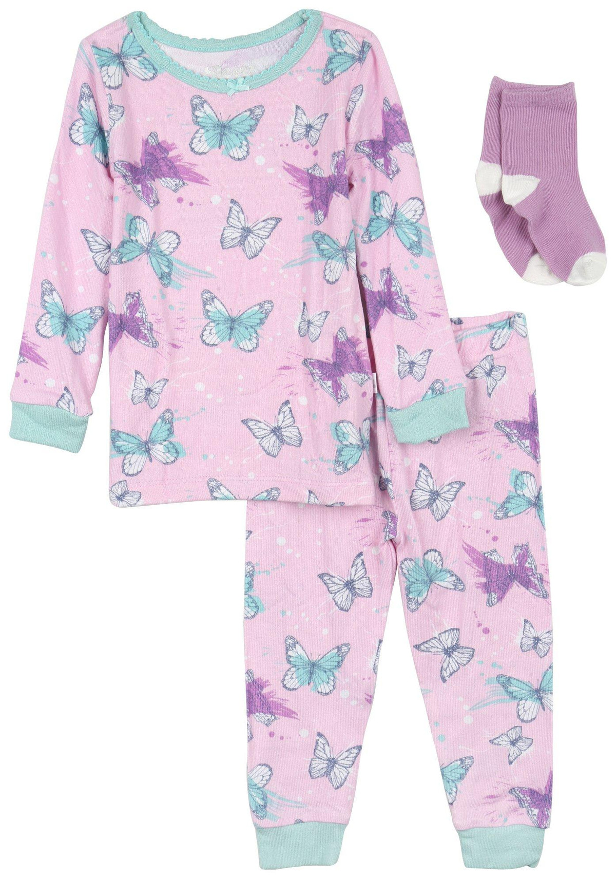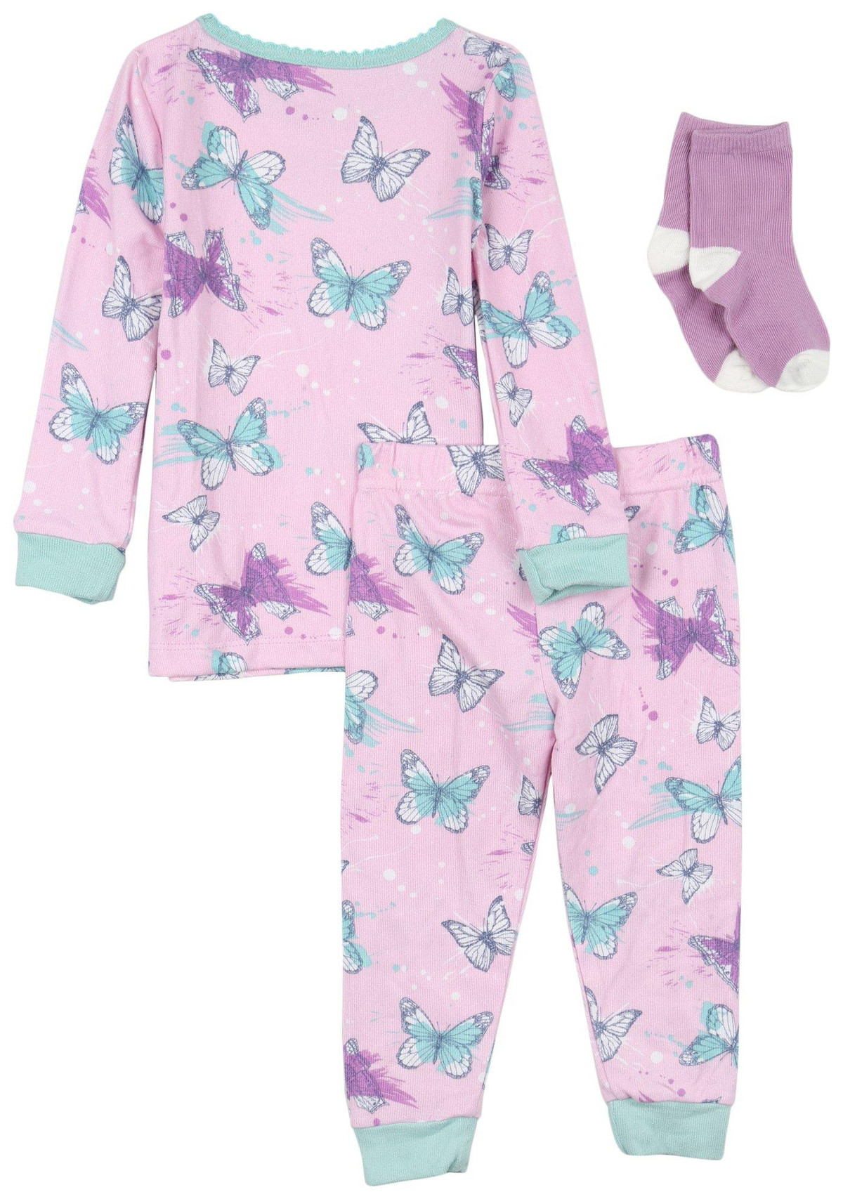 Introducing our Toddler Girls 3 Pc Butterfly Pajama Pants Set, perfect for your little nature lover! This charming set features a stylish butterfly print on the long sleeve top, pants, and matching socks, creating a coordinated and adorable look. Made from soft, comfortable fabric, these pajamas ensure a cozy nights sleep while adding a touch of elegance to bedtime.