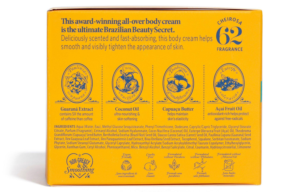 This iconic, fast-absorbing body cream helps visibly tighten and smooth skin with potent, caffeine-rich guaraná. Cupuaçu butter locks in lasting, non-greasy hydration while the coconut oil softens, conditions, and replenishes moisture. Contains 240 ml / 8 oz.