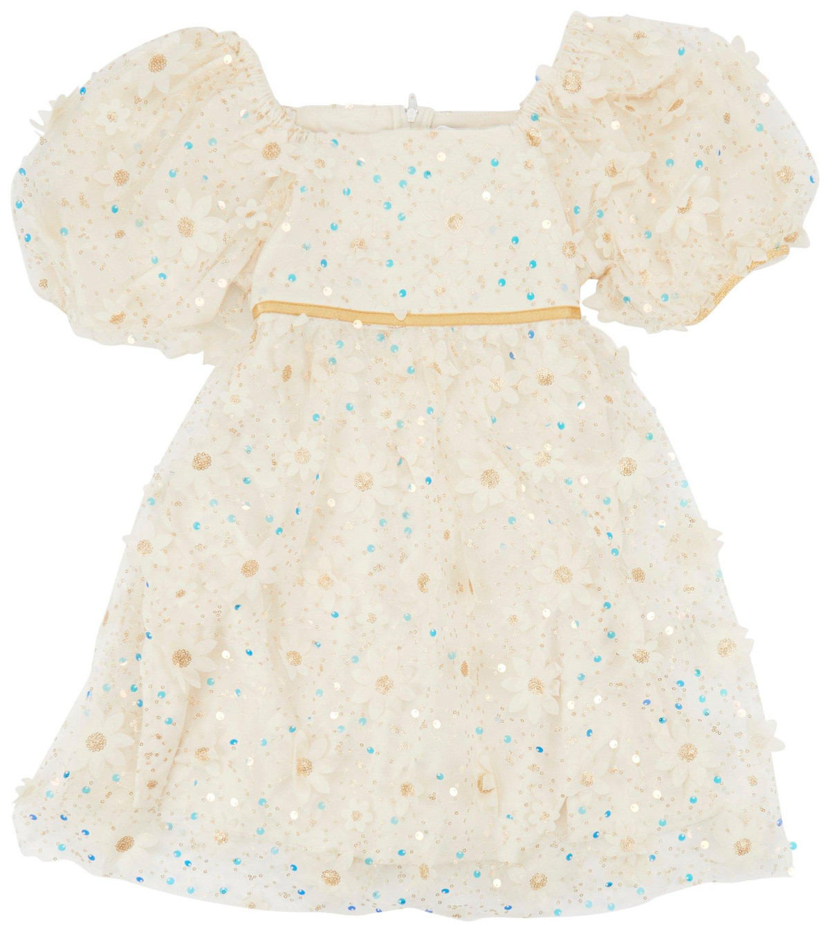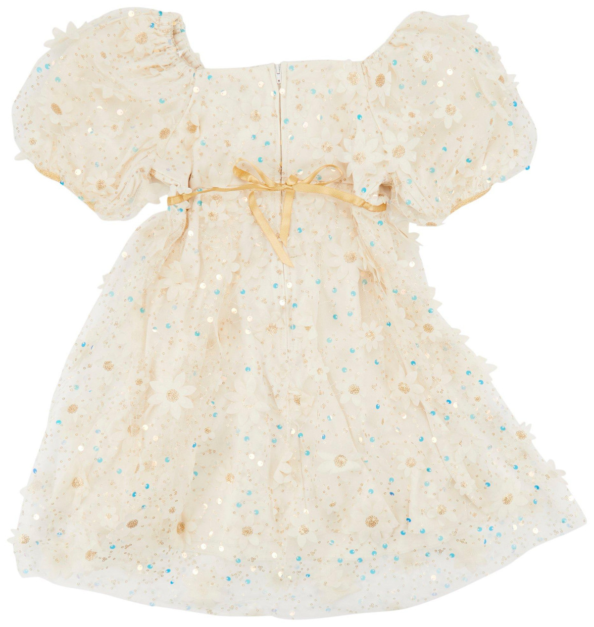 Dress her in effortless charm with this golden Daisy Dress! This 3D puffed sleeve dress celebrates kid-approved imagination, featuring floral-embroidered mesh fabric, square neckline, at the waist trim, zippeed back. This dress is great for all occasions ranging from casual outfits to special event dresses. 100% polyester.