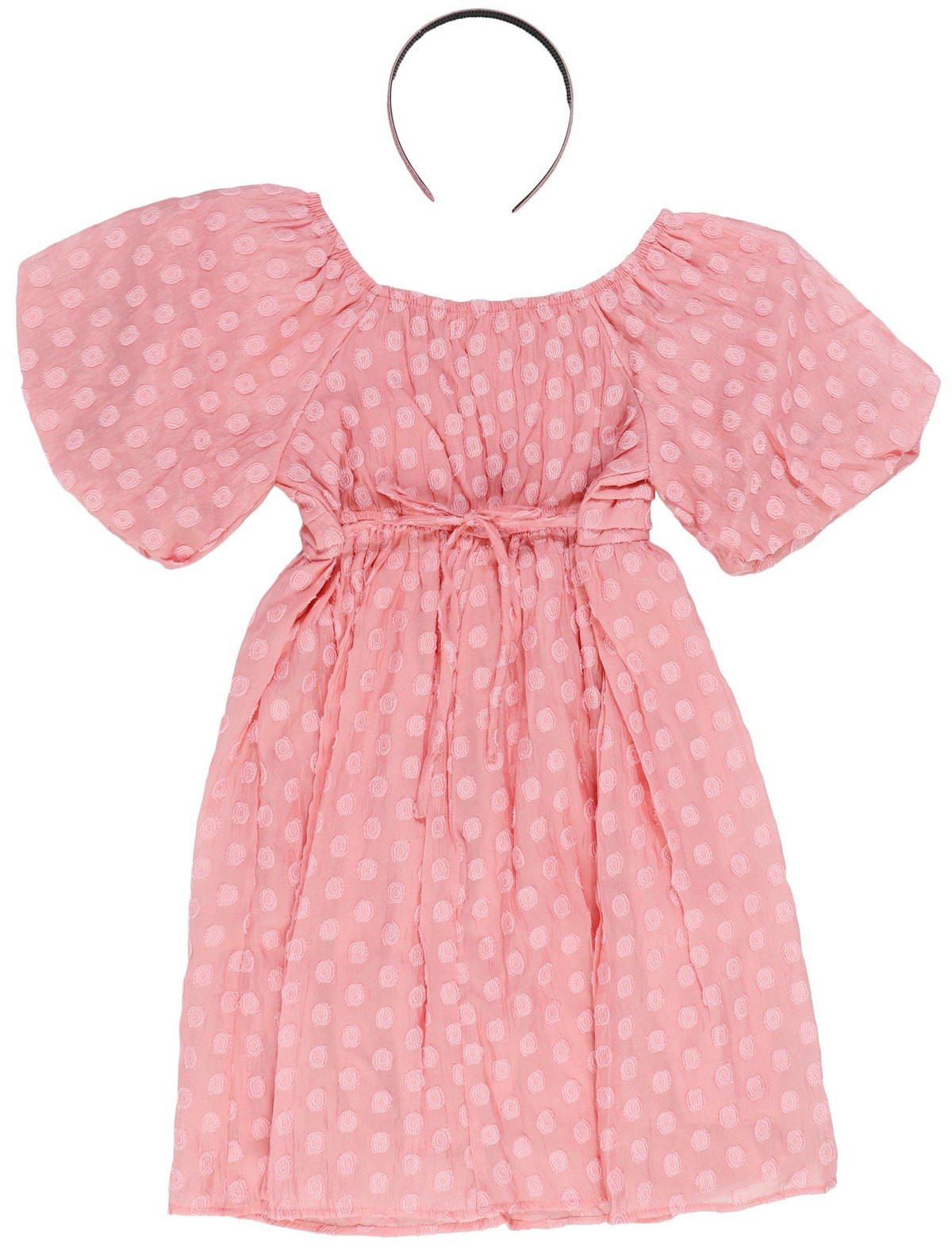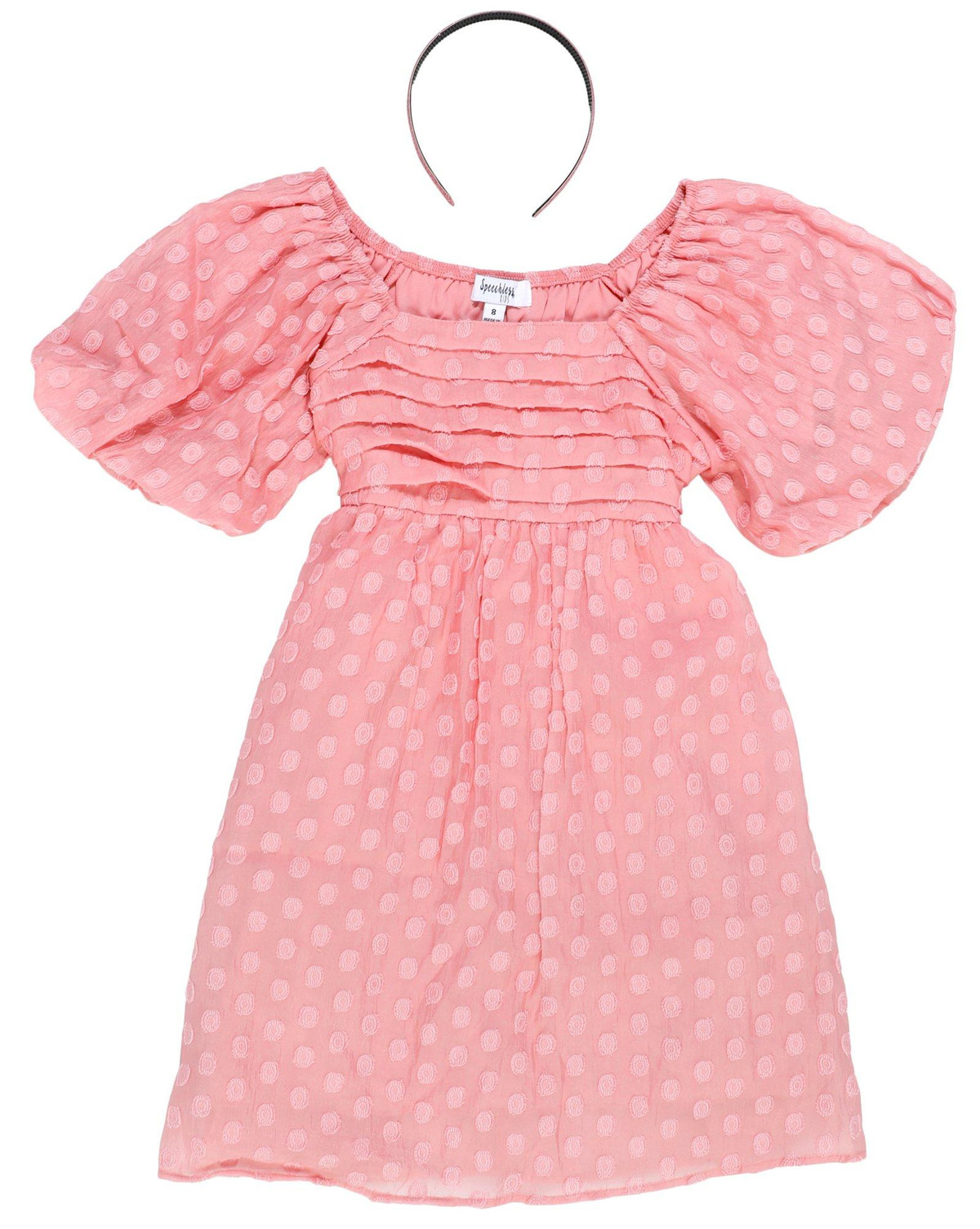 Your little one will feel their finest in this charming dot-embroidered dress framed by short puff sleeves and paired with a headband for a polished finish. 70% nylon, 30% polyester. Machine wash, line dry