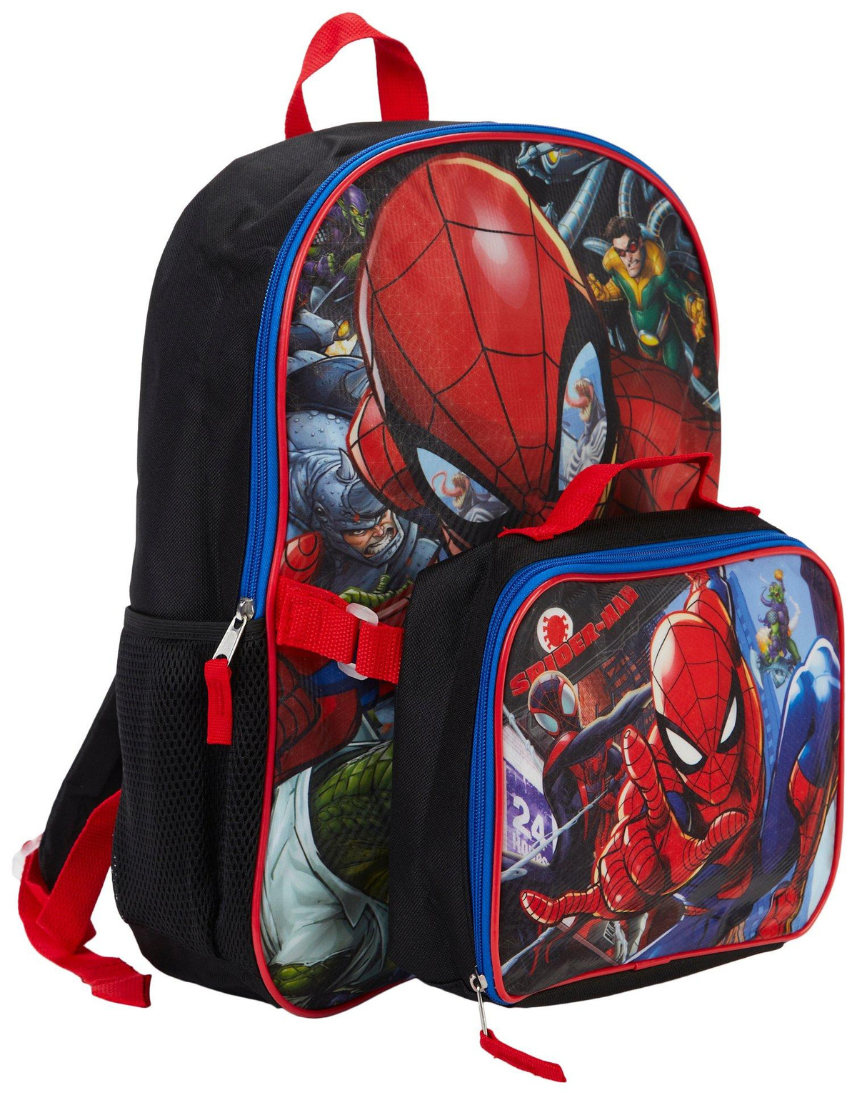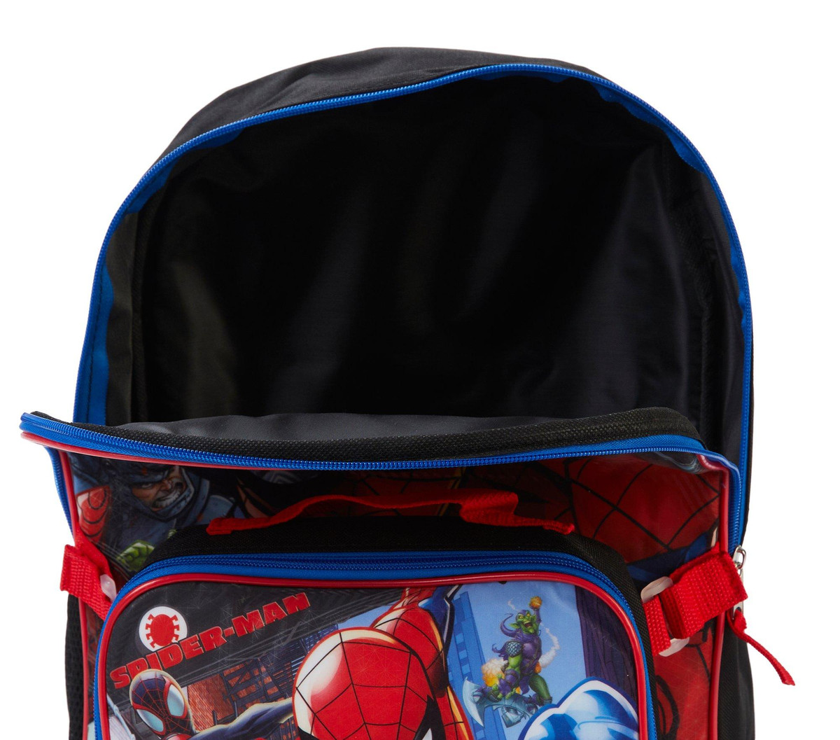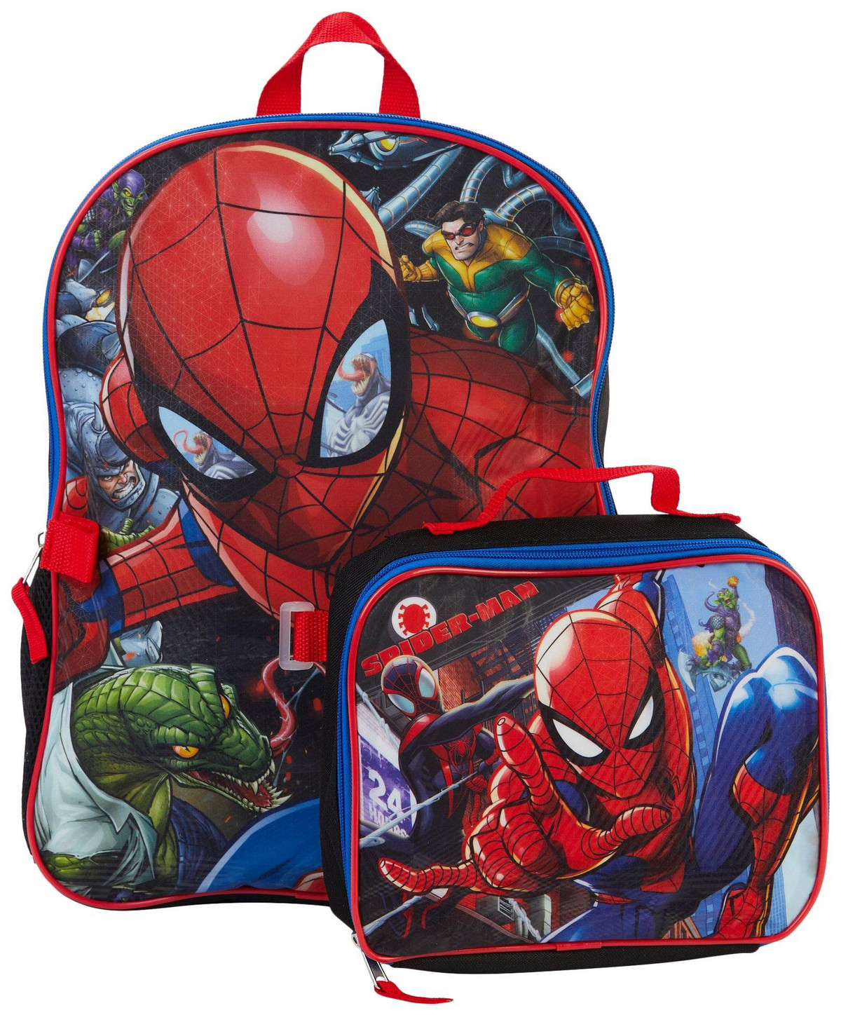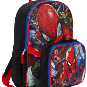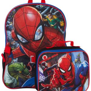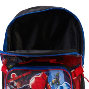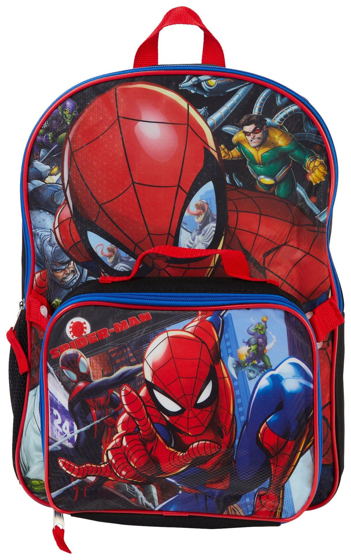 Stand out with the Spiderman Cooler Backpack with Lunch Pack set. The spacious backpack features padded adjustable shoulder straps, cushioned backing and a mesh side pocket for water bottles. Its detachable insulated lunch pack attaches securely with Velcro, keeping snacks fresh on the go. Made from durable polyester with vibrant Spiderman graphics. Ideal for school, picnics or travel. Wipe clean as needed.
