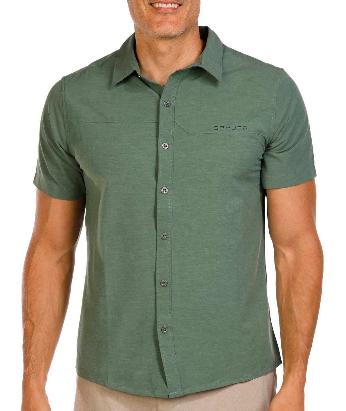 This short sleeve shirt features a buttoned front with built-in sun protection, stretch fabric, and moisture wicking technology. Designed for comfort and performance, it keeps you cool and dry all day long.