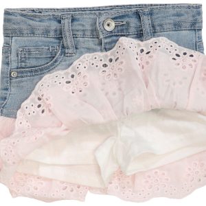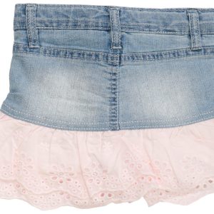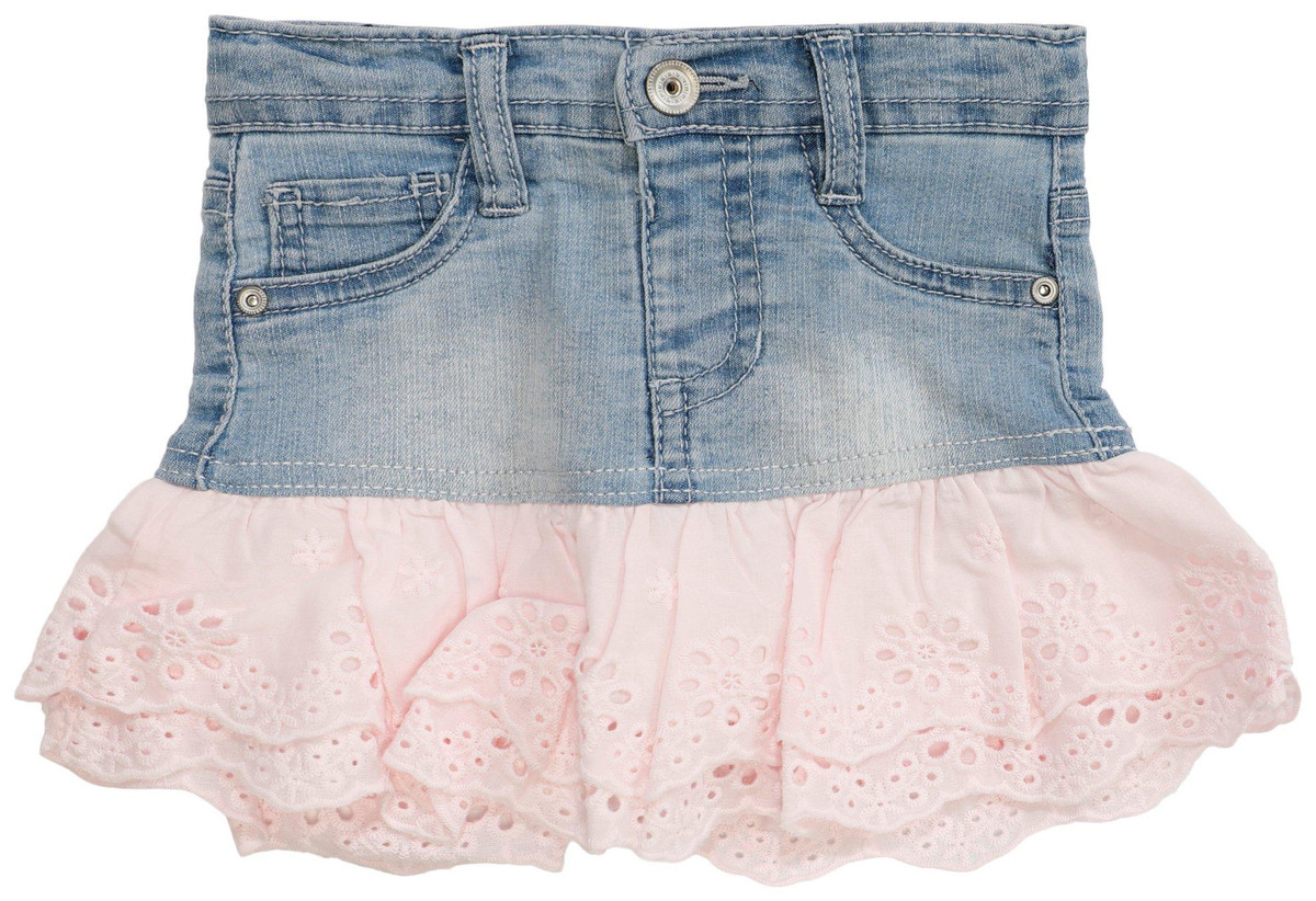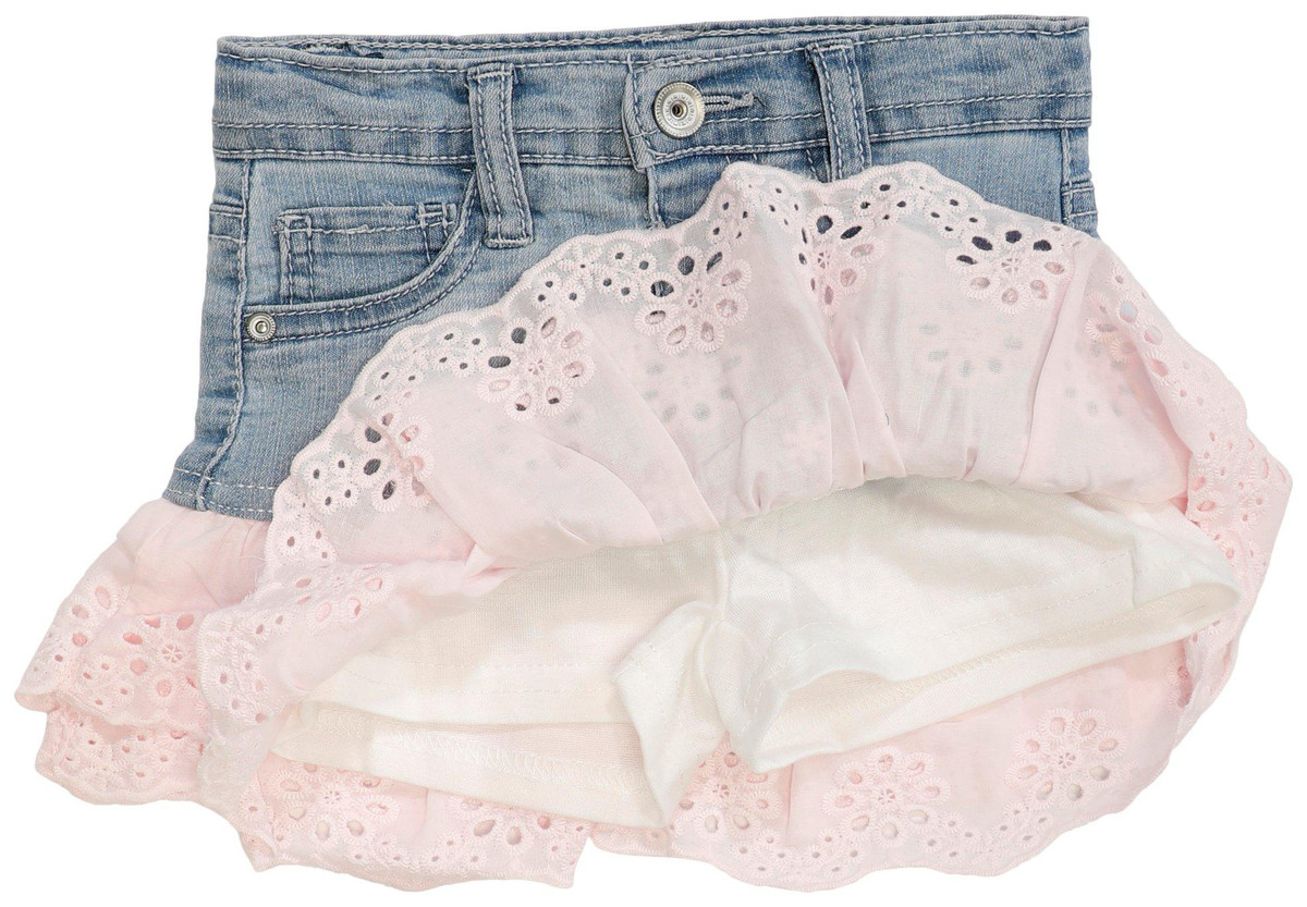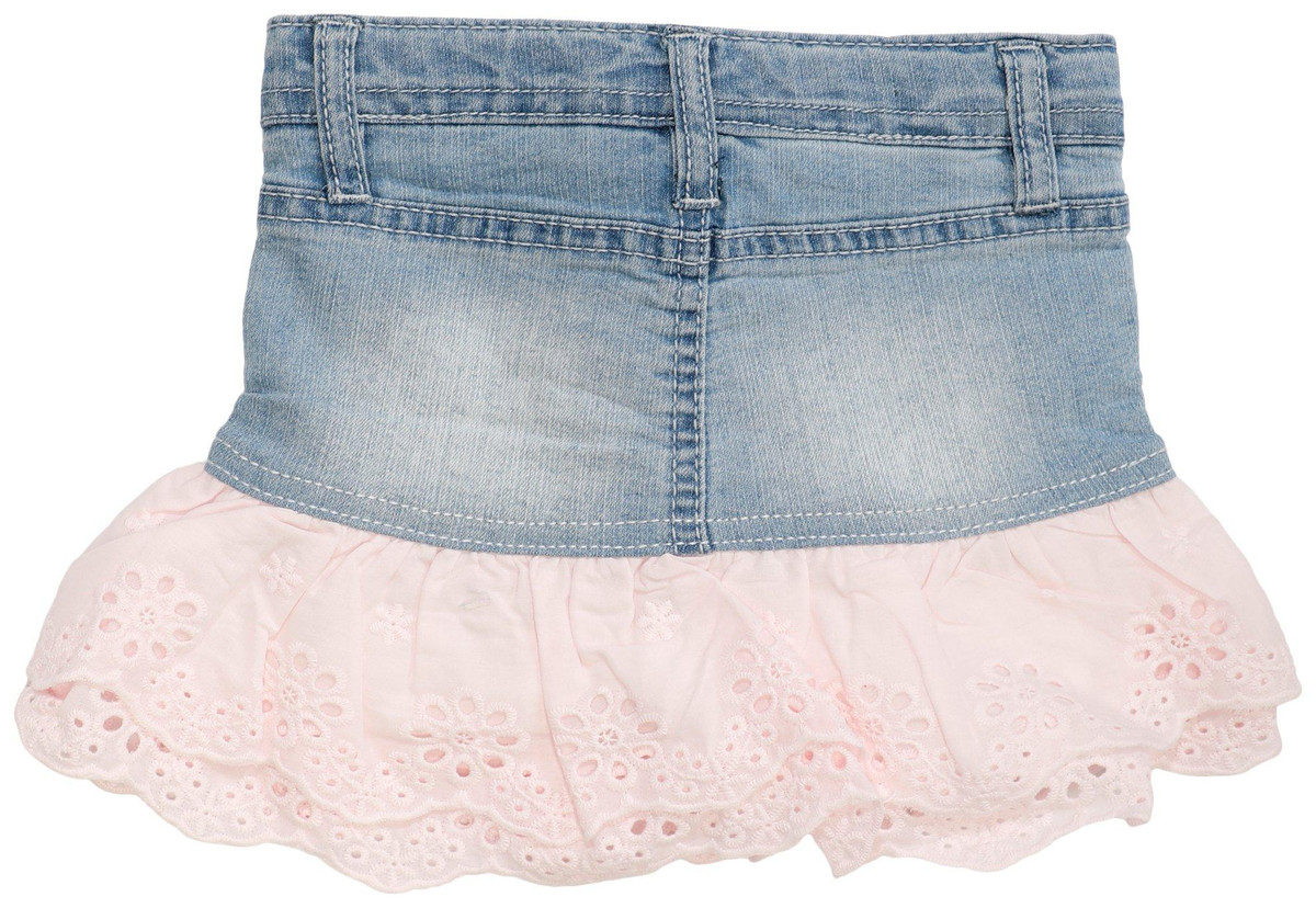 Add sweet detail to her look with this Toddler Girls Eyelet Hem Denim Skirt. Designed with a ruffled eyelet hem and classic five-pocket denim styling, it includes built-in shorts underneath for comfort and coverage. Ideal for playdates, parties, or everyday wear. Machine washable for easy care.