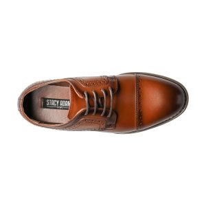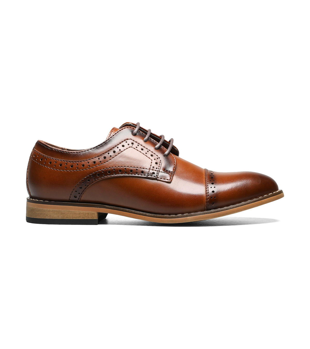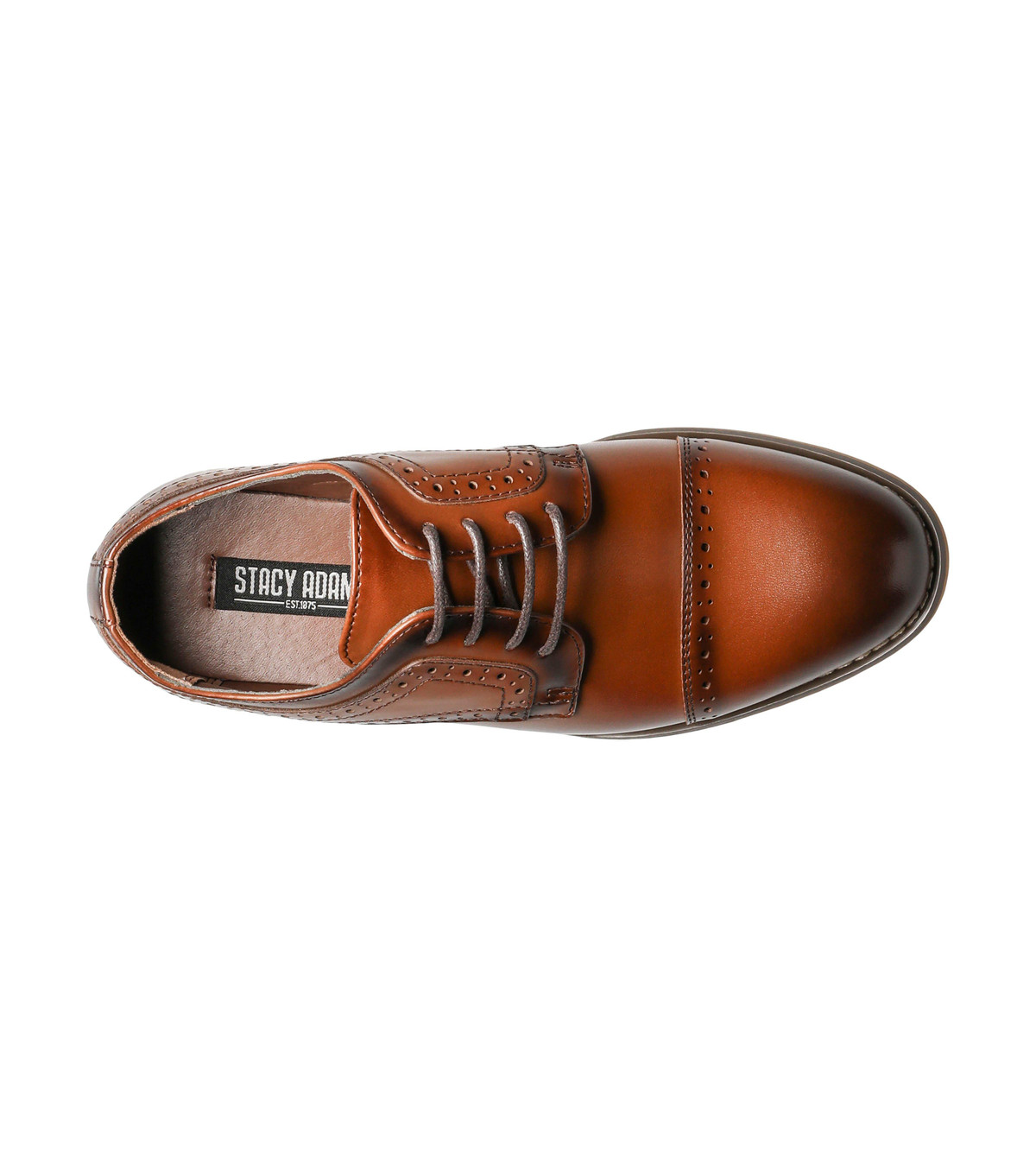 Start him out right with this updated classic. The Stacy Adams Dickinson Cap Toe Oxford features intricate perforated details on the toe and collar, a dress style sole, and a stacked style heel. This is one cap toe that will have any young man looking like he was born with a natural sense of style. Features include a durable man-made upper, synthetic linings, a fully cushioned insole, and non-leather outsole.