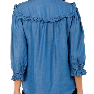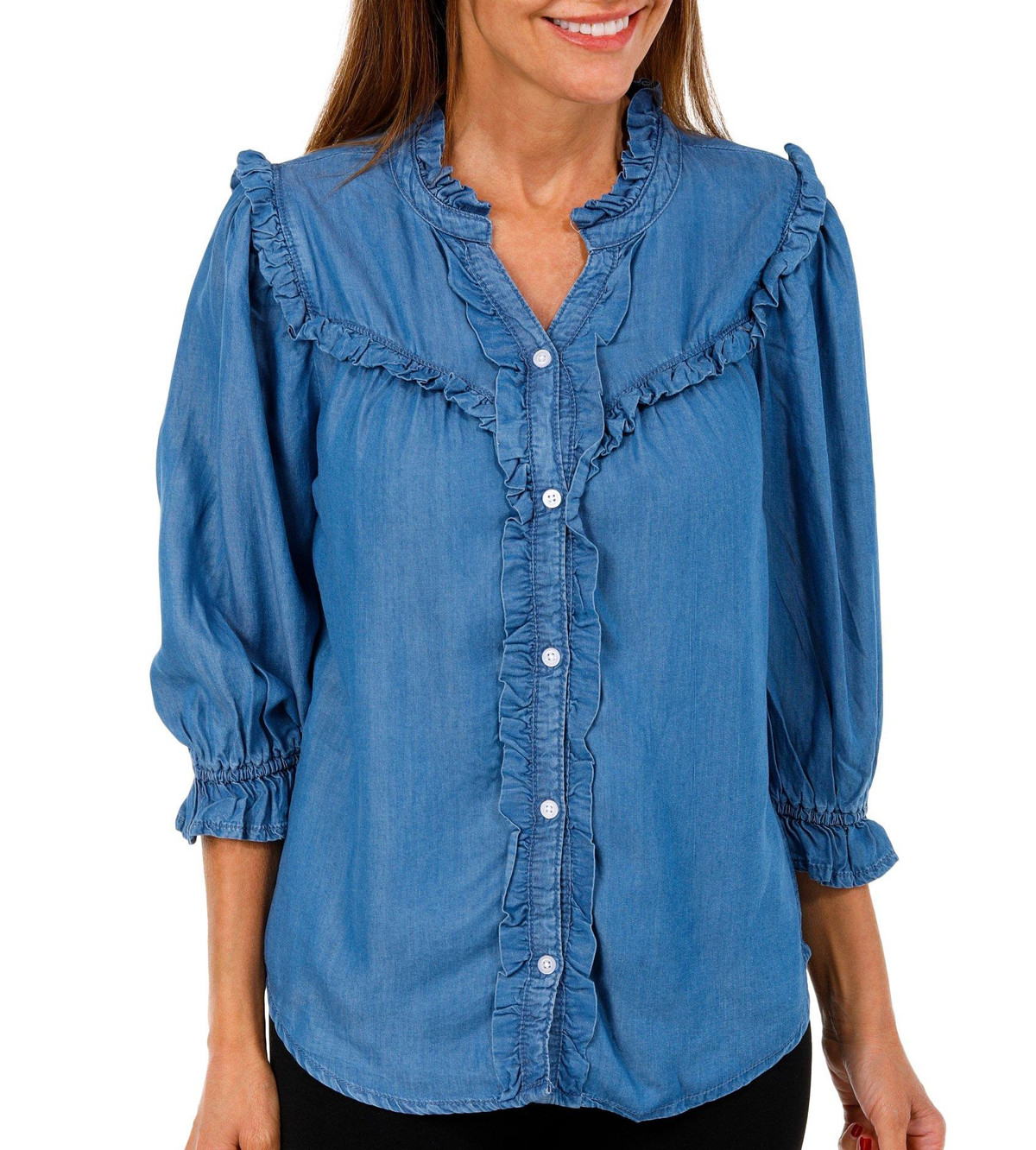 This petite button down top features a stylish chambray exterior with a flattering fit. The three quarter ruffle sleeves add a feminine touch while the button front design brings classic charm to this versatile wardrobe piece. Fabrication 100% lyocell