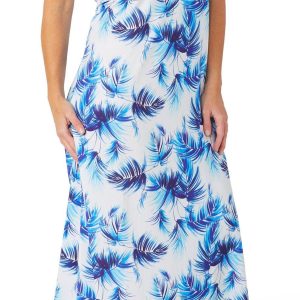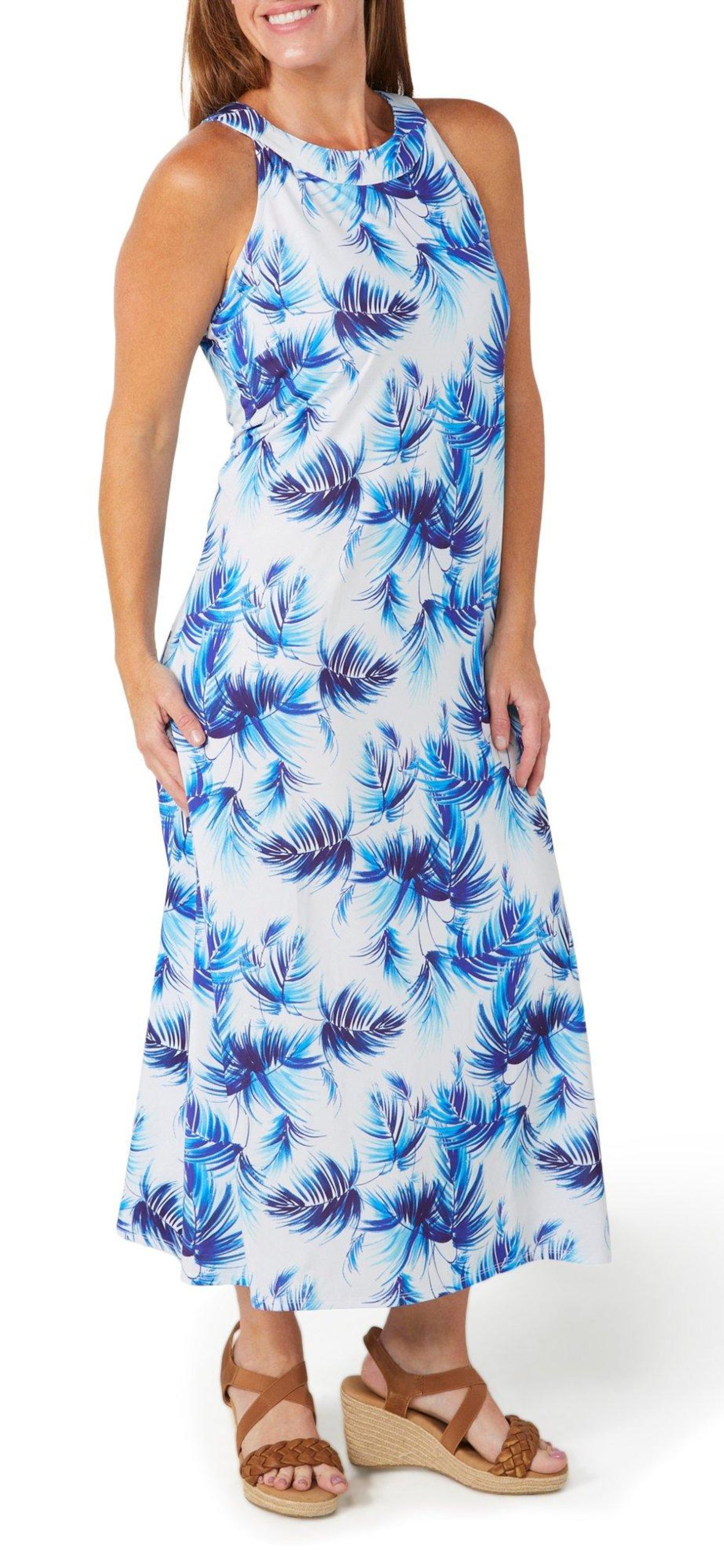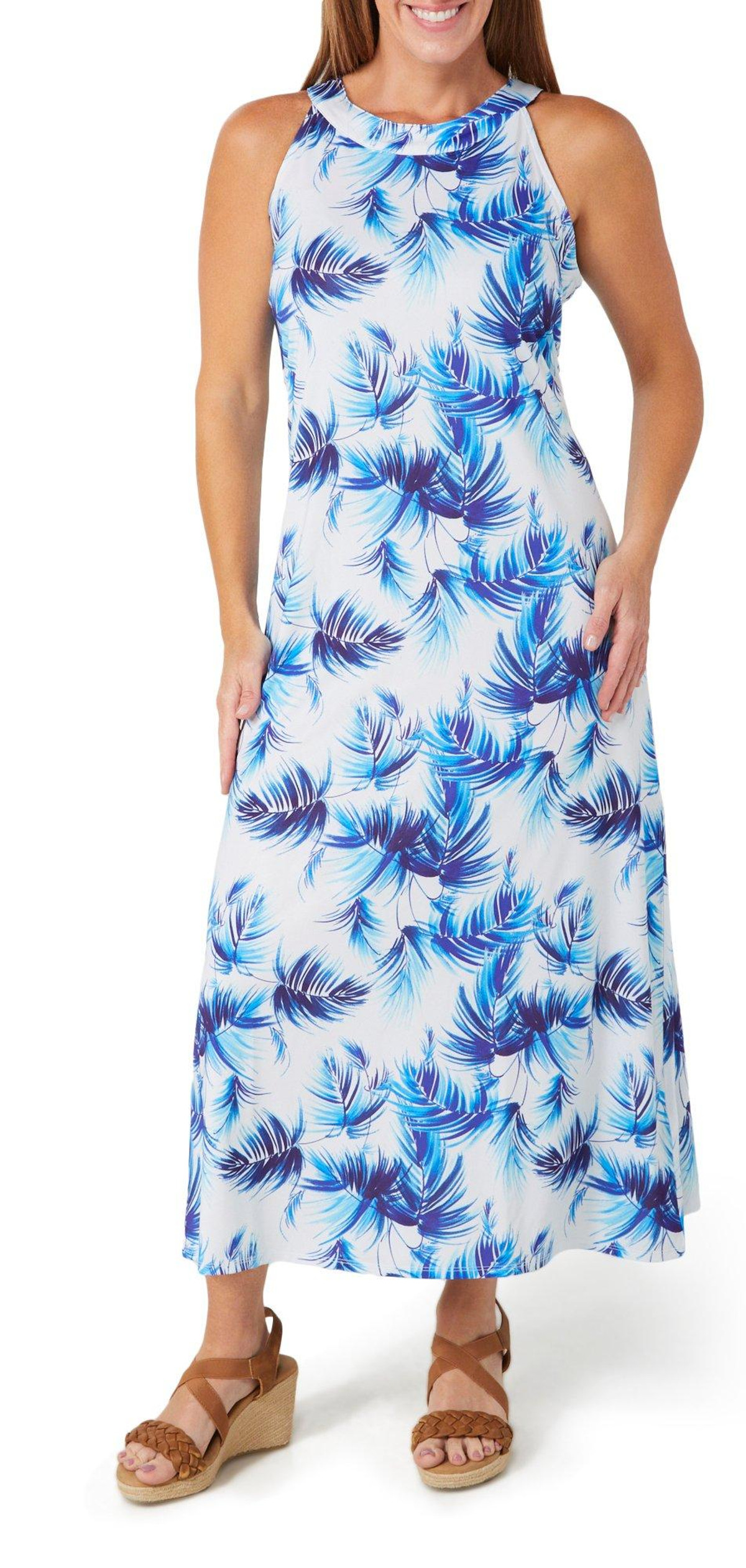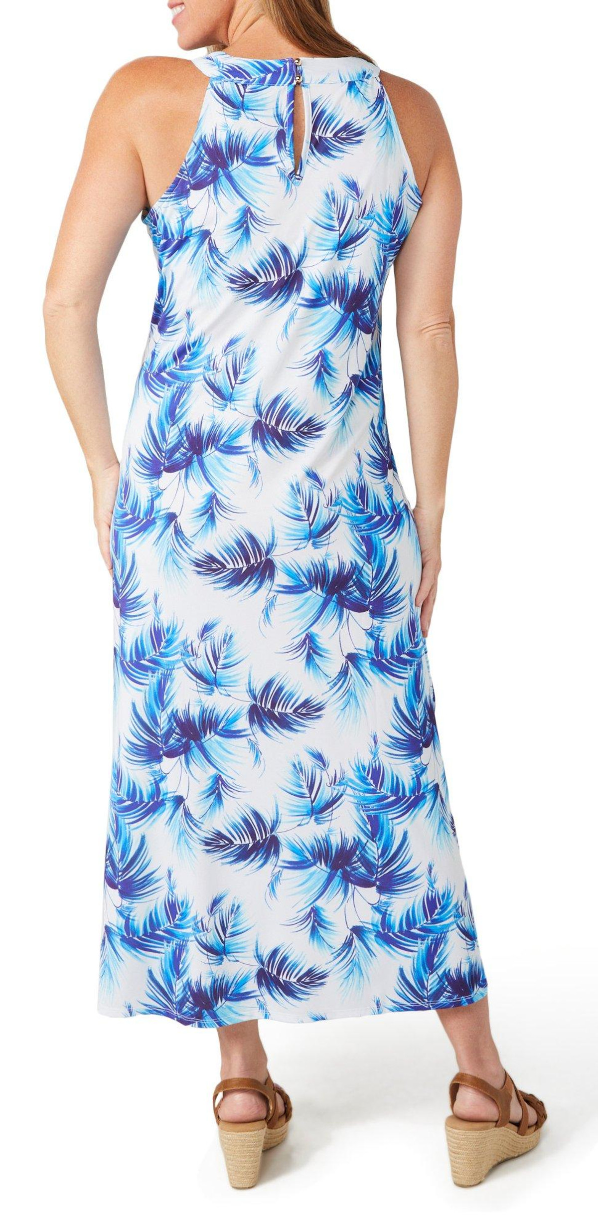 Make a statement in effortless style with this sleeveless maxi dress, featuring a bold print pattern and a flattering halter neckline. Flowing with grace and ease, its lightweight design moves beautifully with every step, perfect for sunny days, beach strolls, or evening getaways. Fabrication is 92% polyester, 8% spandex.