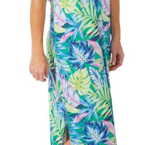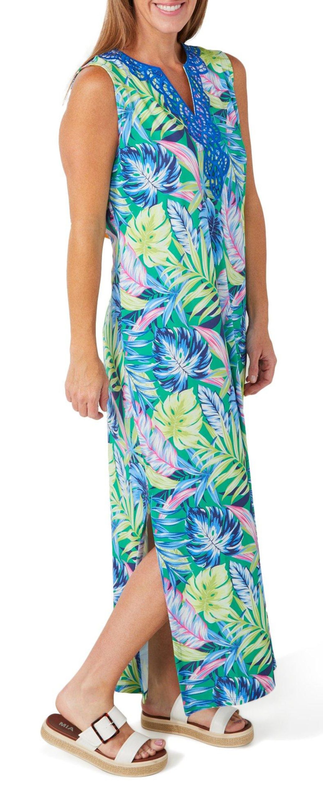 Bask in breezy elegance with this sleeveless maxi dress, featuring a vibrant print pattern and a beautifully detailed crochet yoke with a notch neckline. Designed with built in sun protection, its perfect for warm, sunny days when style and comfort are a must. Fabrication is 92% polyester, 8% spandex.