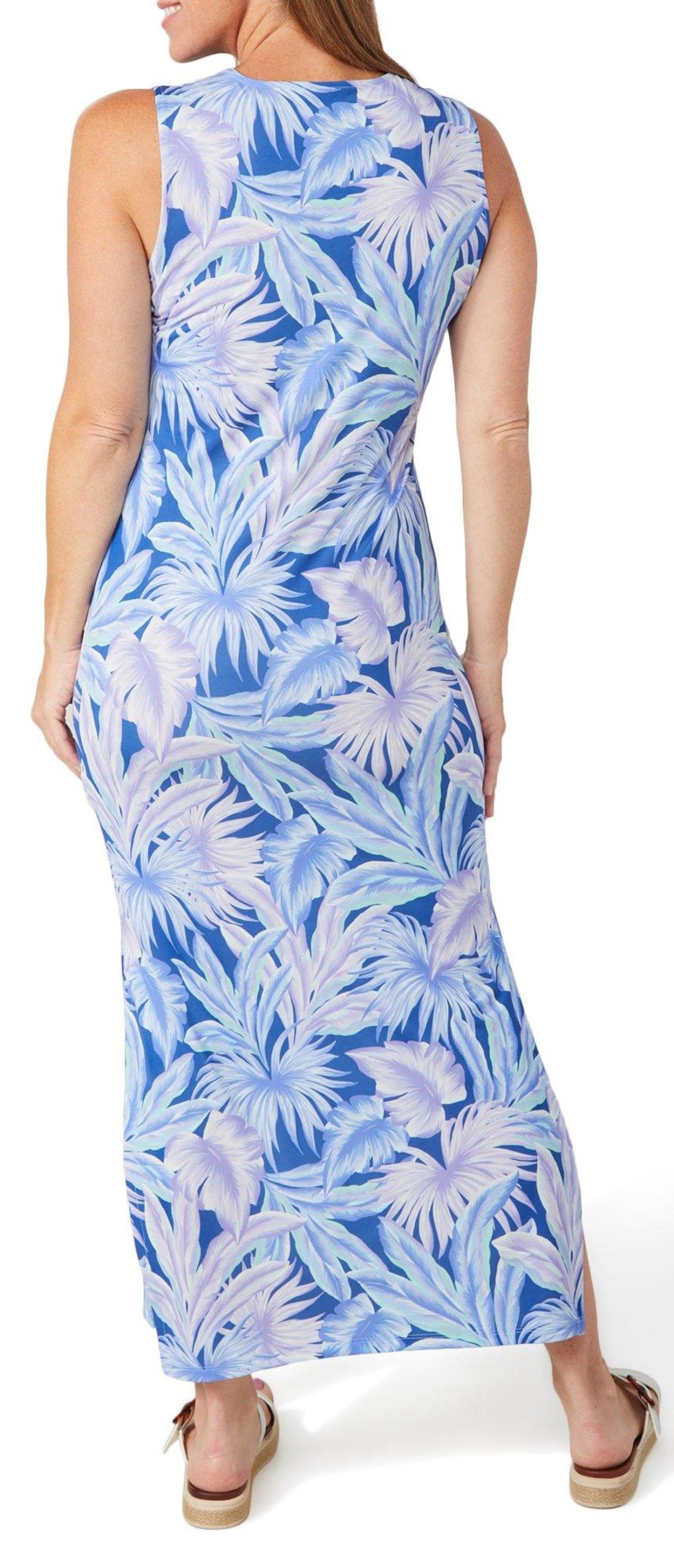 Bask in breezy elegance with this sleeveless maxi dress, featuring a vibrant print pattern and a beautifully detailed crochet yoke with a notch neckline. Designed with built in sun protection, its perfect for warm, sunny days when style and comfort are a must. Fabrication is 92% polyester, 8% spandex.