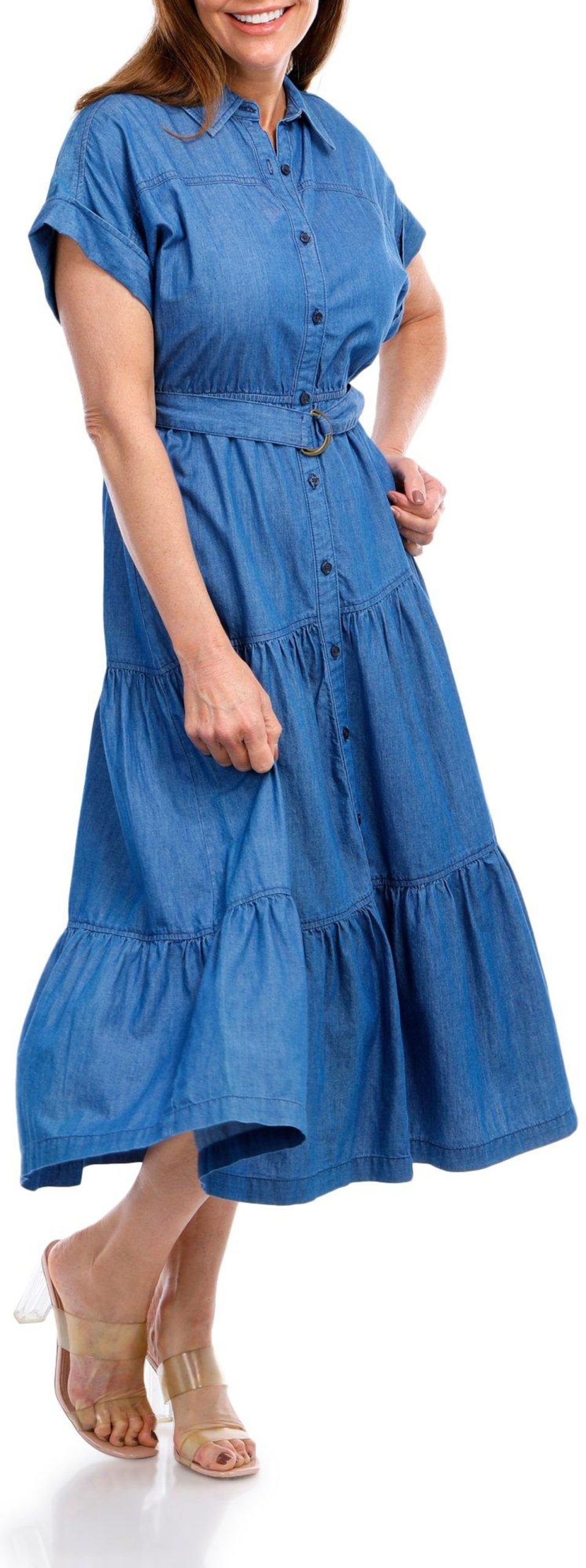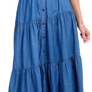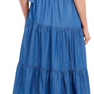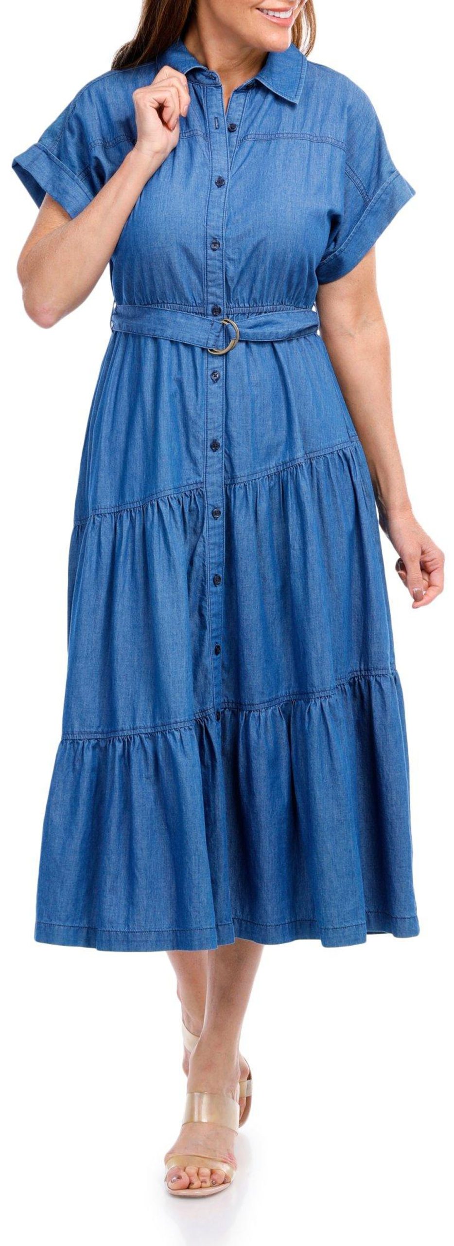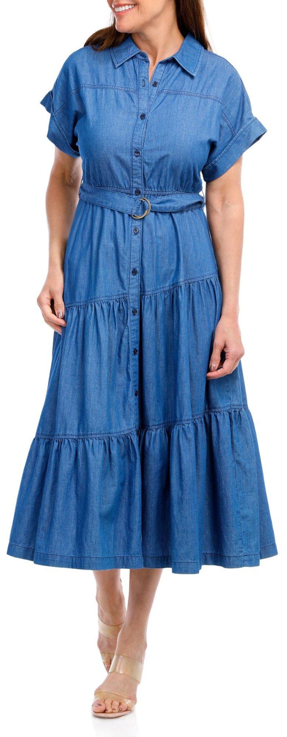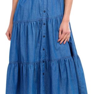 Introducing the Women’s Denim Tiered Maxi Dress, crafted from soft rayon for ultimate comfort. This stylish dress features a button-down front, a collared neckline, and a flattering belt to cinch the waist. The maxi tiered length adds a touch of elegance, making it perfect for any occasion. With a length of 43 inches, this dress offers a chic and versatile addition to your wardrobe.