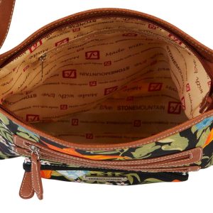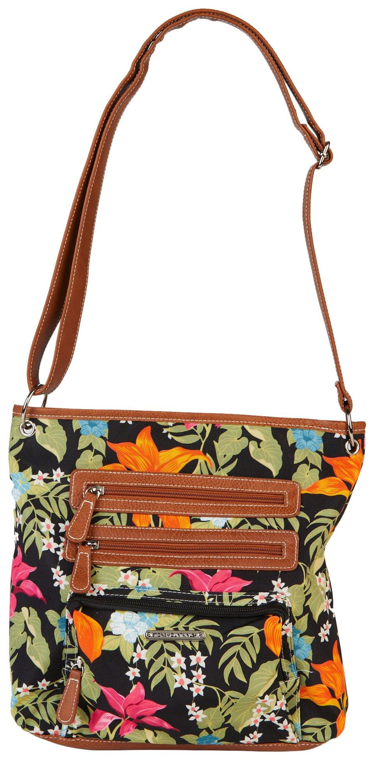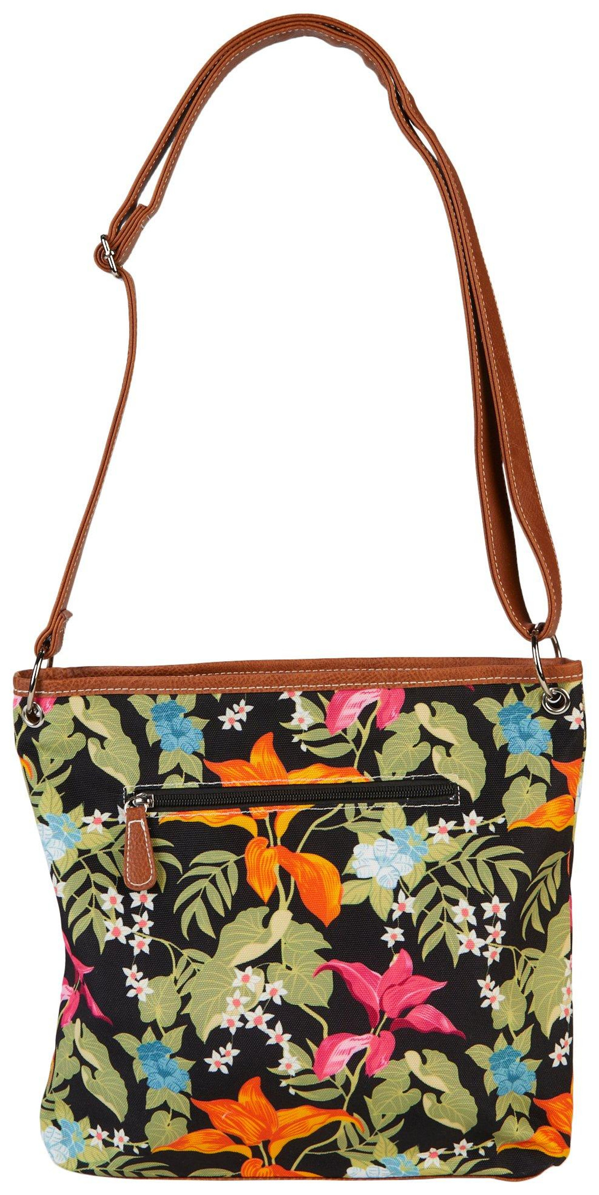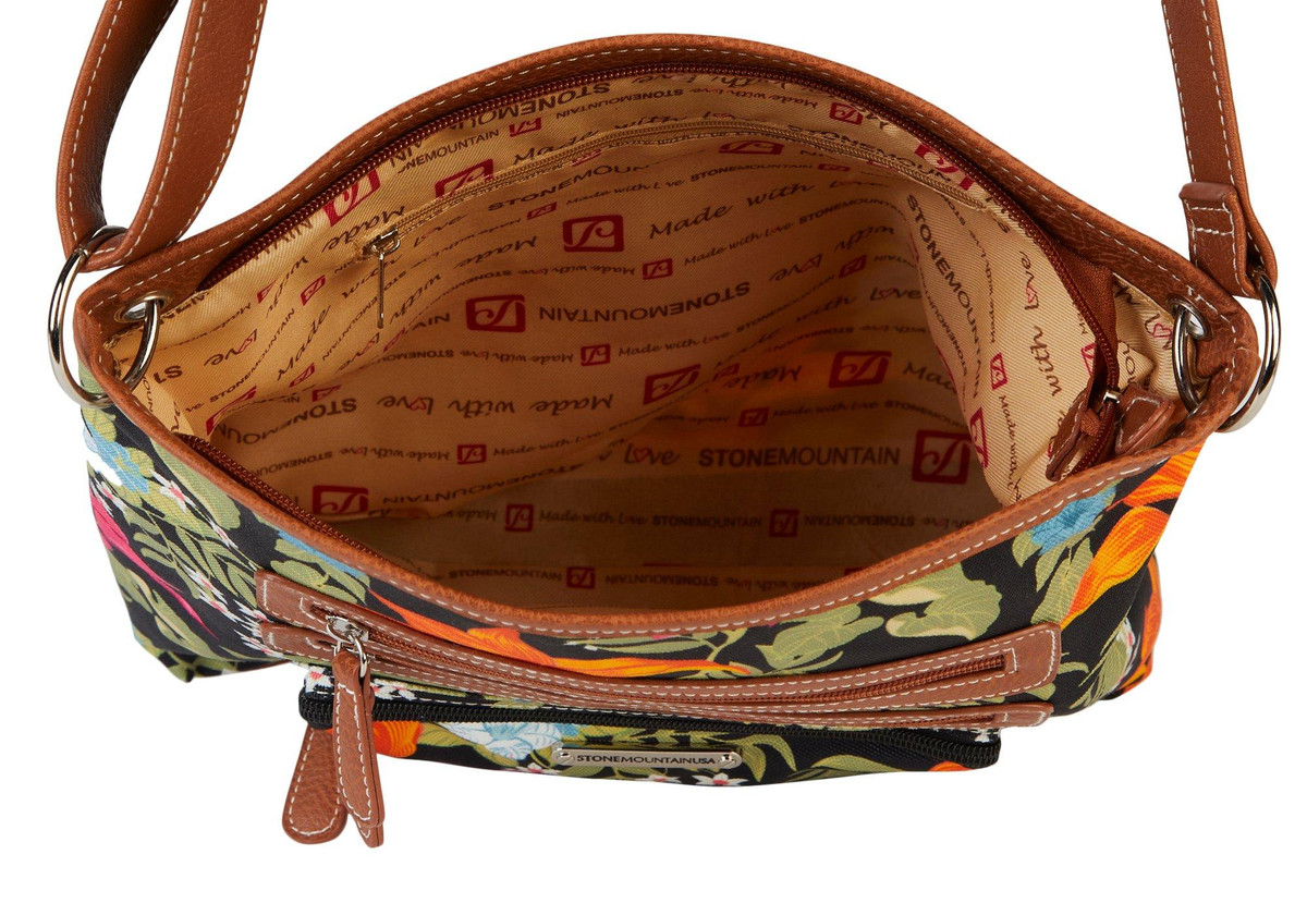The Tropical Garden Canvas Super bag from Stone Mountain features a stylish tropical exterior, chic hardware, perfect for everyday or special occasions. Features canvas w/ faux leather trim, singe top zip entry, two zip front pokctes and front zip wallet organizer w/ 6 credit card slots and cash pocket.