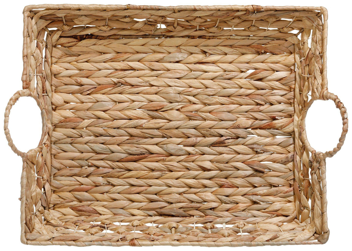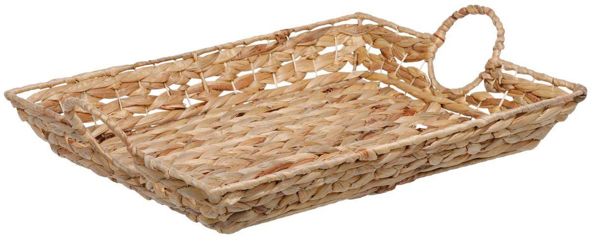 This large weaved storage tray offers a stylish and functional way to organize and display essentials. With its natural texture and sturdy design, this tray is perfect for serving, storing or decorating. Measures approximately 15 in x 21 in x 3 in, including handles.