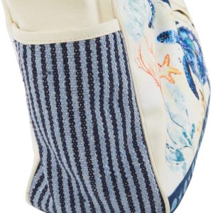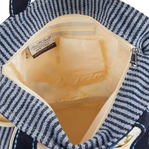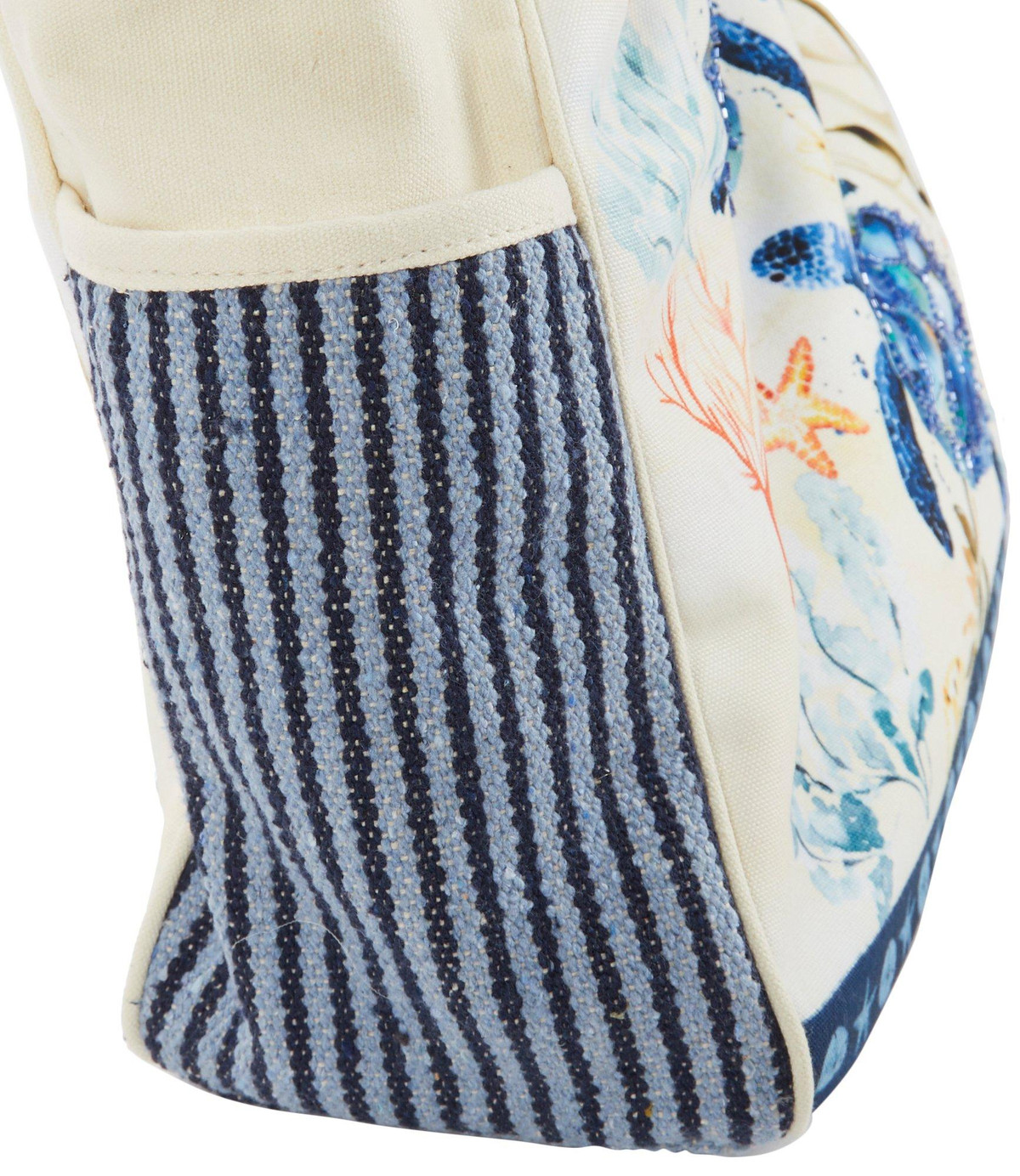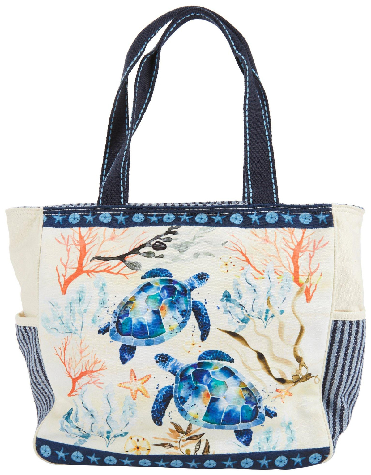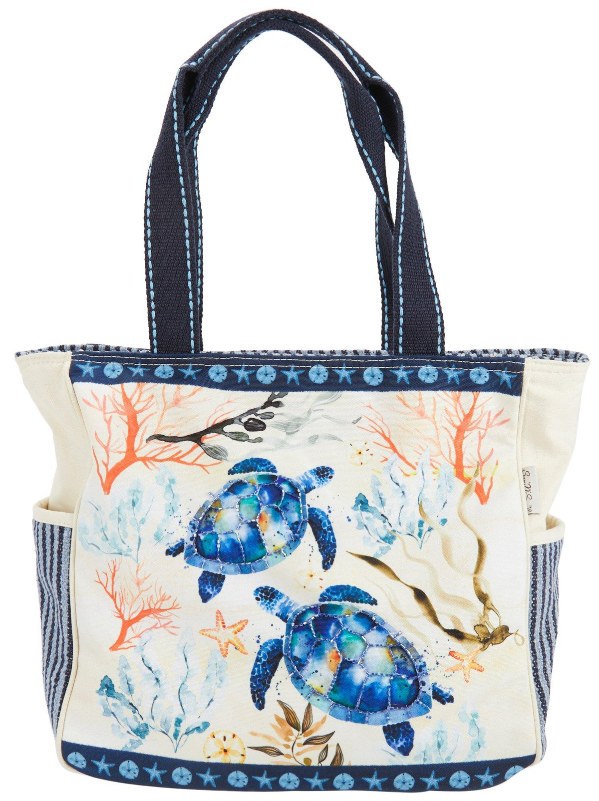 Introducing the Indigo Turtle Beach Tote Bag, crafted from sturdy canvas material and featuring a charming turtle print with bead embellishments. This stylish tote includes top handles, a top zip compartment with inner slip and zip pockets, and side slip pockets. Measuring 19 inches by 7 inches by 14 inches, it’s perfect for carrying all your beach essentials in style.