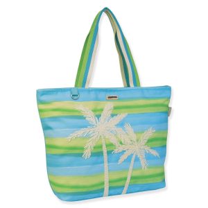 This beach tote features a fun summer watercolor print pattern on a canvas construction, dual strap handles, exterior slip pockets, a zipper closure, and an interior pocket. Perfect for the beach or lounging by the pool.
