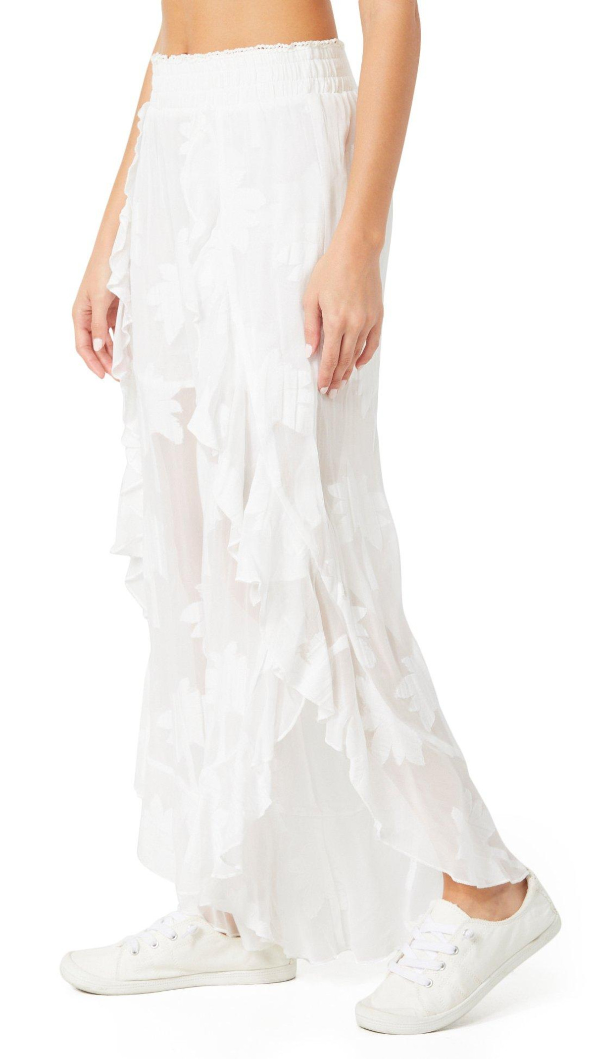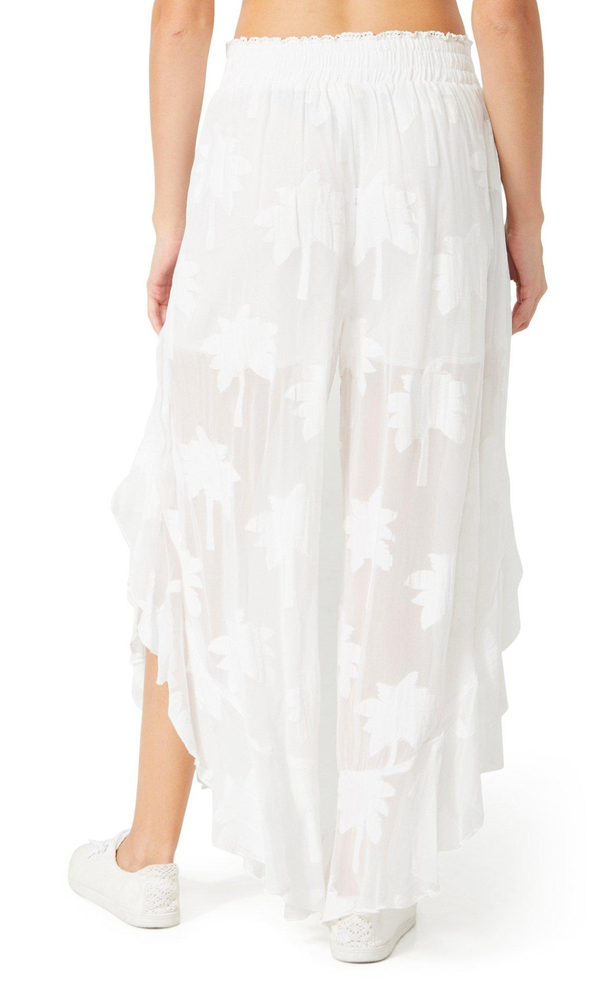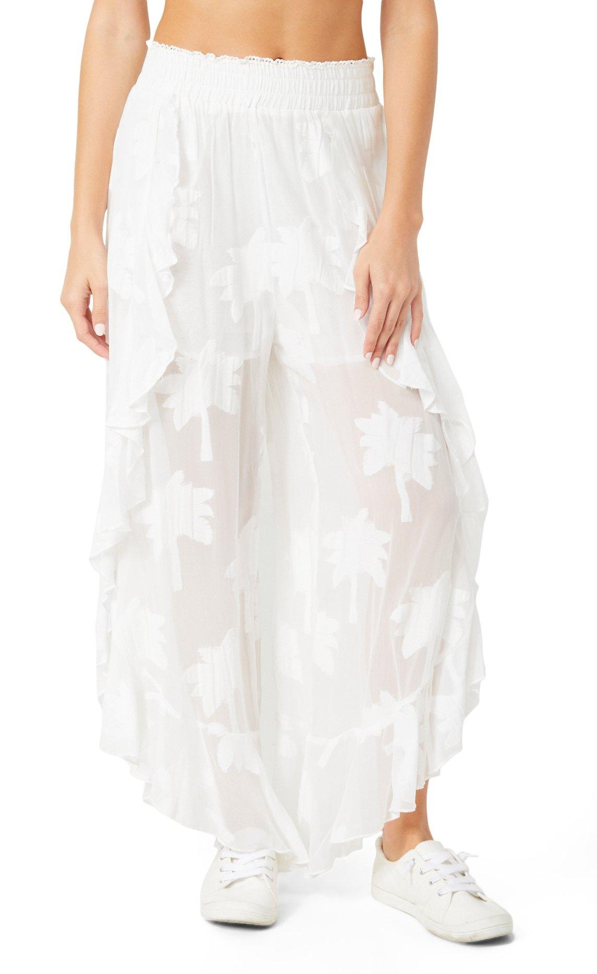 Embrace beach vibes with these Juniors Leaf Print Flowy Pants. Made from 100% cotton lining, these pants feature a charming monochrome leaf print and an elastic waistband for a comfortable fit. The flowy open front design makes them perfect as a swim cover-up, combining style and ease for your seaside adventures. Ideal for lounging or strolling along the shore, these pants are a must-have for your summer wardrobe. Fabrication is 100% viscose shell, 100% cotton lining.