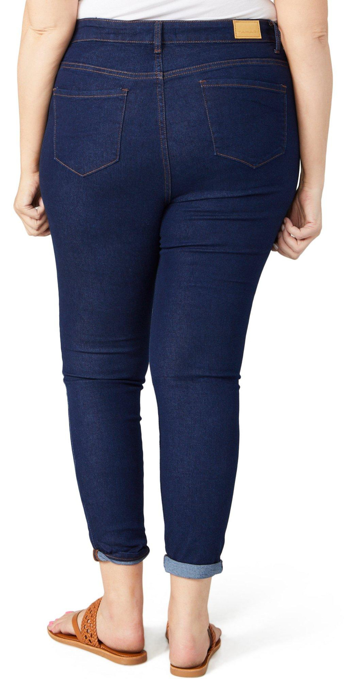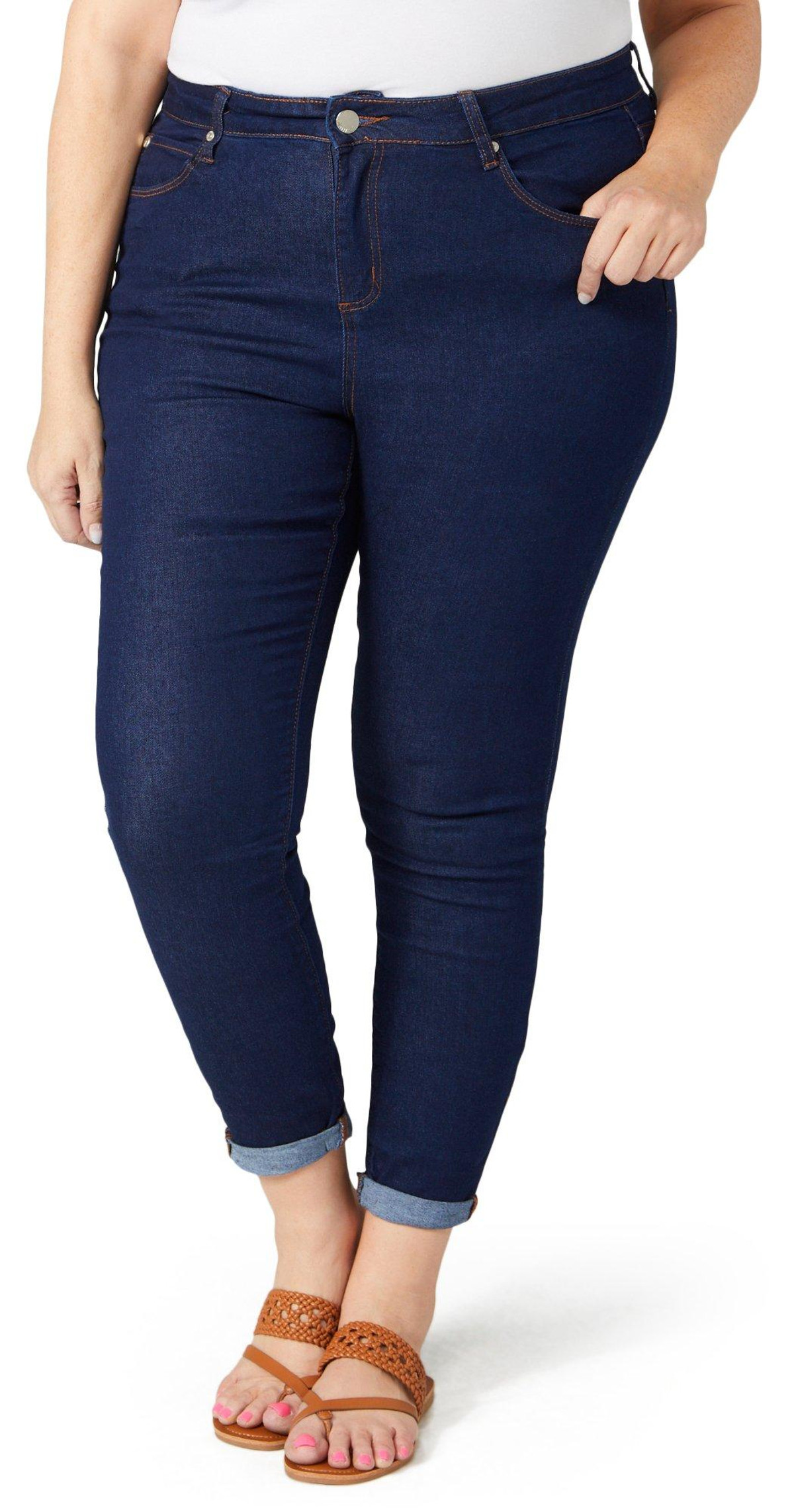 Introducing the Plus 28 in Jasmin Roll Cuff Skinny Jeans, designed for a stylish and comfortable fit. Made from a blend of cotton, polyester, rayon, and spandex, these jeans offer a perfect balance of stretch and durability. Featuring a button-fly zip closure and a classic skinny fit, these jeans are both practical and fashionable. The roll cuff hem adds a trendy touch, while the 28-inch inseam ensures a modern look. Elevate your denim collection with these versatile and chic jeans.