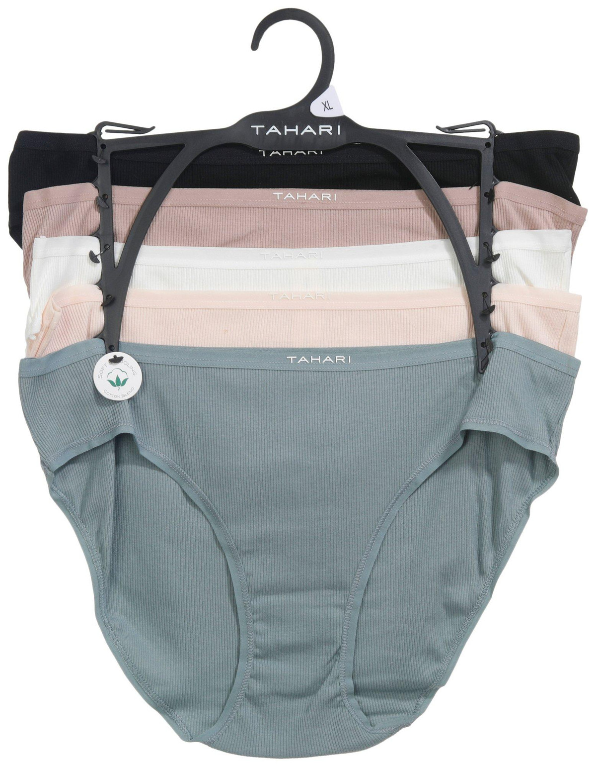 The Tahari 5-pk. Cotton Hipster women’s underwear features breathable fabric for a flattering look, and cooling comfort. Full rise and full coverage. Fabrication 100% cotton.