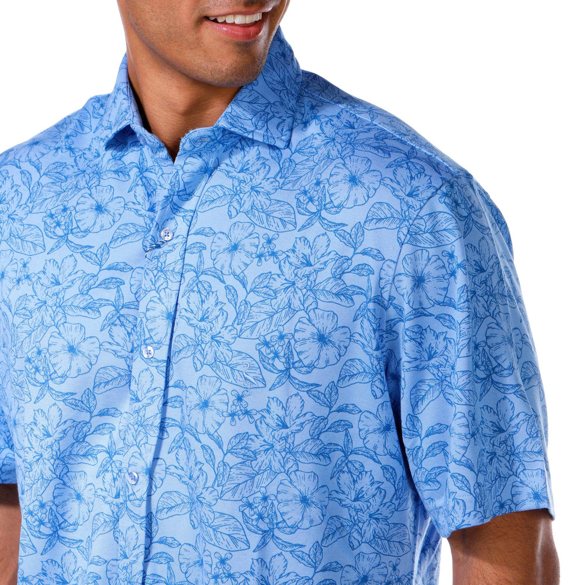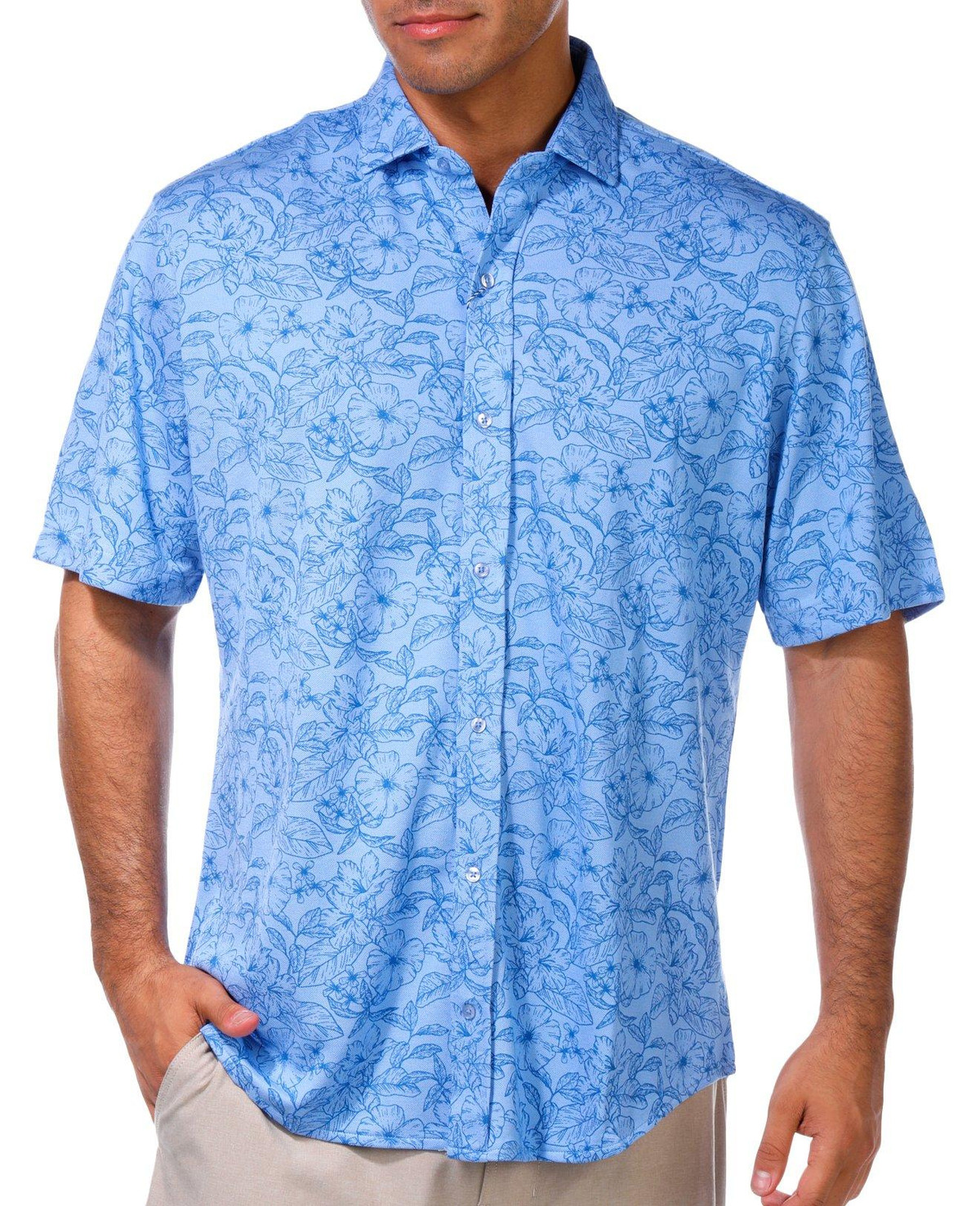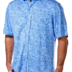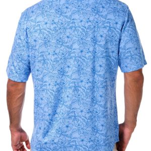 This mens golf polo features a tropical tonal floral print with short sleeves and a classic polo neckline. Crafted with performance stretch fabric, it offers breathable comfort and easy movement, making it ideal for warm days on or off the course. Fabrication 65% modal, 35% cotton.