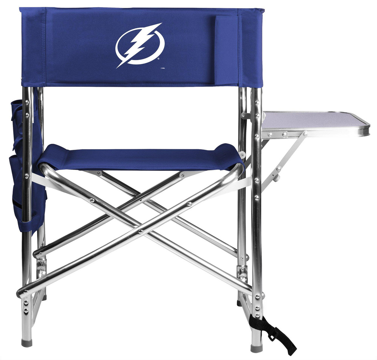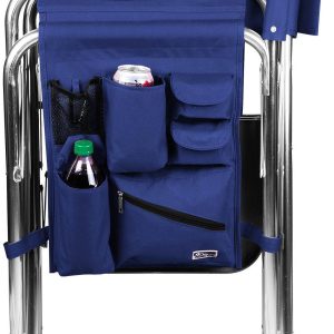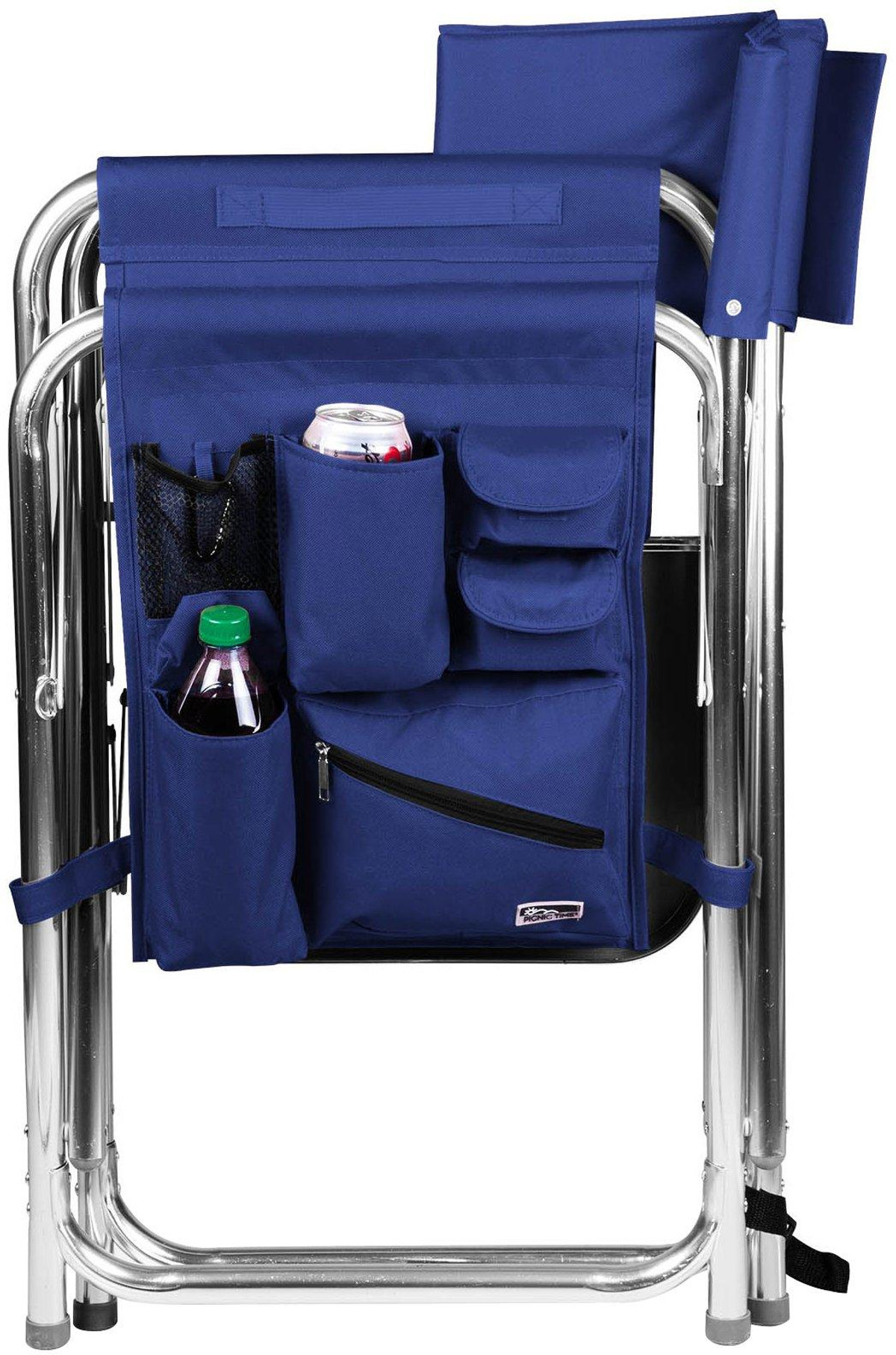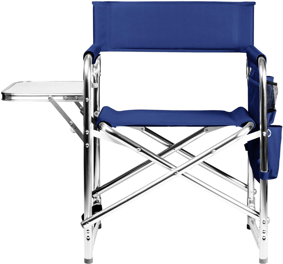The Sports Chair by Picnic Time is lightweight & foldable with a sturdy aluminum frame and adjustable shoulder strap. Chair features extra-wide seat (19.5”) and is made of durable 600D polyester. Side table folds out and holds up to 10 lbs. Maximum weight capacity: 300 lbs.