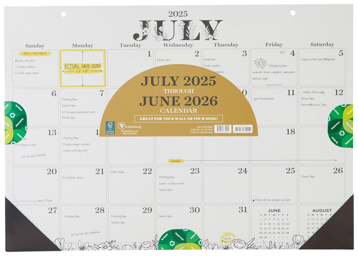 Stay organized in style with the July 2025 to June 2026 Floral Medium Desk Pad Monthly Blotter Calendar, featuring spacious monthly grids and vibrant floral accents. Designed to lie flat on desks for easy planning and quick reference. Ideal for office, home workspace, or academic scheduling. Measures approximately 17 in x 12 in.