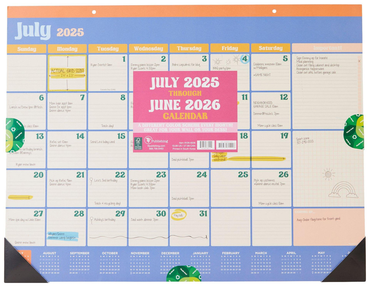Brighten your planning routine with the July 2025 June 2026 Sherbet Large Desk Pad Monthly Blotter Calendar, designed with cheerful color accents. Each page offers generous writing space for appointments, deadlines, and notes. Perfect for desks in offices, classrooms, or home workspaces. Measures approximately 17 in x 12 in.