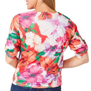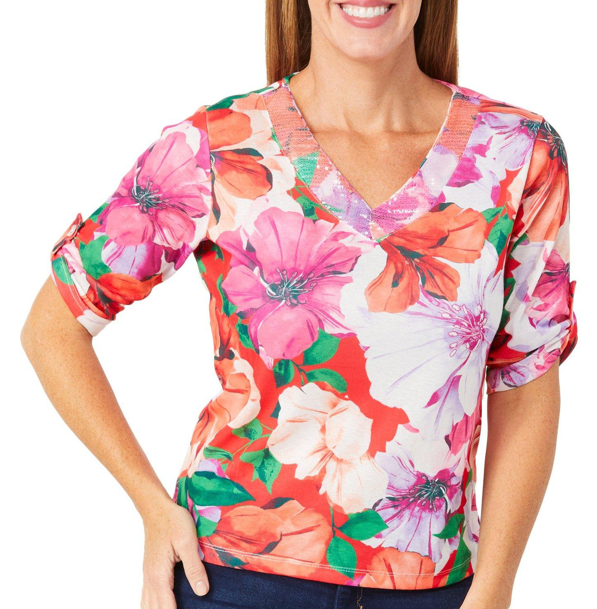 This women’s top features a flattering V-neck and three-quarter sleeves for a balanced, elegant look. Adorned with a floral pattern and shimmering sequins along the neckline, it adds a touch of sparkle and charm. Perfect for dressing up your everyday style with a hint of glamour. Fabrication is 100% polyester.