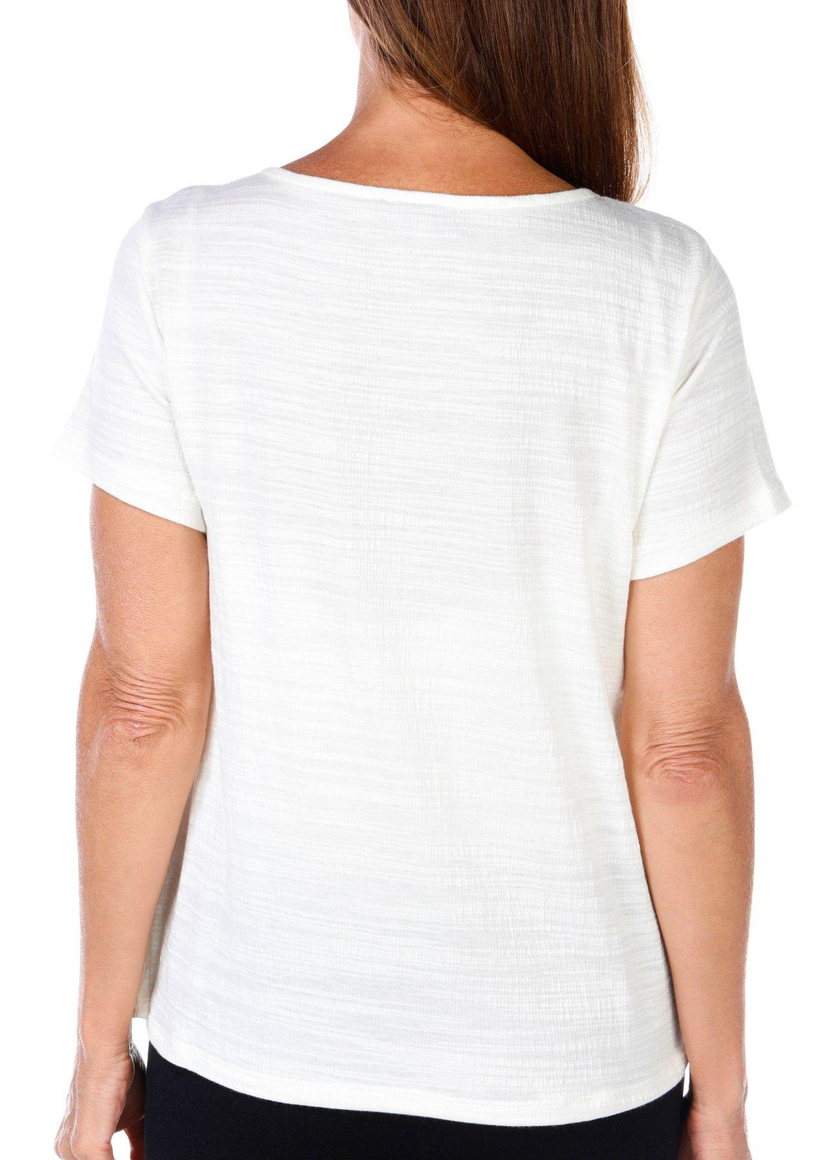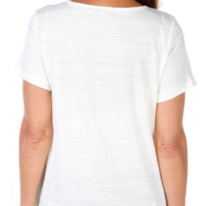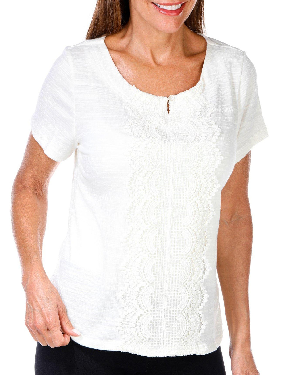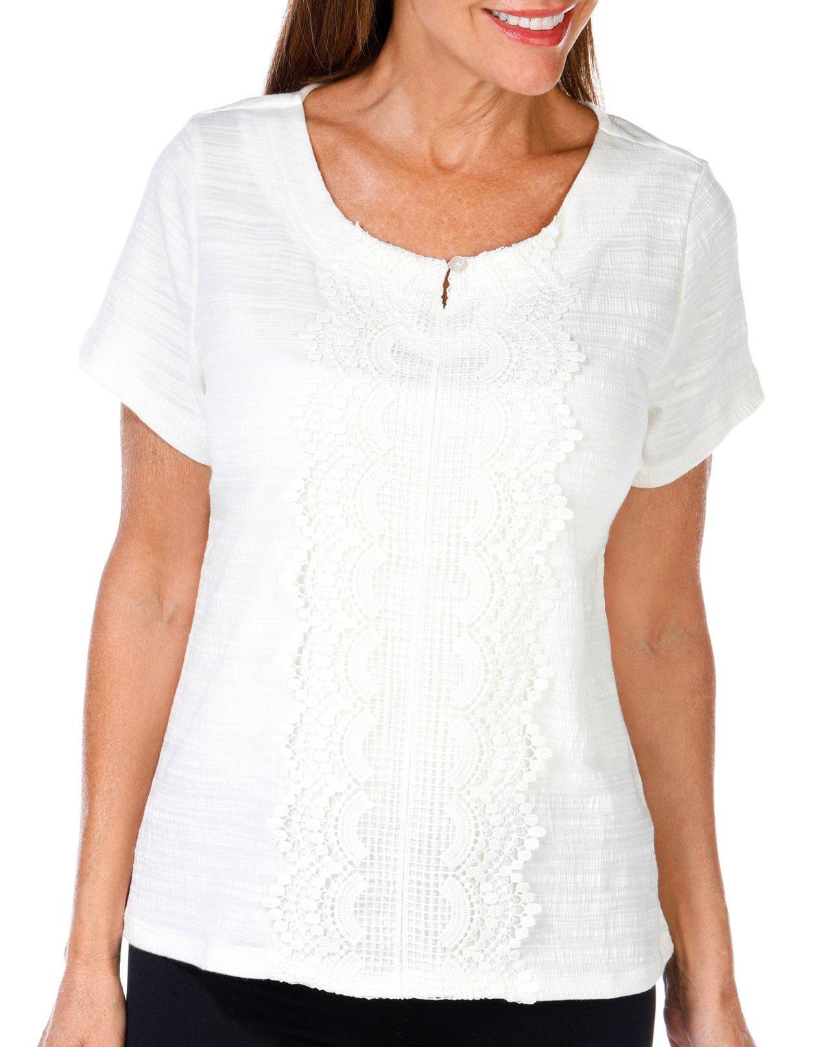Add a delicate touch to your look with this Women’s Short Sleeve Lace Neck Top. Featuring a solid color and short sleeves, its accented with a lace design on the chest for a soft, feminine finish. Ideal for both casual and dressy occasions. Fabrication 71% polyester, 28% rayon, 1% spandex