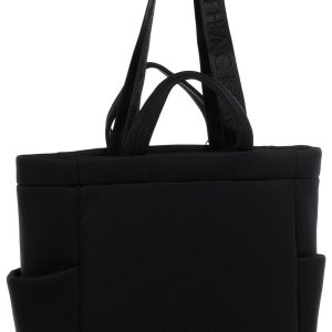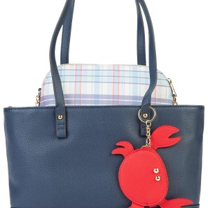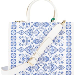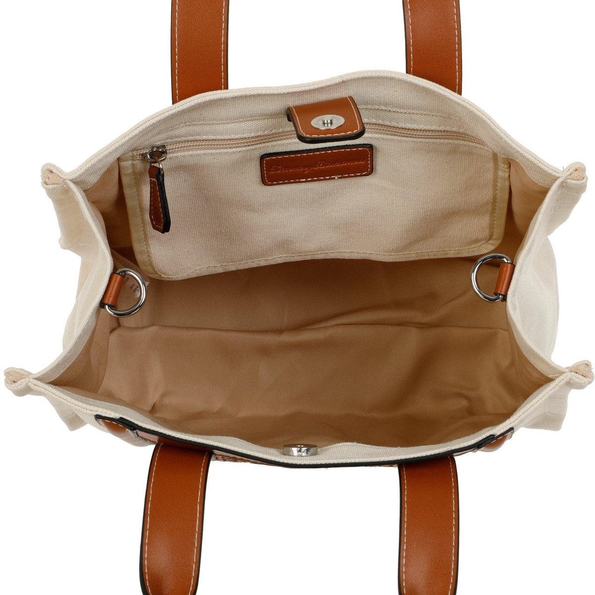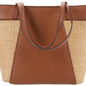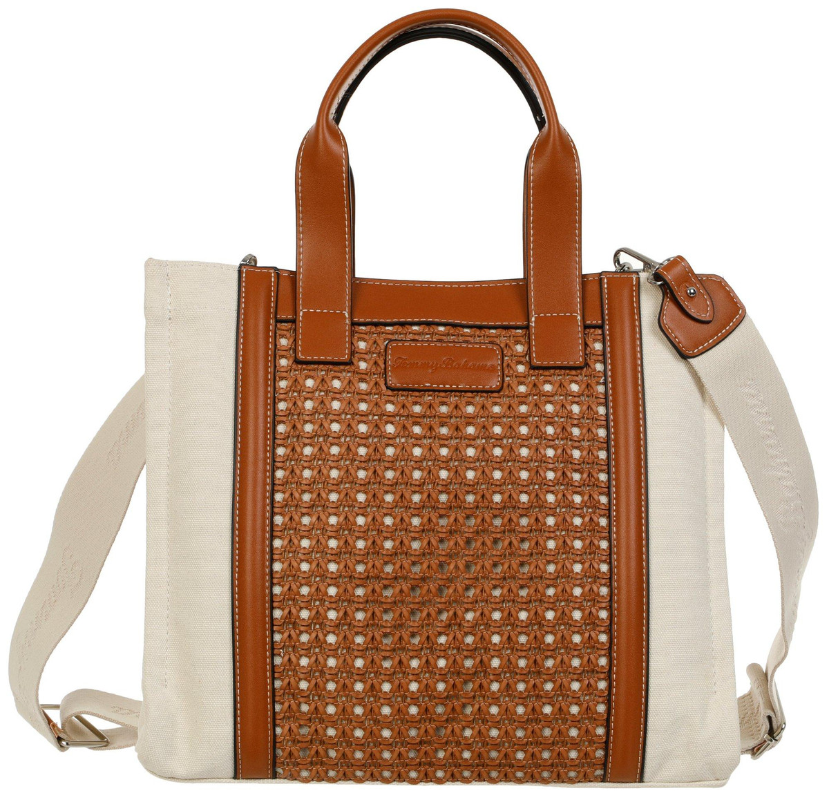 Introducing our Tommy Bahama Canvas Tote Bag, featuring a chic faux leather woven design on the front. It includes top handles, a crossbody strap, silver-tone hardware, and a top snap button compartment with an inner zip pocket. Measuring 12 in x 5 in x 12 in, this tote combines practicality with sophisticated style.