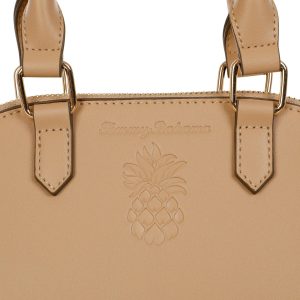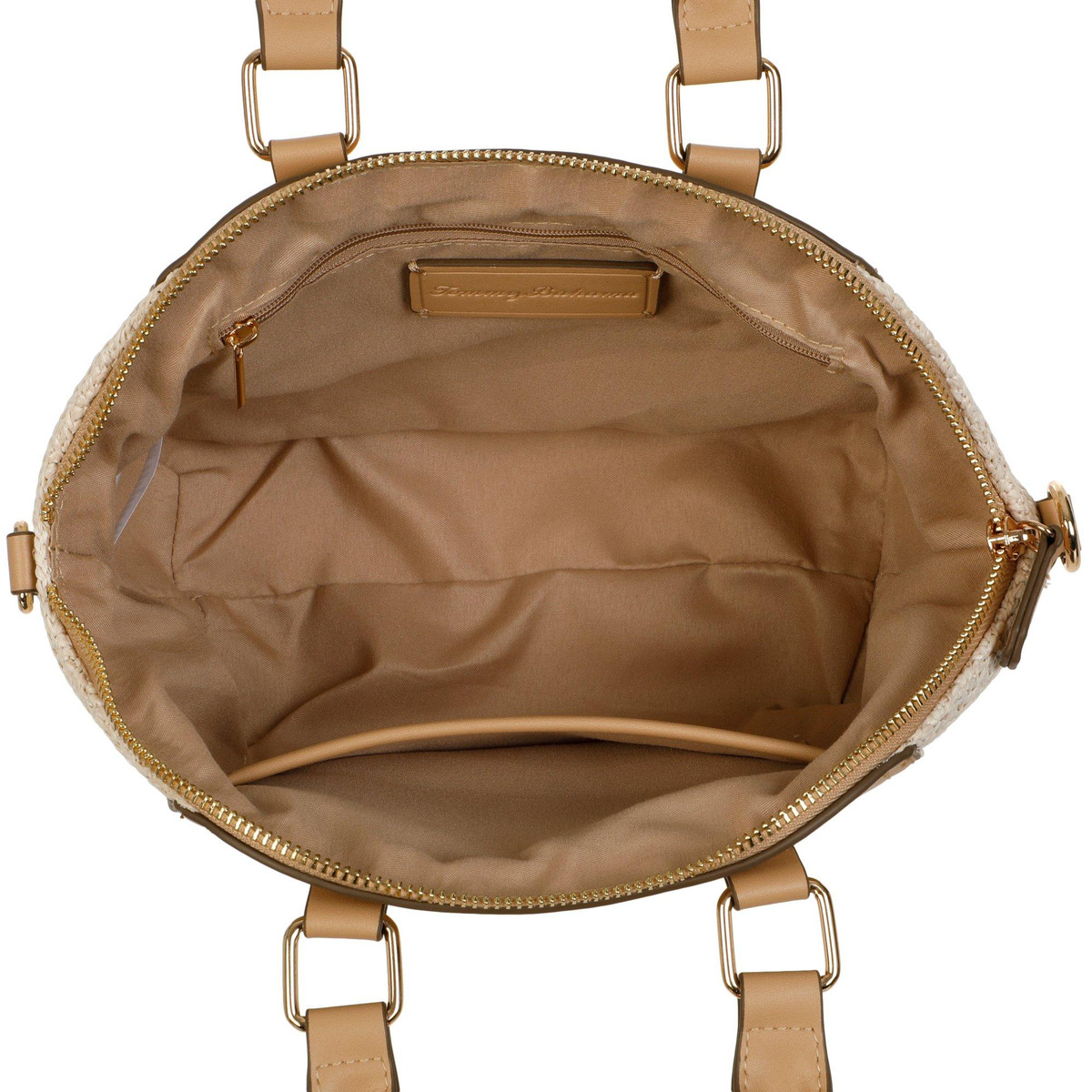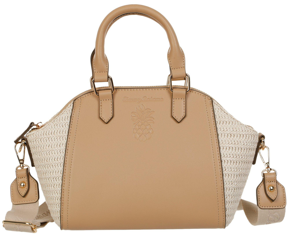 Introducing our Tommy BahamaDebossed Logo Satchel, a perfect blend of sophistication and practicality. This stylish satchel features elegant woven straw details on the sides, adding a unique touch to its design. It comes with an adjustable crossbody strap and top handles for versatile carrying options. The top zip compartment includes inner slip and zip pockets, providing ample storage for your essentials. Accented with gold-tone hardware, this satchel measures 12 inches by 4 inches by 7 inches.