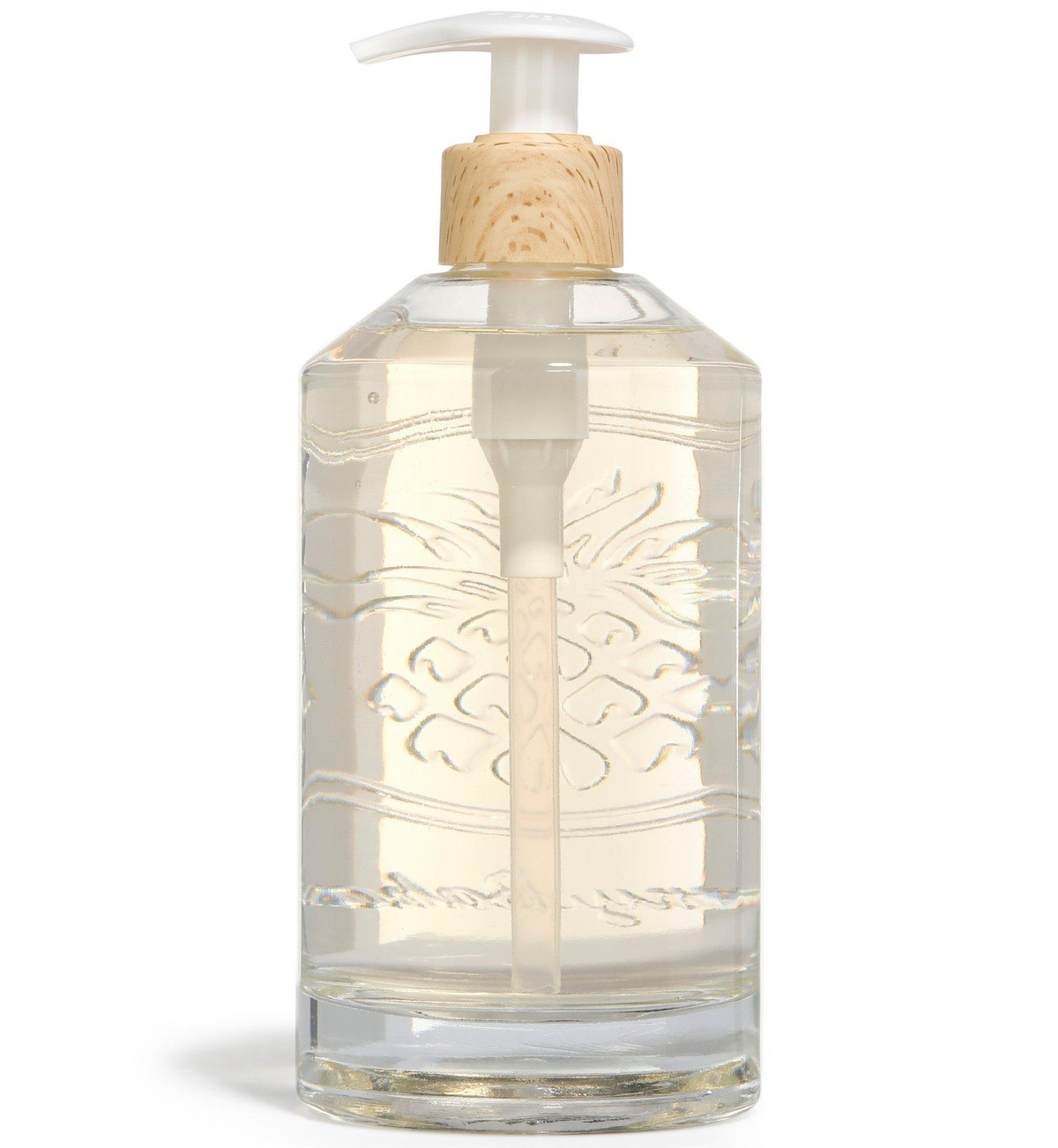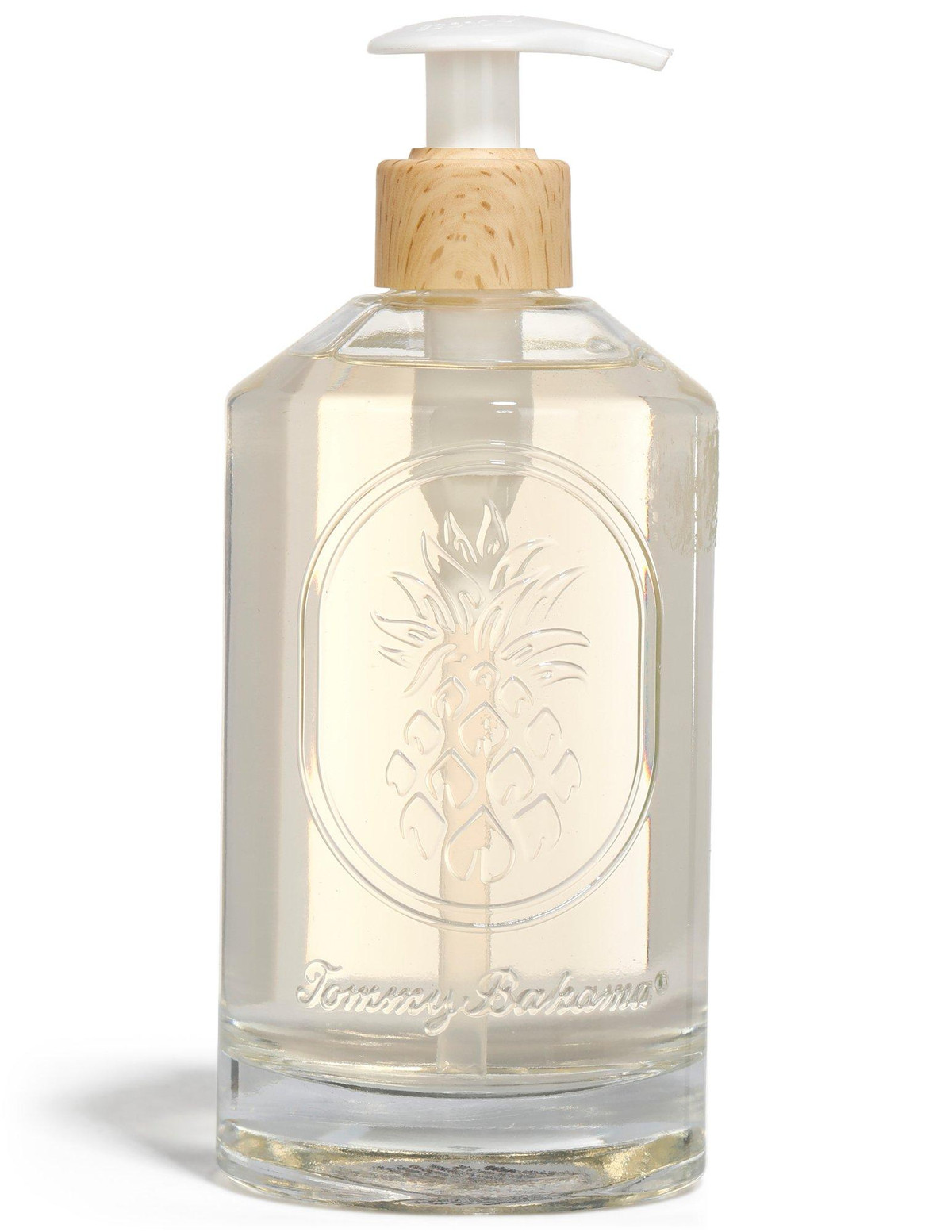 This premium hand soap comes in a substantial glass pump bottle with front pineapple design. Soap is formulated with aloe vera, shea butter, essential oils and mild cleansers. Bottle contains 14 fl.oz.
