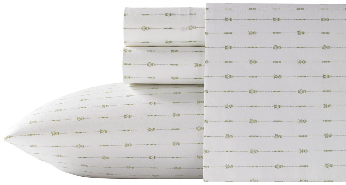 Tommy bahama is known for their breezy, coastal style, and the pineapple pinstripe sheet set by Tommy Bahama continues that tradition. Sheets feature a playful touch that has a stripe of pineapples on a field of white. Each piece in this set is made from 100% cotton percale with a 200 thread count. The fitted sheet has a 15-inch elastic opening that’s going to give you a snug fit on mattresses of any depth. Set includes one flat sheet, one fitted sheet, and two pillow cases.