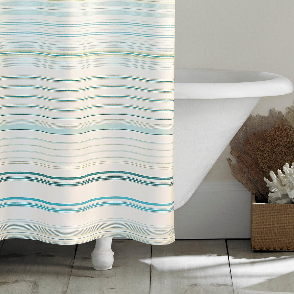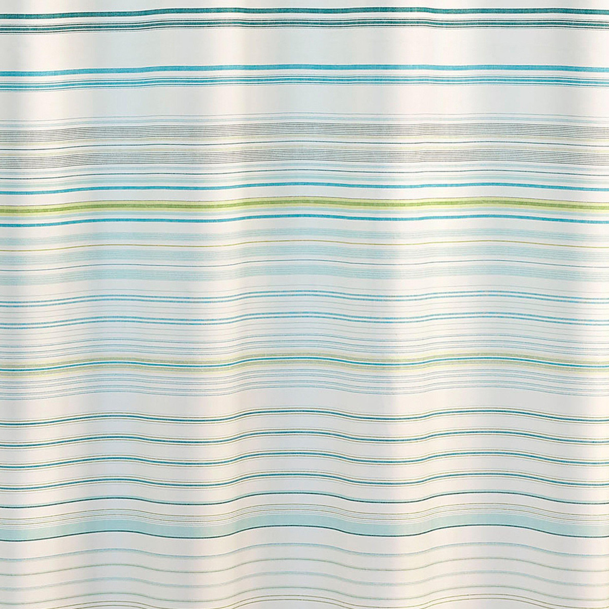 The La Scala Breezer Shower Curtain by Tommy Bahama calls up visions of a tropical paradise where it is always sunny and life is good. A casual cabana stripe in warm tones of green and aqua on an ivory ground makes a relaxed, yet elegant statement for your bathroom oasis. Shower curtain measures 72l x 72w and is constructed with 100% cotton. Curtain is machine washable for easy care. Liner and hooks not included.