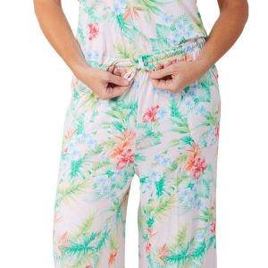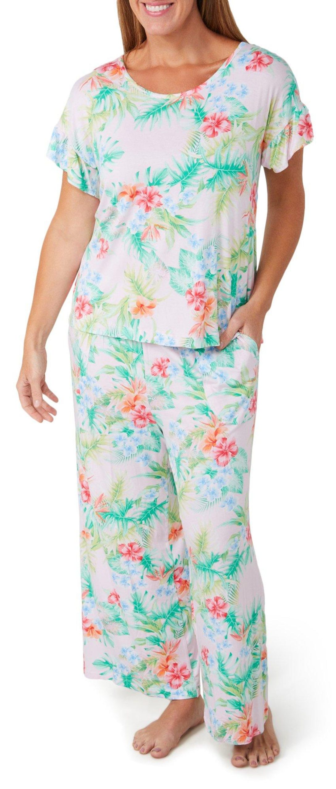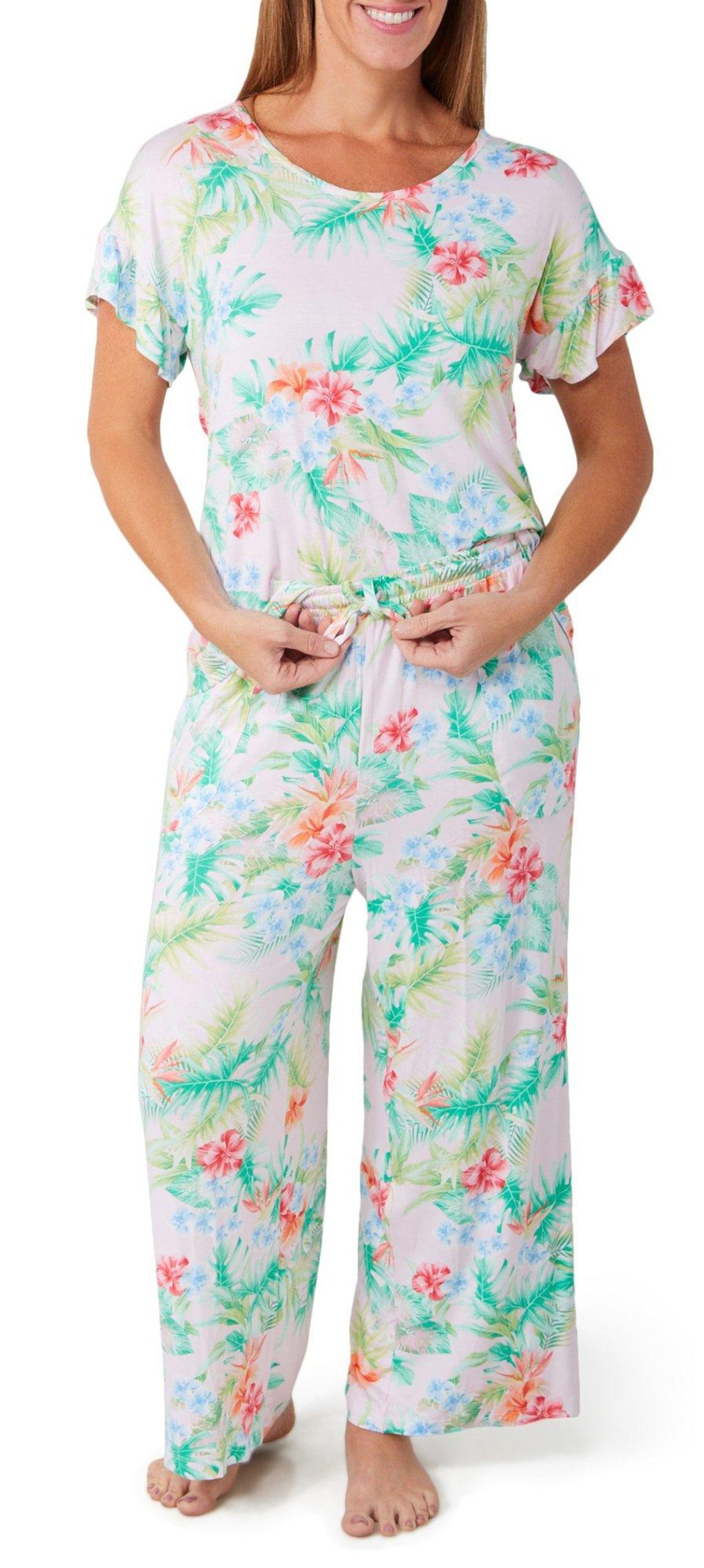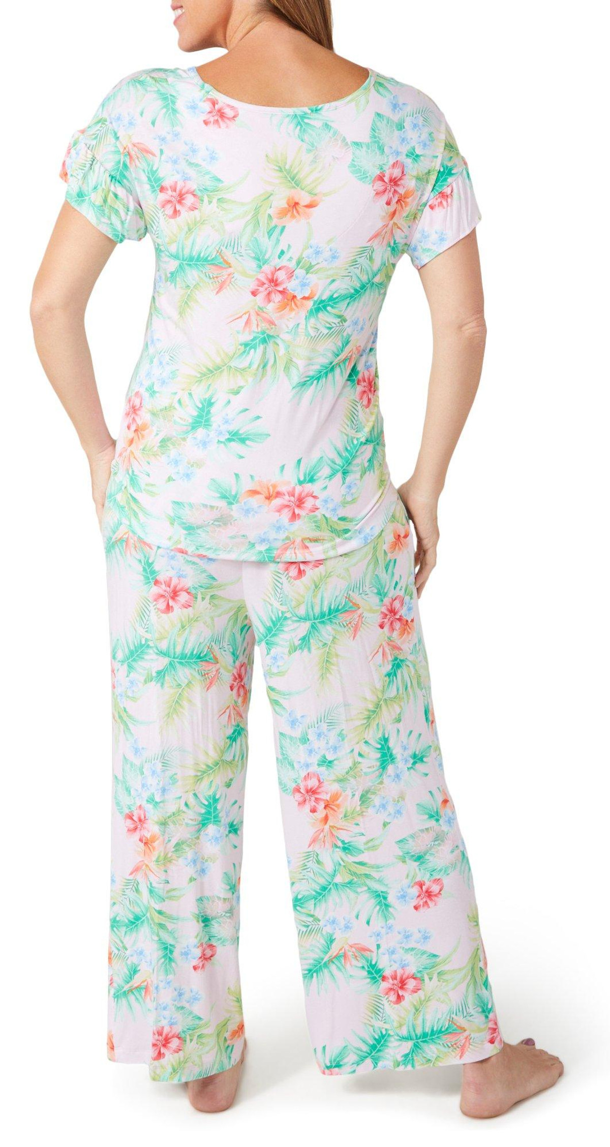 Cozy up in effortless style with this 2 piece pajama set, featuring a soft short sleeve top and matching long bottoms. Designed for all night comfort and all day lounging, the relaxed fit and coordinated look make it a go to for laid-back days and restful nights. Fabrication is 95% rayon, 5% spandex.