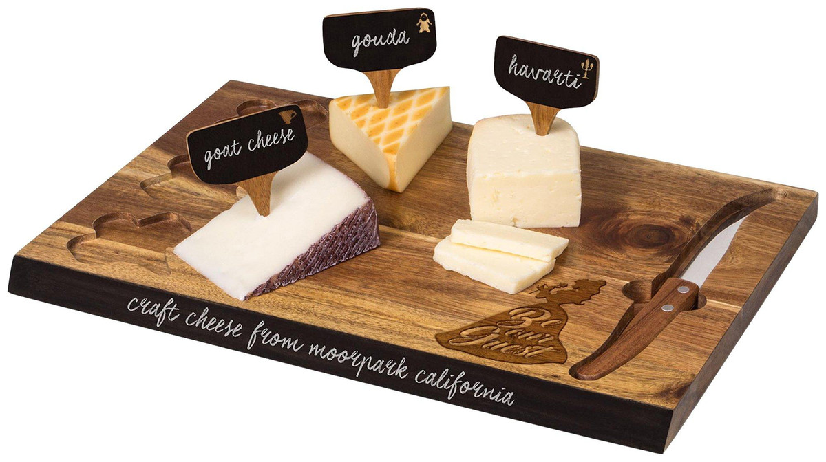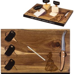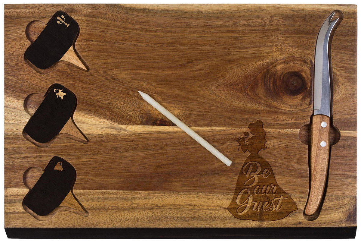 Cutting board and cheese tools set includes cutting board, one cheese knife, three cheese markers, and one soapstone pencil. Set features decoration of Beauty and the Beast and cutouts to fit knife & cheese markers. Measures: 15 ” x 10 x .8.