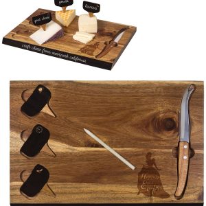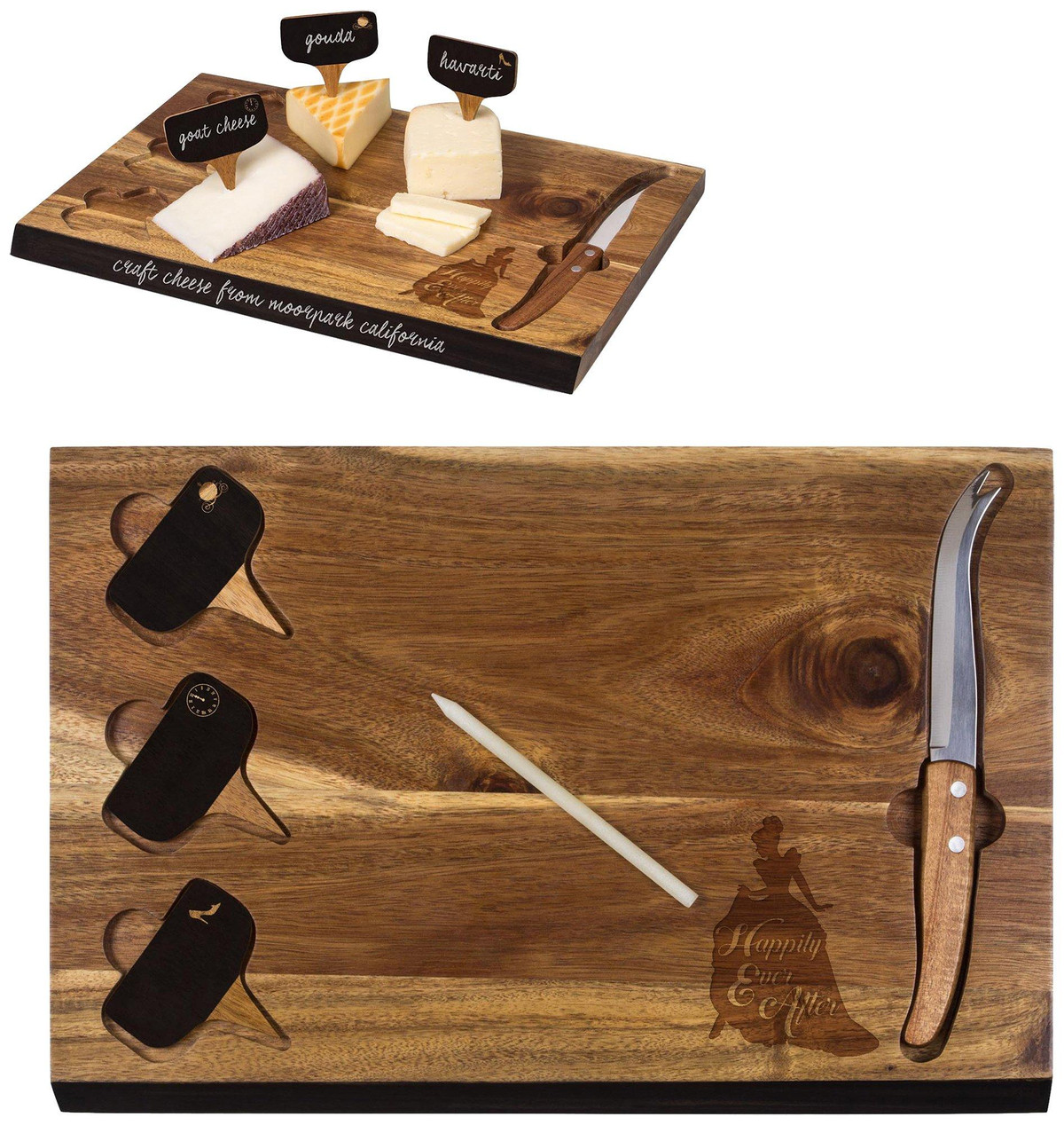 Cutting board and cheese tools set includes cutting board, one cheese knife, three cheese markers, and one soapstone pencil. Set features decoration of Cinderella and cutouts to fit knife & cheese markers. Measures: 15 x 10 x .8.