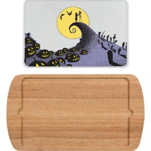 Bright and refined, the Billboard Glass Top Serving Tray is a rubberwood cutting board with a removable and customizable glass plate top that features decoration of Disney Nightmare Before Christmas Jack & Sally . Glass is tempered and measures: 14 x 9.875 x .2 inches. Rubberwood base measures 17.5 x 9.75 x 7.55 inches.
