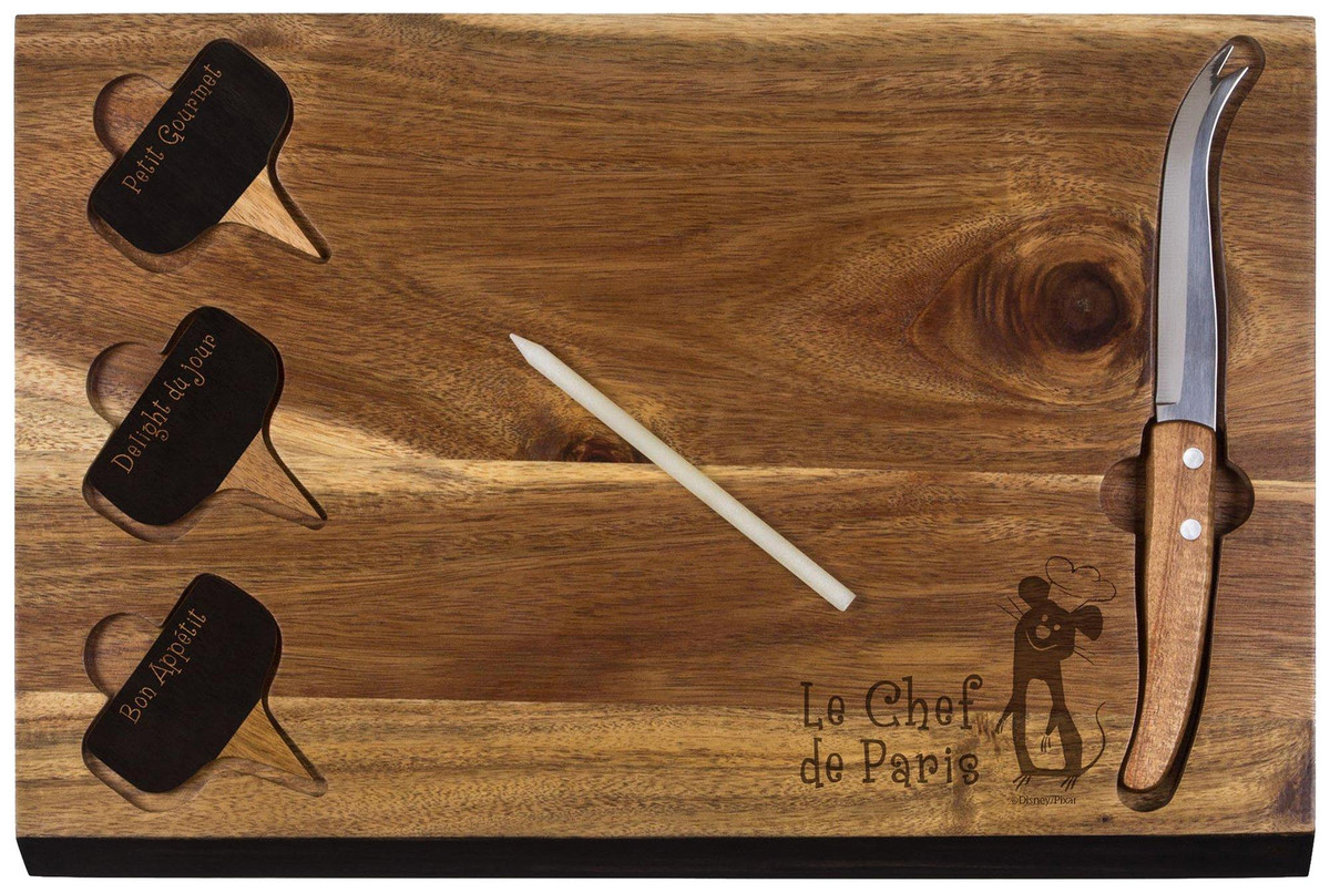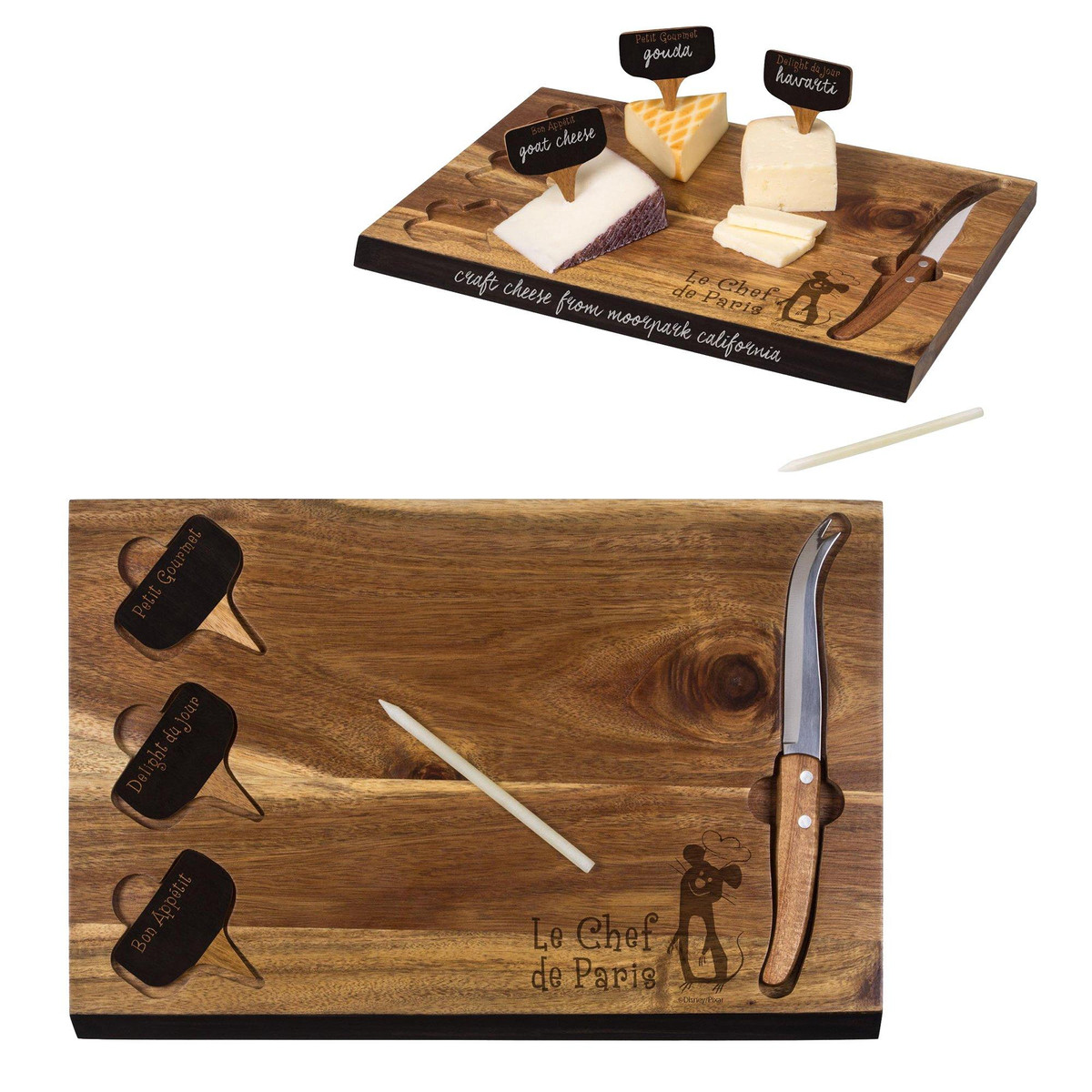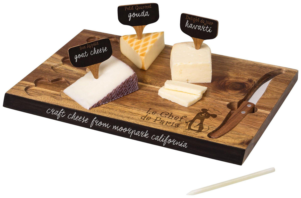 Cutting board and cheese tools set includes cutting board, one cheese knife, three cheese markers, and one soapstone pencil. Set features decoration of Ratatouille and cutouts to fit knife & cheese markers. Measures: 15 x 10 x .8.