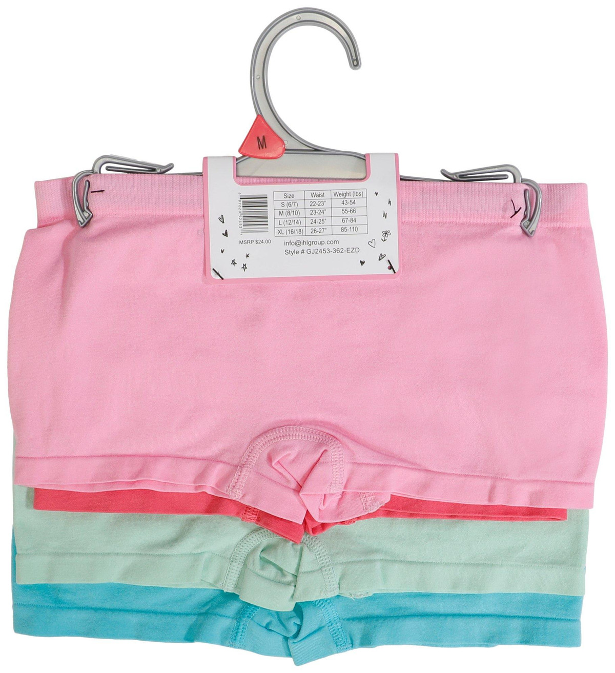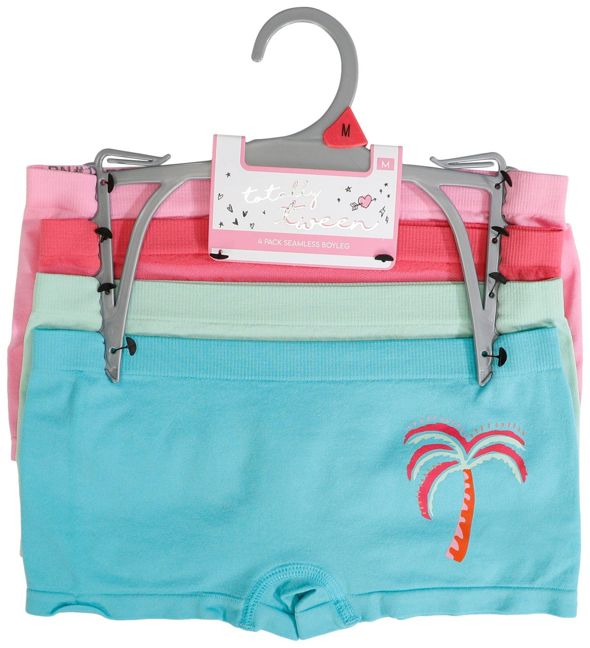 Enjoy comfortable coverage with the Girls 4 Pk Seamless Boyleg Panty Underwear. Designed in solid colors with one featuring a palm tree detail, these boyshort style panties offer a smooth, flexible fit with seamless construction for irritation free wear. Ideal for everyday use. Fabrication is 90% polyamide, 10% elastane.